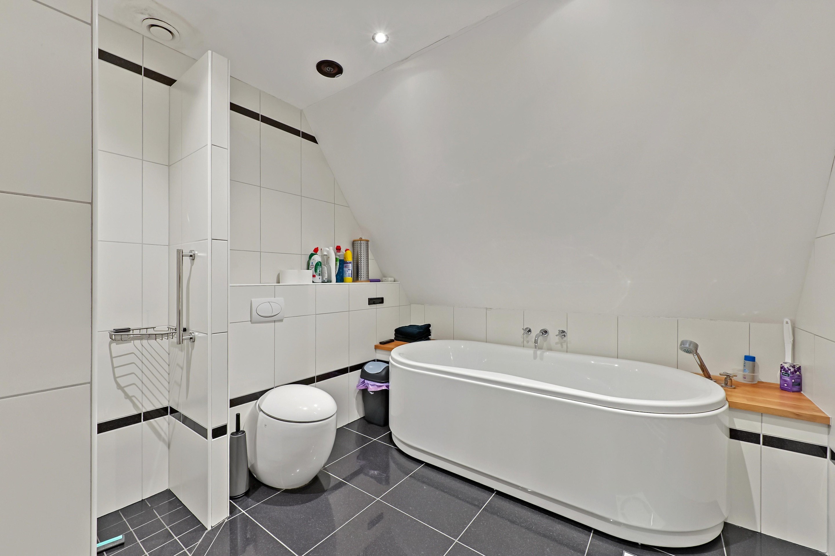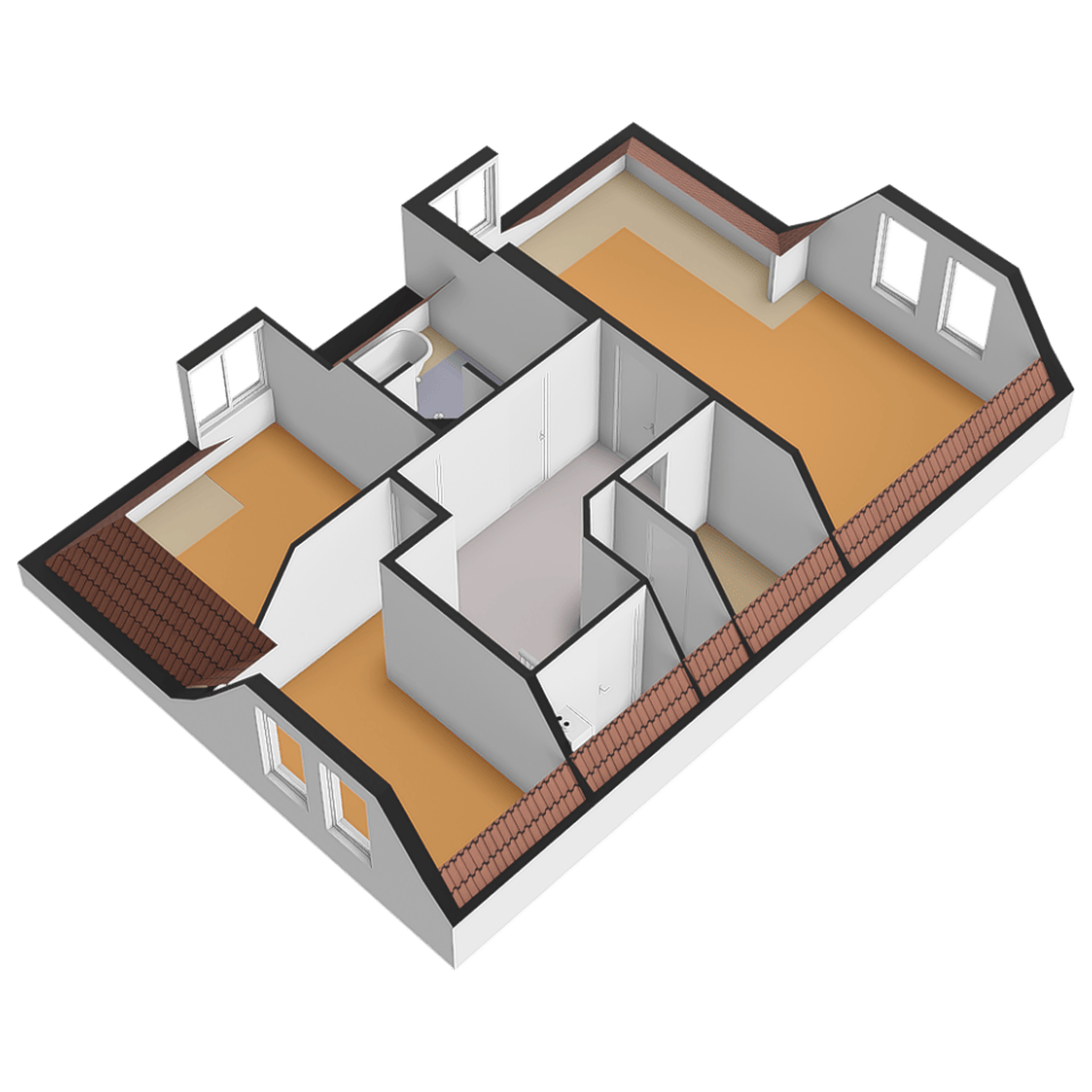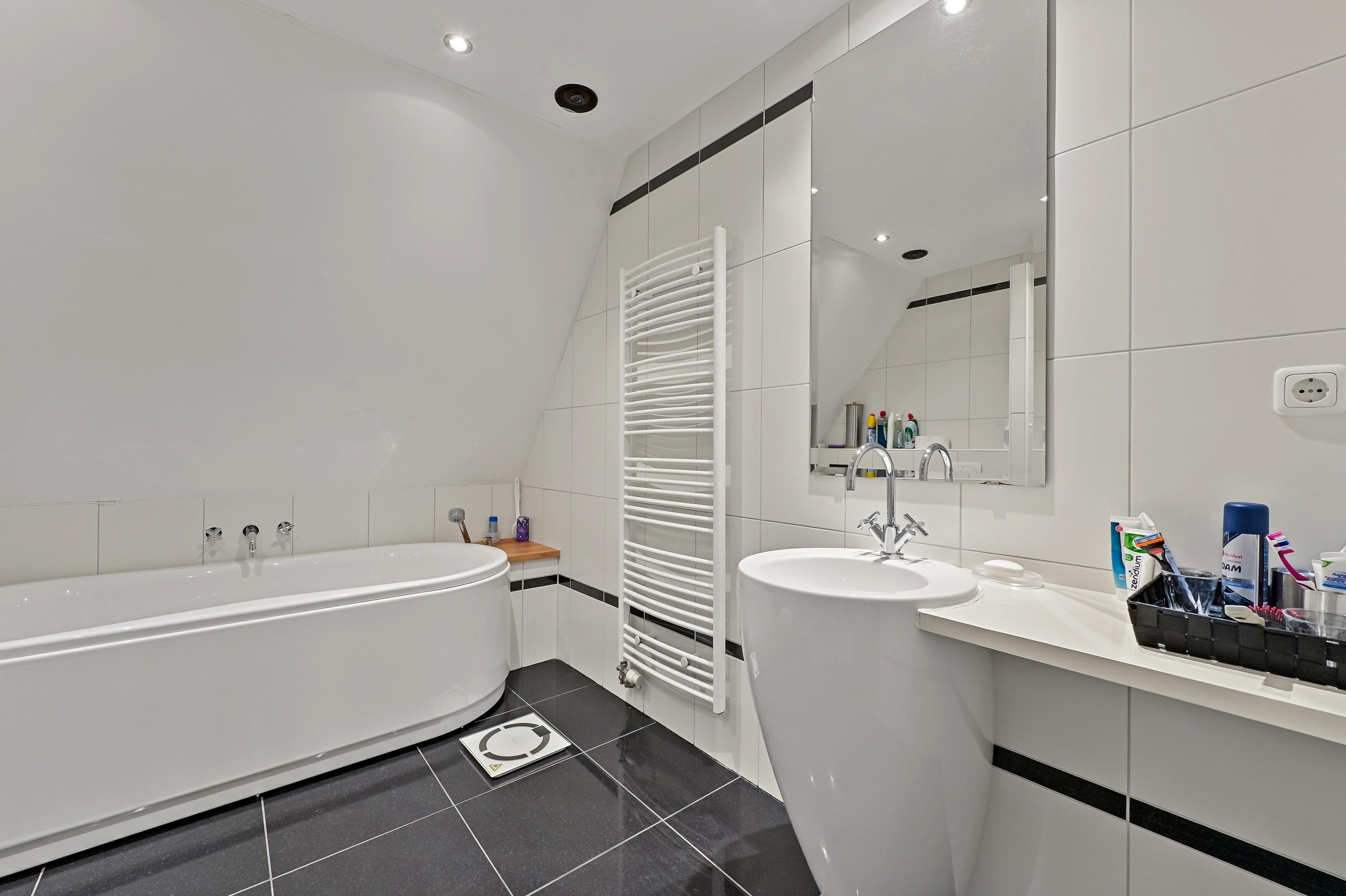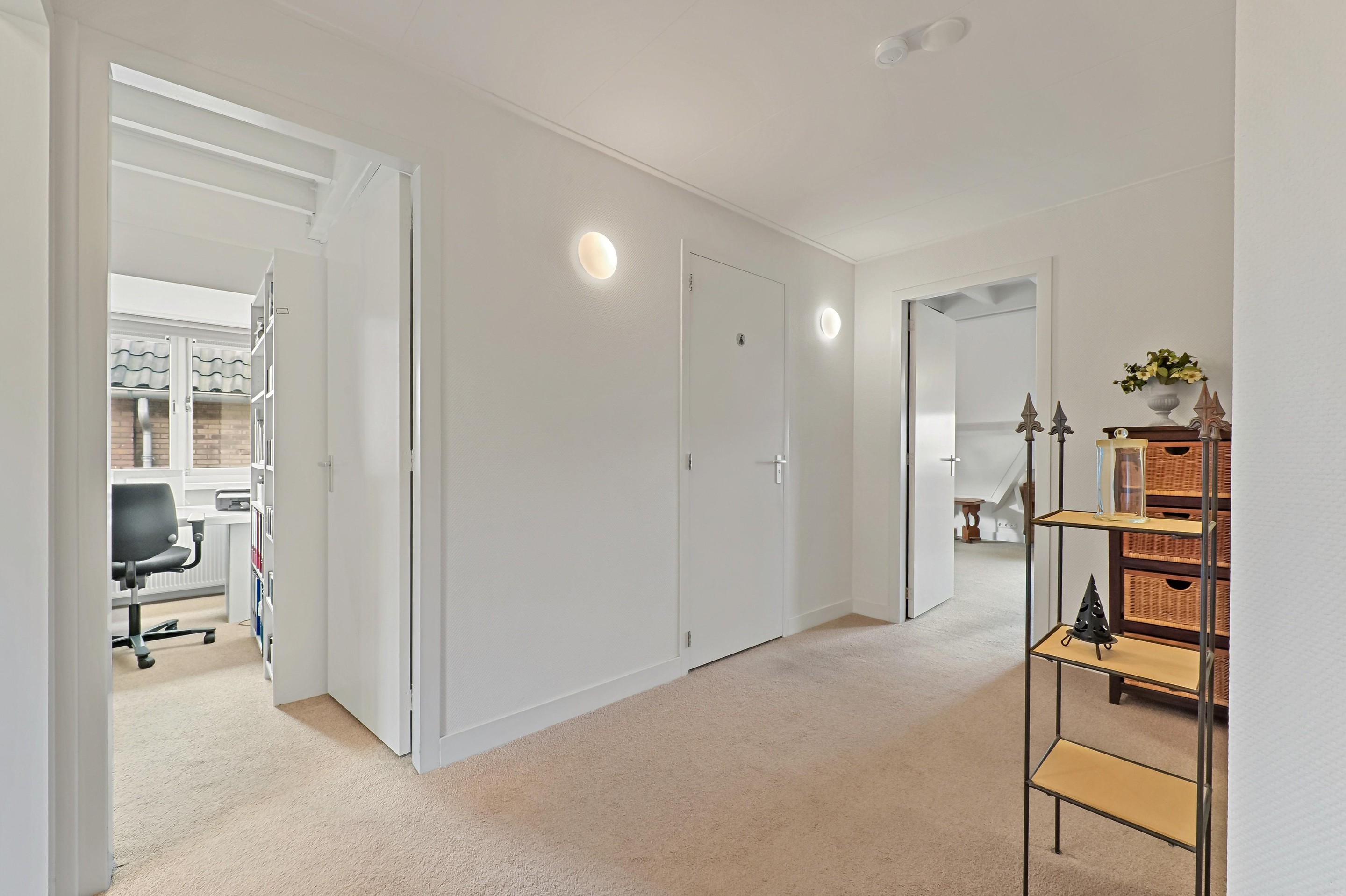 Op de bovenverdieping zijn drie slaapkamers aanwezig. De overloop bevindt zich in het midden van de woning. Op de overloop is een zeer ruime inloopkast aanwezig. Aan de voorzijde van de woning bevinden zich twee slaapkamers. Dankzij de bijzondere vorm van de kap zijn er diverse hoogtes in de woning aanwezig. Bij de voorste kamer is de hoge nok mooi zichtbaar gemaakt. De andere slaapkamer beschikt over een dakkapel aan de zijkant van de woning. Over een groot gedeelte van het huis is een vliering aanwezig, en is toegankelijk via een losse trap in een van de kamers aan de voorzijde. De badkamer is ruim van opzet en voorzien van een vrijstaand ligbad, een tweede toilet, een inloopdouche, designradiator en een stijlvolle wastafel. De hoofdslaapkamer is aan de achterzijde van de woning en is maar liefst 26,4 m2 groot. Ook in deze fraaie ruimte is de hoge nok zichtbaar en dankzij twee ramen in de achtergevel én een dakkapel aan de zijkant komt er veel licht de ruimte binnen.