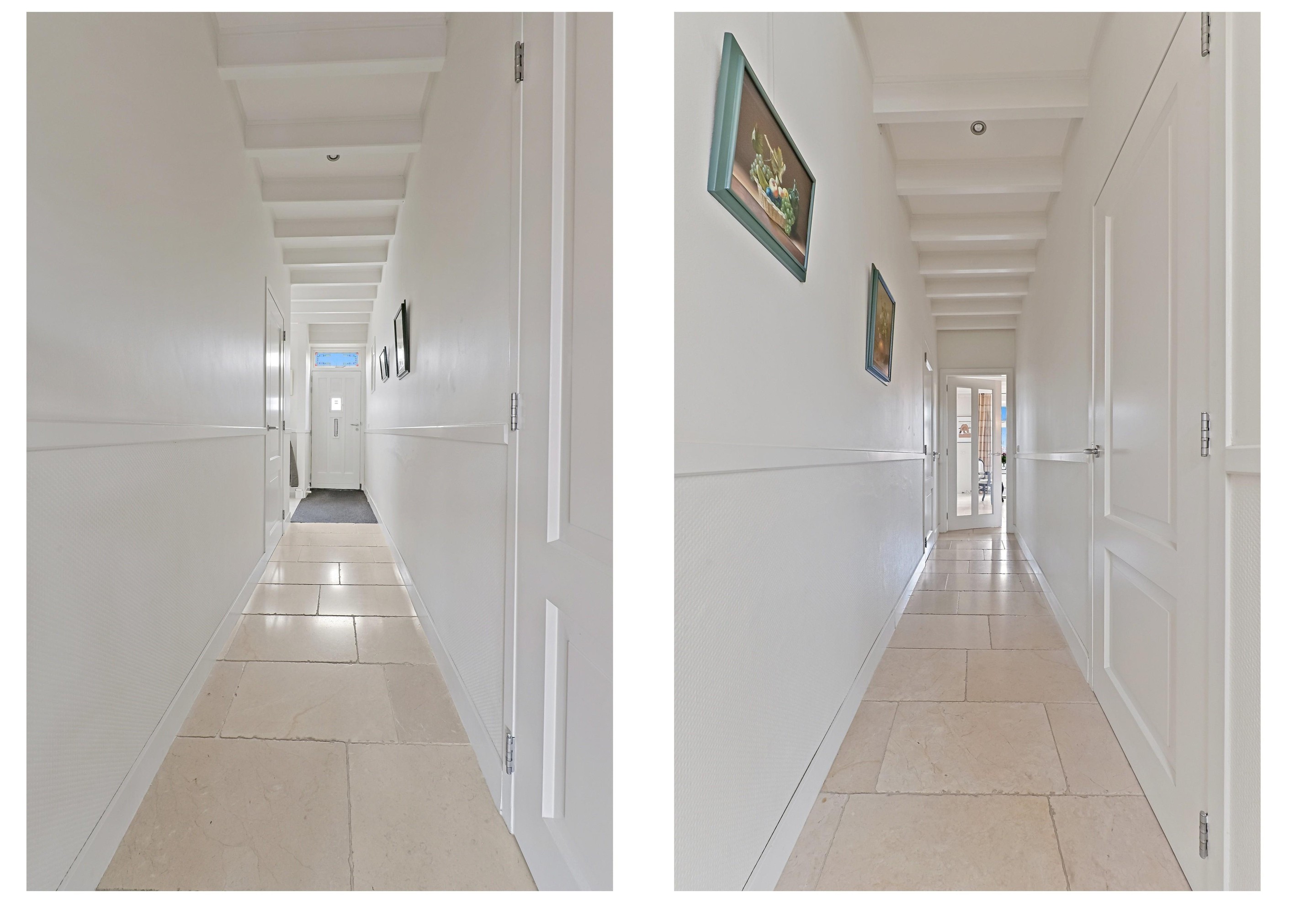 De entree van de woning bevindt zich in het midden van het pand. Aan de linkerzijde is de inpandige garage gelegen, aan de rechterzijde de ruime hal met meterkast, garderobe, toilet en trap naar de verdieping. De lange hal geeft inpandig toegang tot de garage en de woonkamer. De garage is een betegelde ruimte met aansluitingen voor wasmachine / droger. De garage is afgesloten met een elektrisch afgesloten overheaddeur.