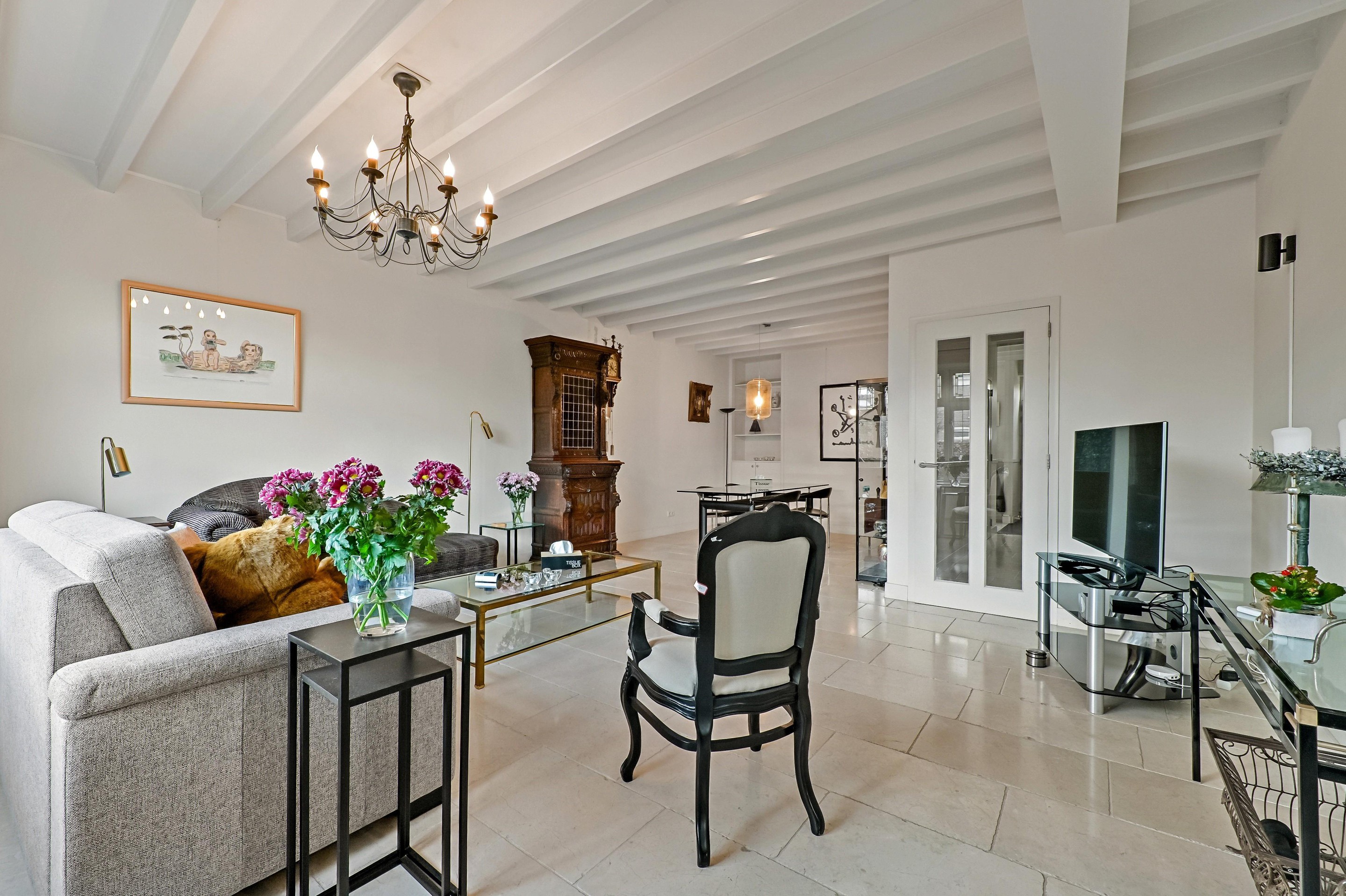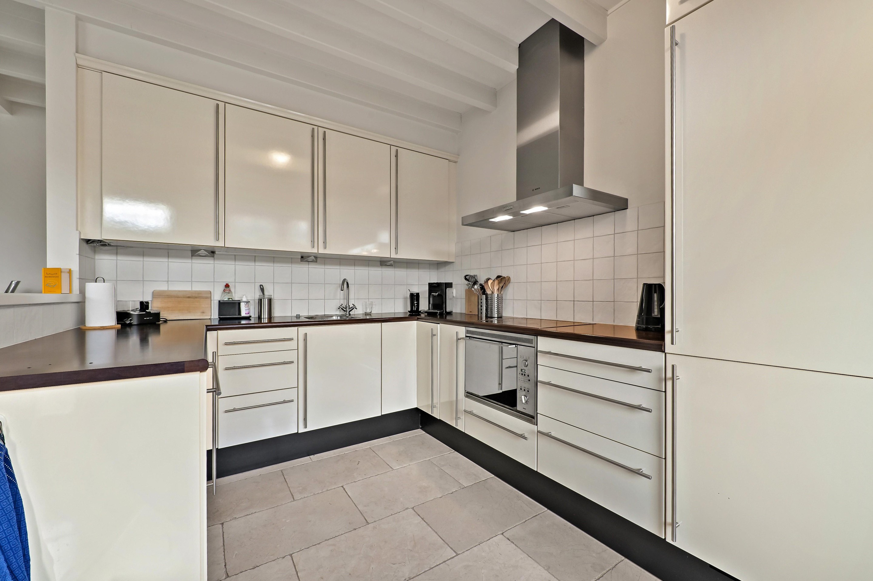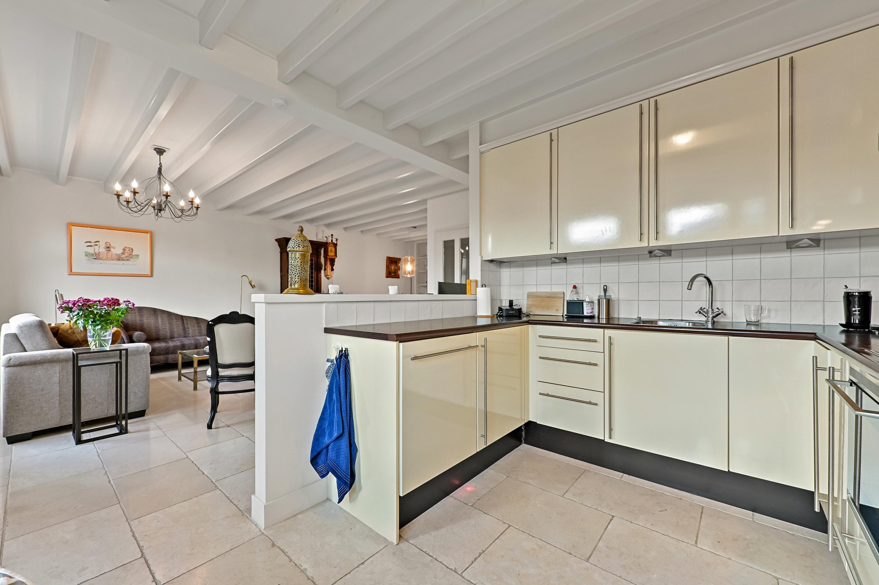 De tuingerichte woonkamer is samen met de open keuken bijna 8 meter breed. De woonkamer is voorzien van een fraai balkenplafond en een marmeren vloer met vloerverwarming. Mede dankzij de plafondhoogte en de grote raampartijen is de woonkamer een aangename lichte ruimte. In de ramen is het karakteristieke glas-in-lood aanwezig. De keuken is op gesteld in een U-vorm, waardoor de keuken mooi in verbinding staat met het woongedeelte. De keuken is voorzien van diverse inbouwapparatuur waaronder een keramische kookplaat, vaatwasser, afzuigkap en een koel-vries combinatie. Vanuit het woongedeelte is de fraai aangelegde achtertuin te bereiken. De tuin is in 2025 opnieuw ingericht met diverse terrassen en Cortenstaal borders met een diversiteit aan beplanting. De tuin grenst aan het water langs de ’s-Herenstraat. Dankzij de ligging richting het westen kunt u hier lang genieten van het zonnetje.