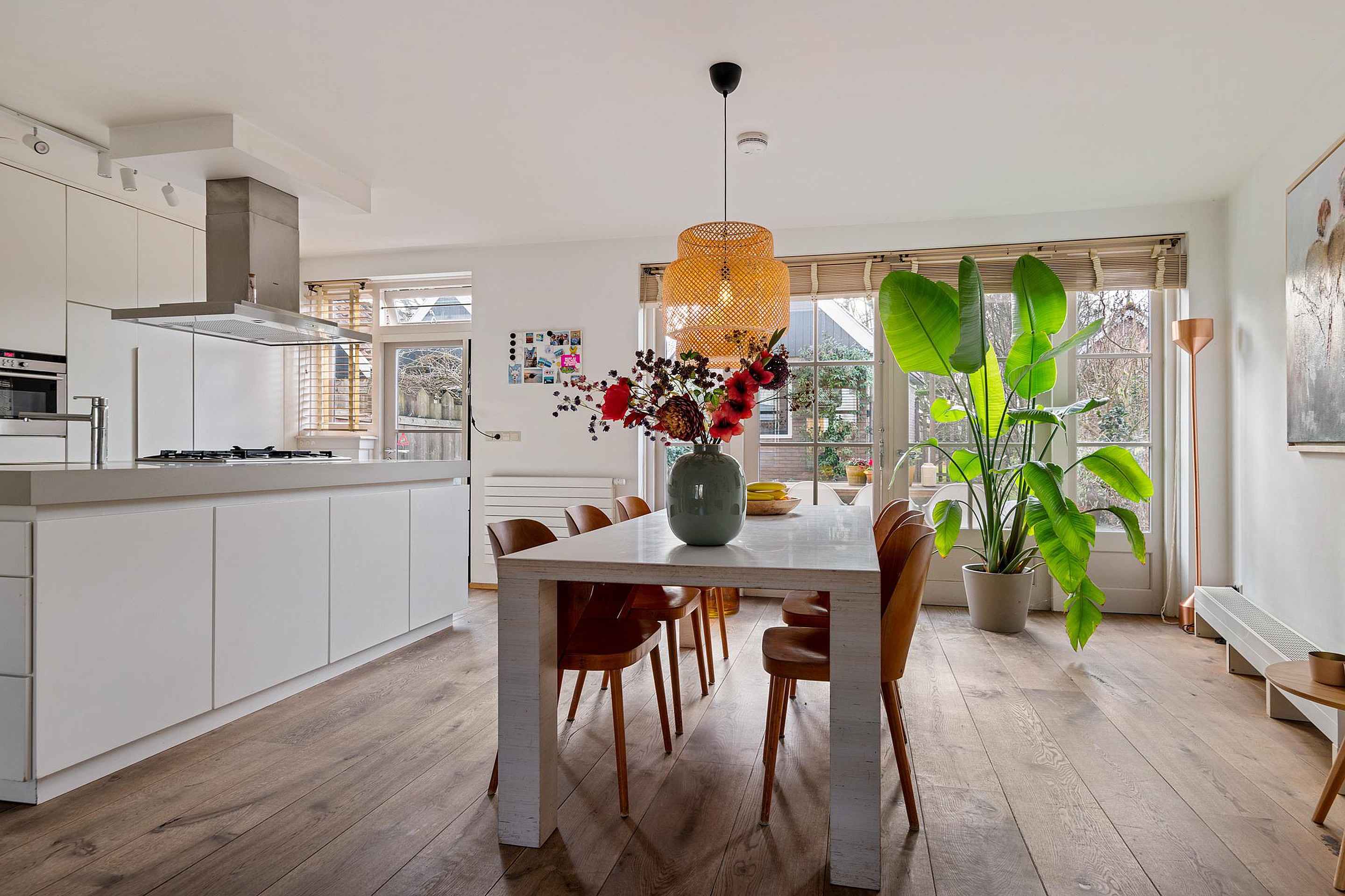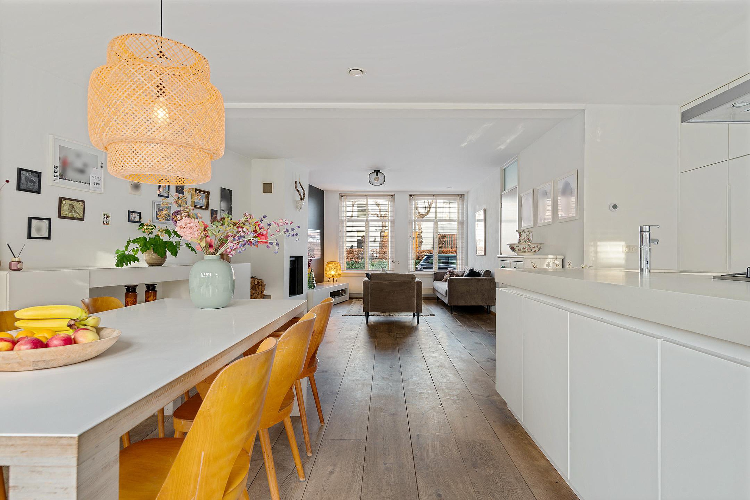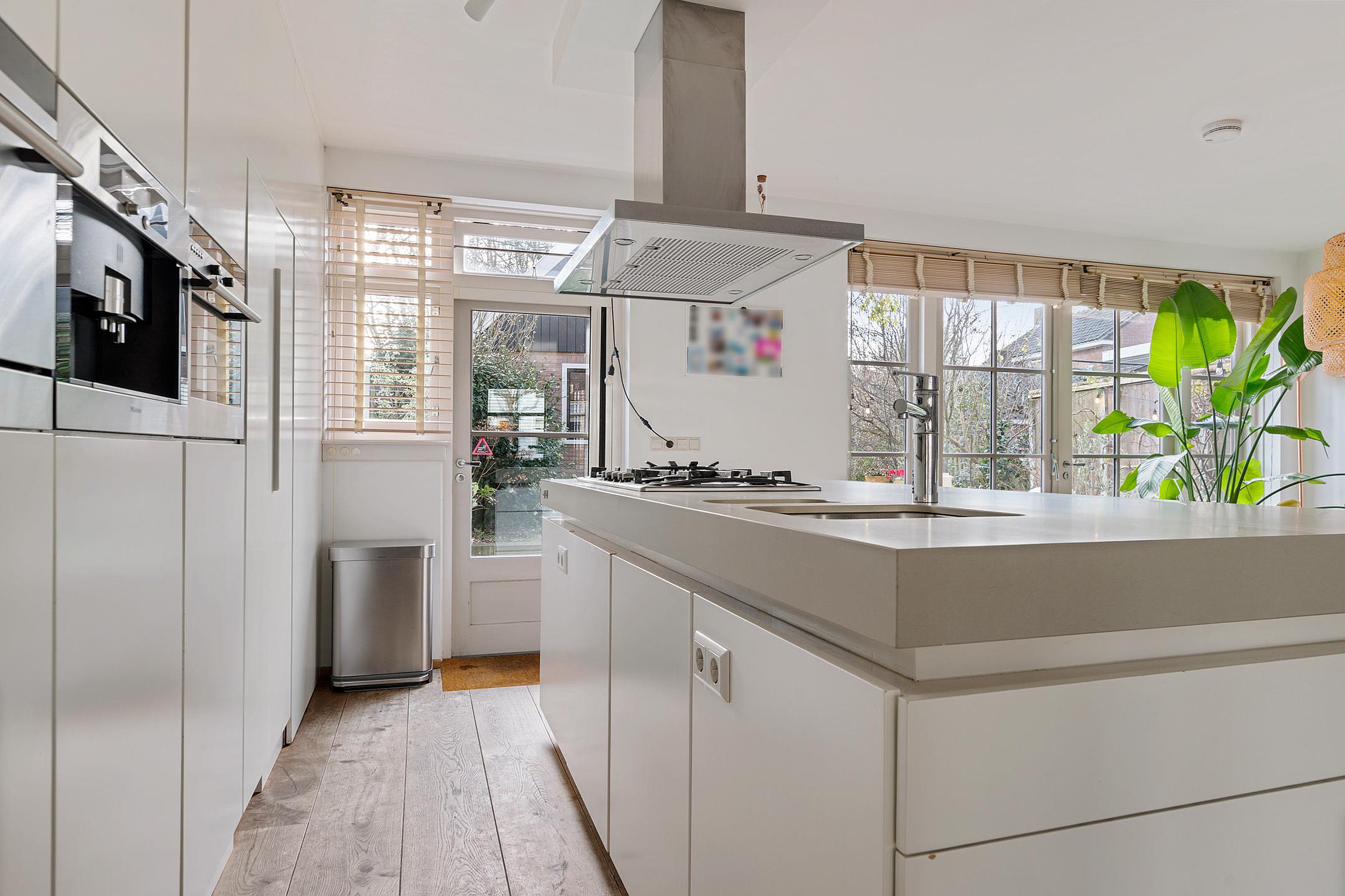 Na de royale entree met meterkast, trapopgang en moderne toiletruimte met fonteintje, stap je de woonkamer in, die naar de achterzijde toe schuin wegloopt. Dit maakt de kamer niet alleen speels, maar ook lekker ruim! Aan de voorzijde is alle ruimte voor een gezellige zithoek bij de openhaard met zicht op de rustige straat en gracht. Aan de achterzijde, bij de openslaande deuren naar de achtertuin, vindt het hele gezin een plekje aan de grote eettafel. Direct daarnaast is de royale open keuken met kook- en spoeleiland. De moderne keuken, in wit uitgevoerd, is voorzien van diverse inbouwapparatuur, waaronder 5-pits gasfornuis, vaatwasser, koelkast, oven en koffiemachine en biedt praktisch veel bergruimte. Extra bergruimte is handig weggewerkt. Via de deur in de keukenwand bereik je je eigen kelder met een stahoogte van 1.92 meter. Altijd al een wijnkelder willen hebben? Dan is dit je kans!