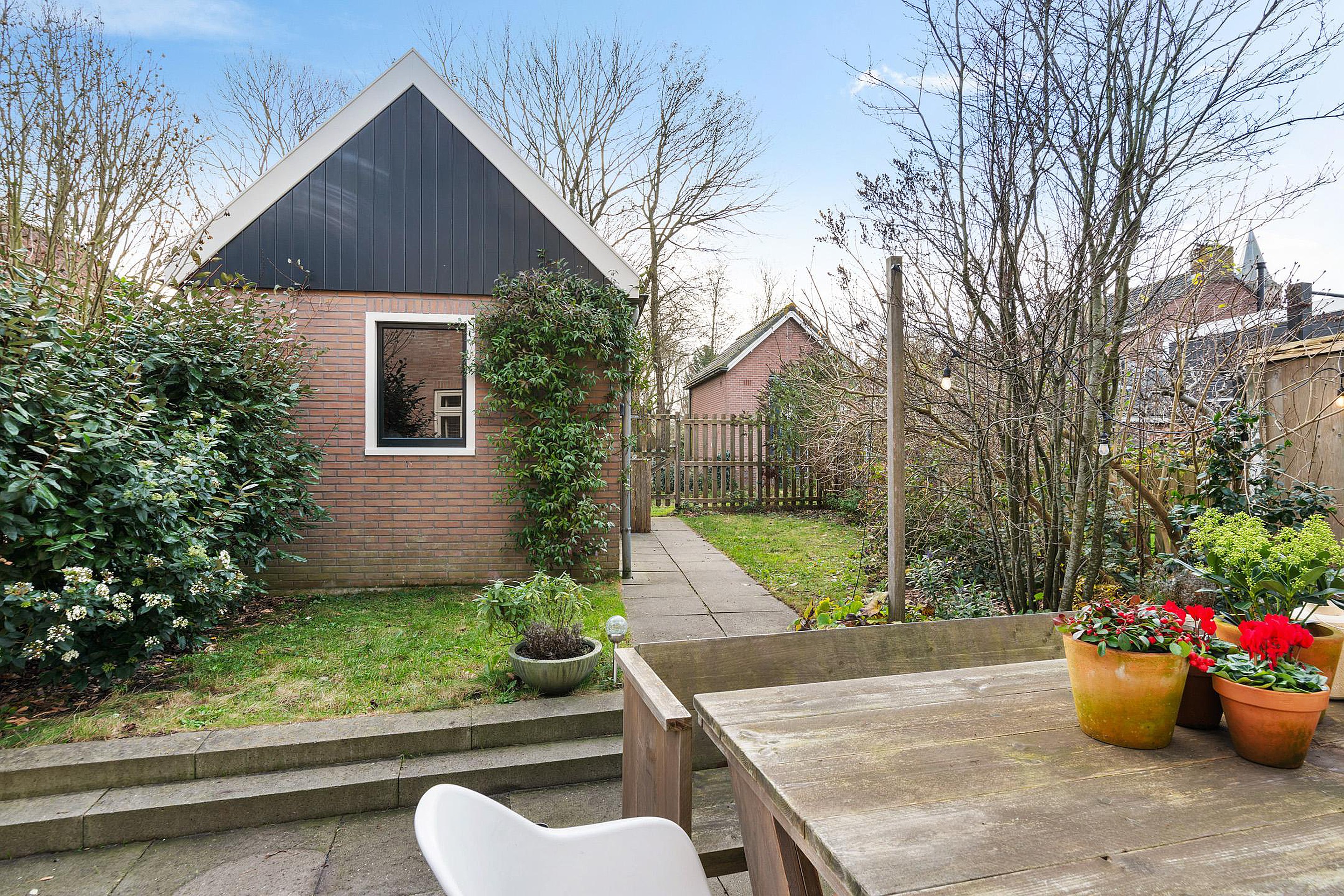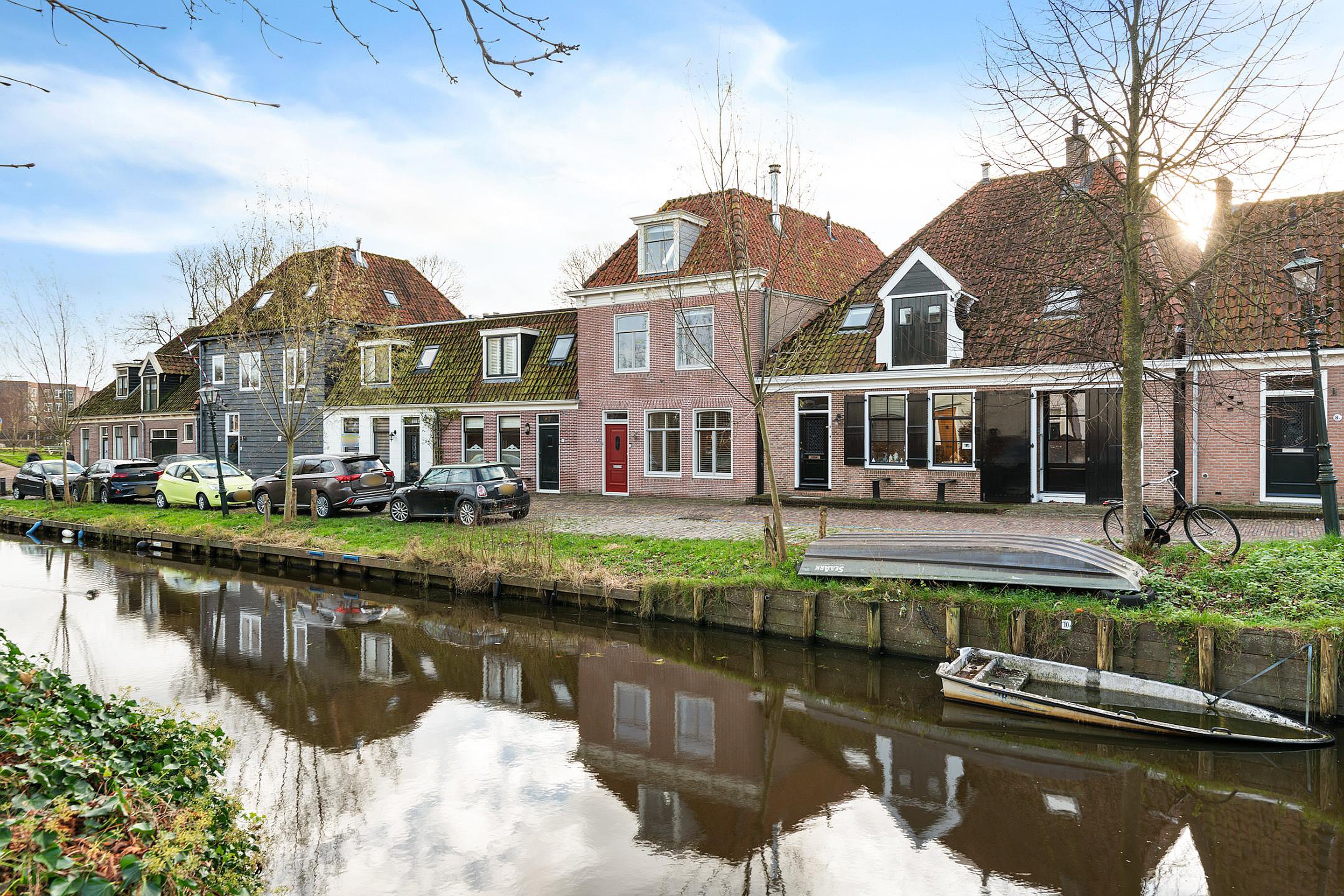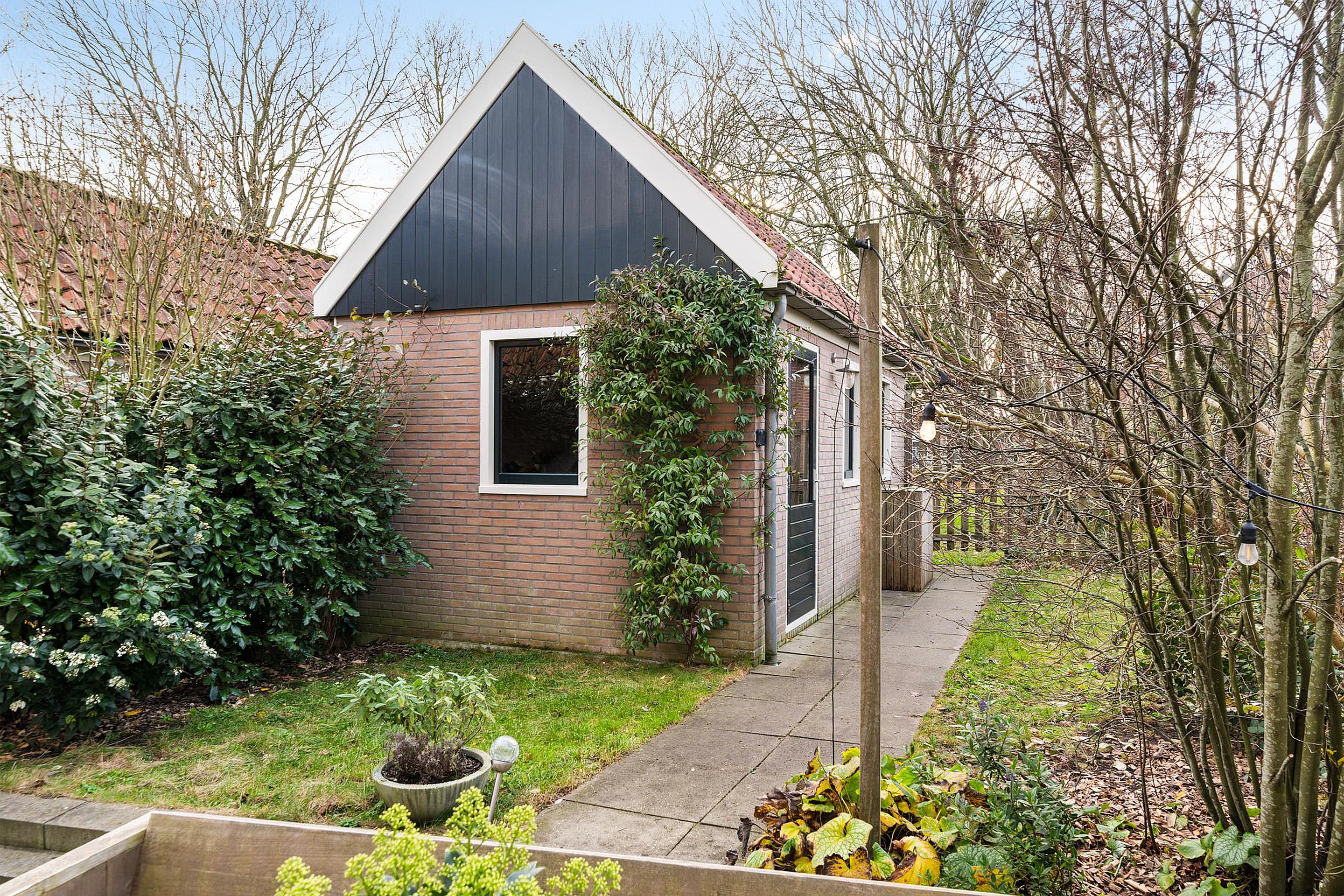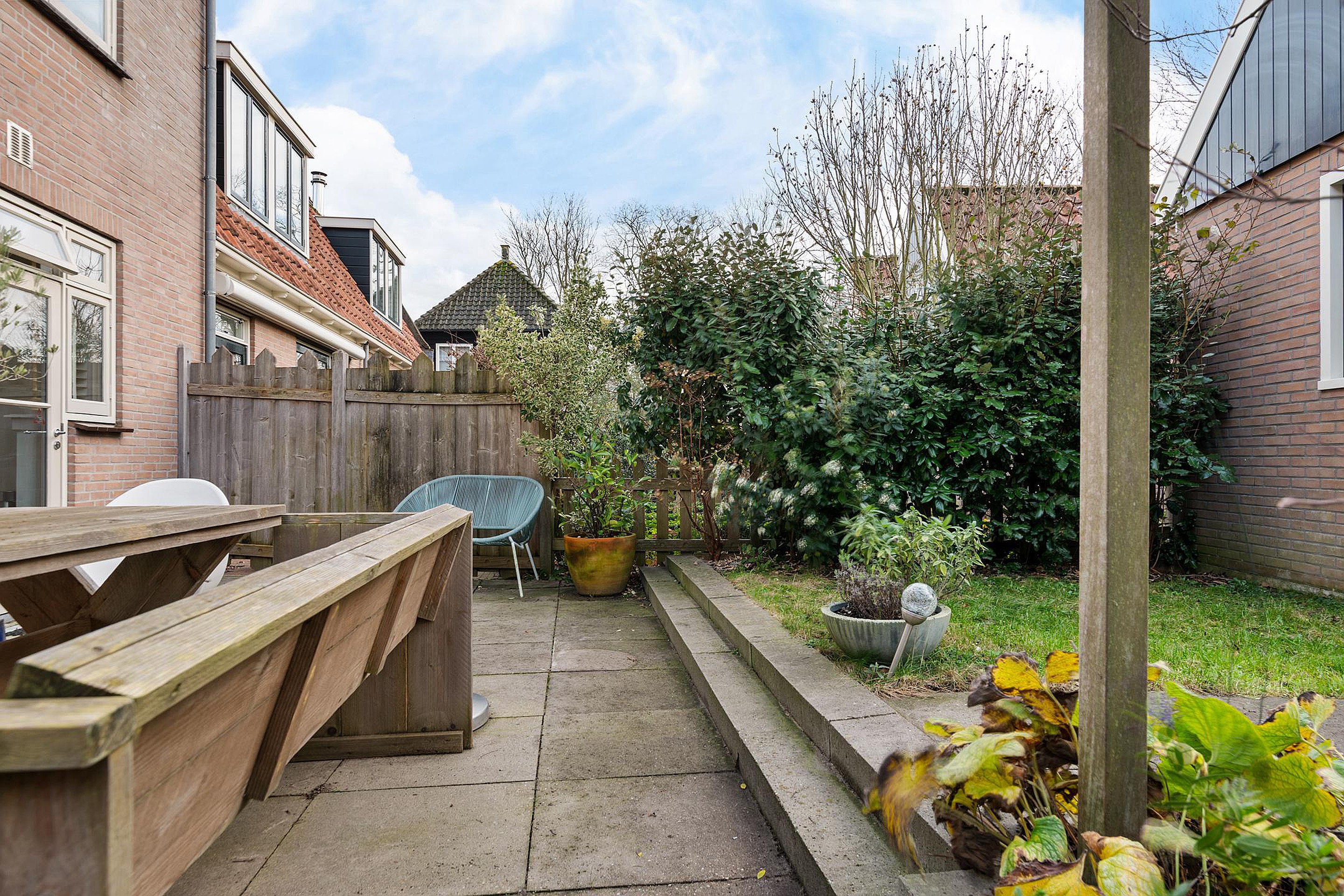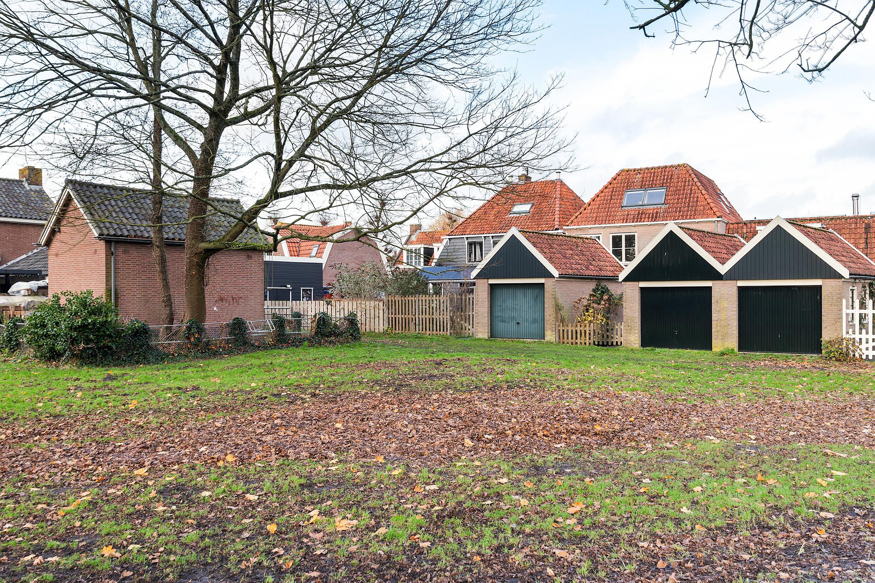 Aan de voorzijde van de woning, gelegen op het noordoosten, kun je op de eigen stoep heerlijk op een bankje over de gracht uitkijken. Doordat de woning aan een doodlopende straat ligt, is het hier nooit druk met verkeer voor de deur. Parkeren kan (met vergunning) direct voor de deur en het is mogelijk om een bootje in de gracht te leggen, om zo Waterland vanaf het water te verkennen. Aan de achterzijde bevindt zich de besloten stadstuin op het zuidwesten. Direct aan het huis, bij de openslaande tuindeuren, is een fijn terras gemaakt. De rest van de tuin is voorzien van gras en groene borders. Achterin de tuin ligt de vrijstaande stenen garage, voorzien van elektra. Door het puntdak is er extra bergruimte in de nok, die bereikbaar is middels een vlizotrap. Aan de achterzijde loopt een privé pad, dat alleen toegankelijk is voor de bewoners van deze huizen en bedoeld is om de garage en de achtertuin te kunnen bereiken. Tevens kan men hier altijd de auto parkeren voor de garage.