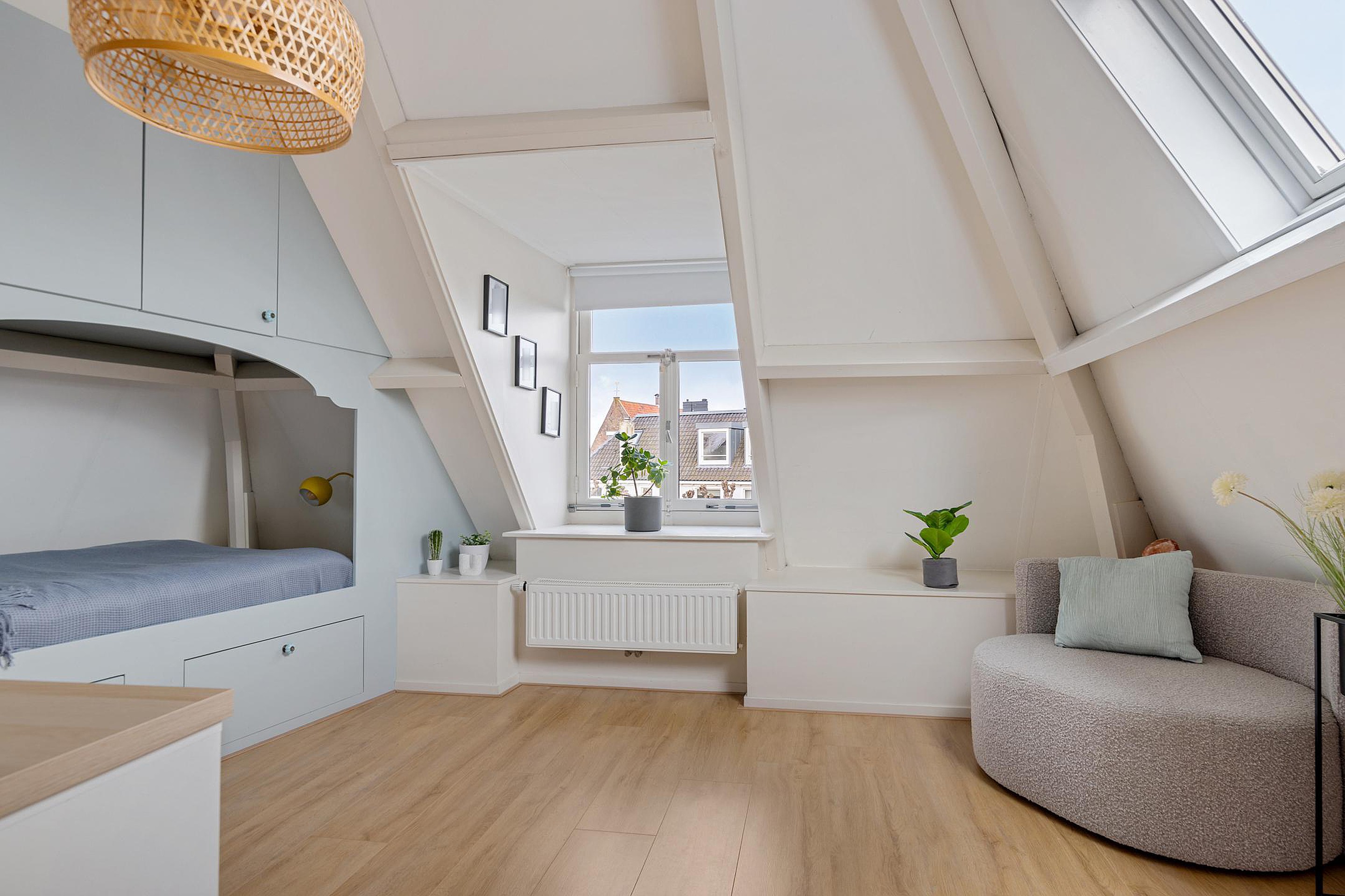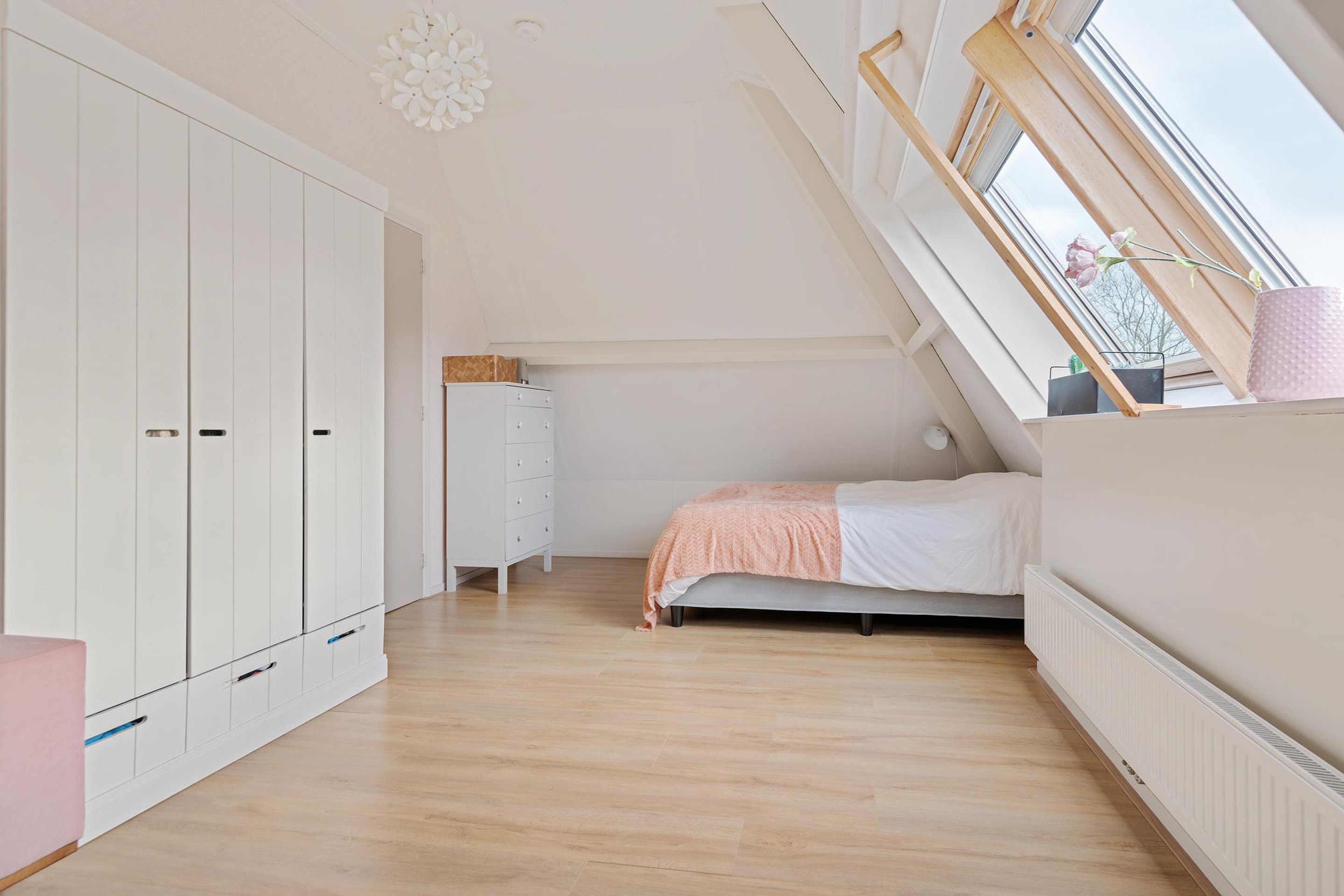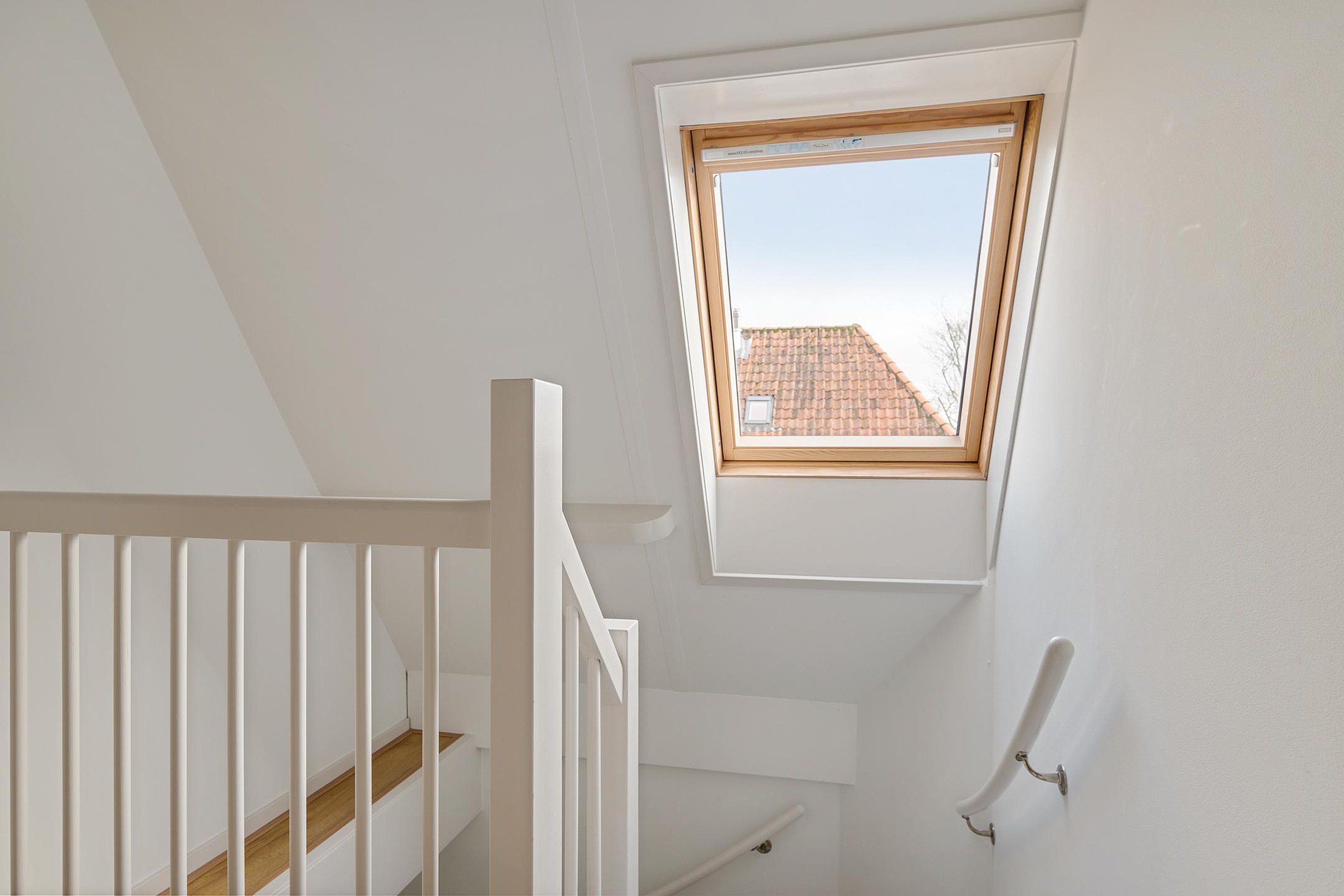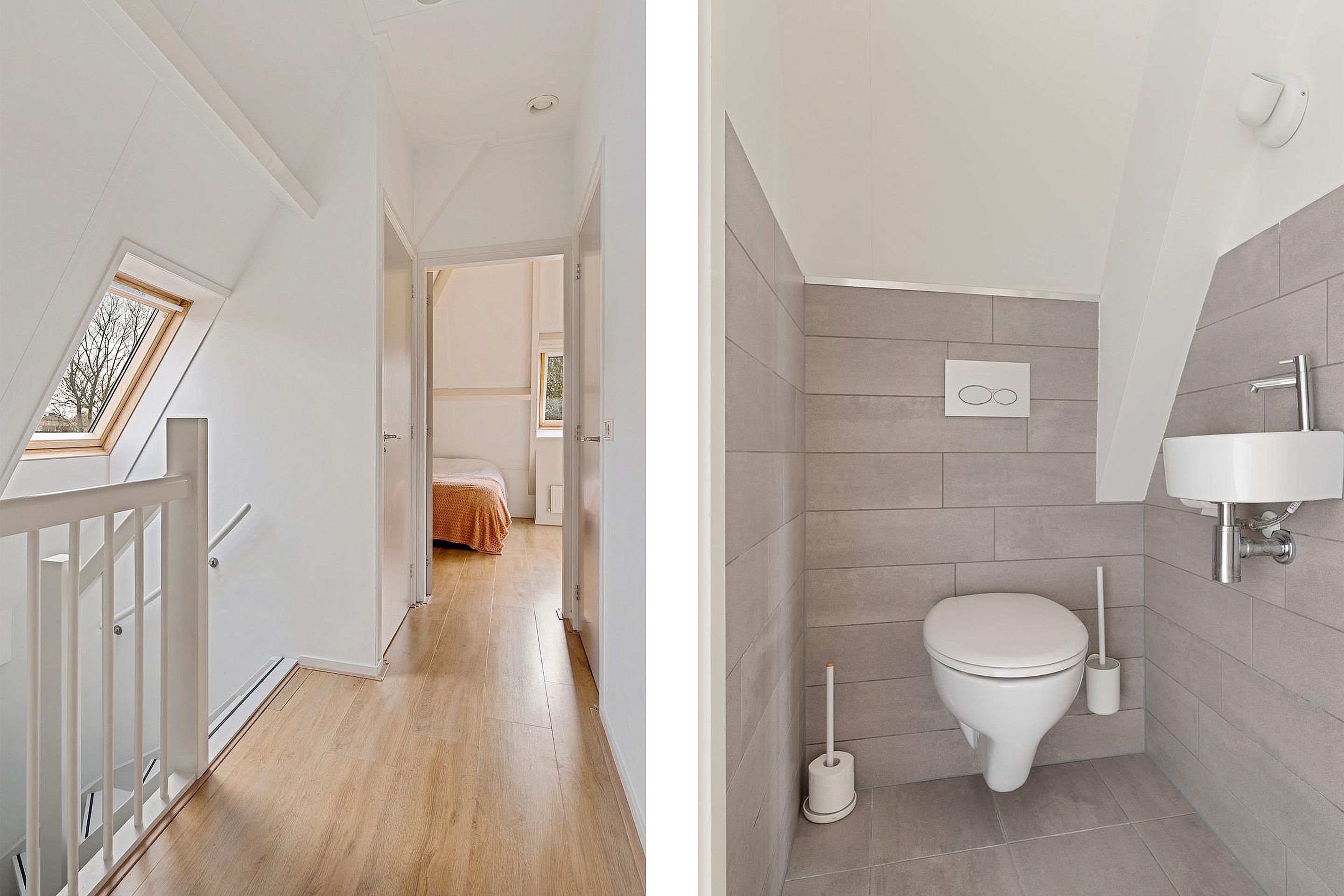 Een vaste open trap, met daglicht door een groot dakraam, brengt je naar de tweede verdieping. Door de gebroken kap is hier prettig veel leefruimte ontstaan. Aan de overloop vind je de moderne badkamer, voorzien van wastafel met meubel, inloopdouche en vloerverwarming. Deze ruimte heeft een dakkoepel voor daglichttoetreding. Aan de overkant van de overloop ligt een separate moderne toiletruimte met fonteintje. Er zijn op deze verdieping nog twee ruime slaapkamers gerealiseerd. De kamer aan de voorzijde is voorzien van een dakraam en een dakkapel, de kamer aan de achterzijde heeft een dubbel dakraam. In de ruimte tussen deze slaapkamers in, is nog een berging gerealiseerd. Handig voor alle spullen die een gezin verzameld. In deze berging hangt ook de Cv-ketel (huur) en is er plek voor wasmachine en droger.
