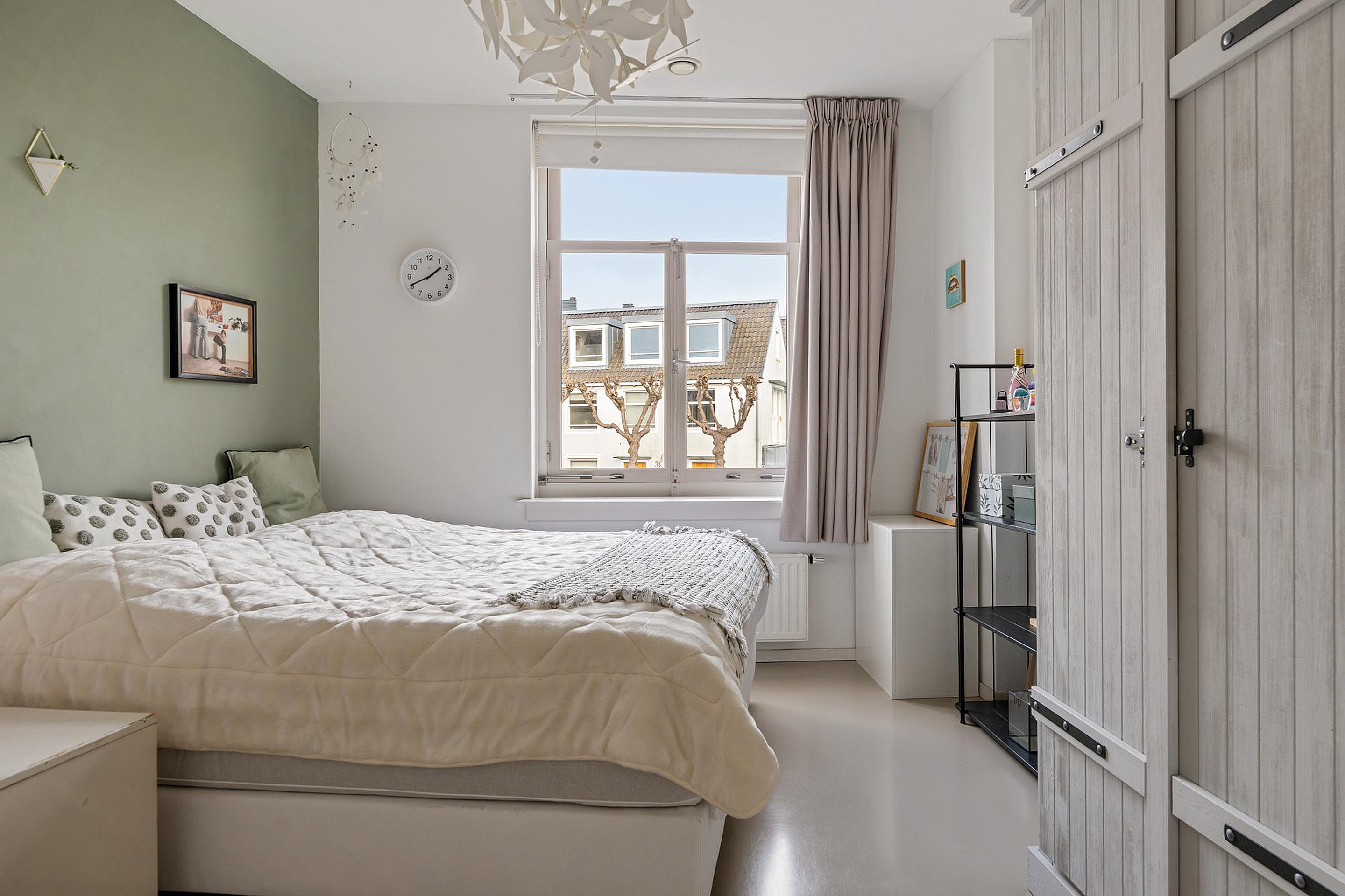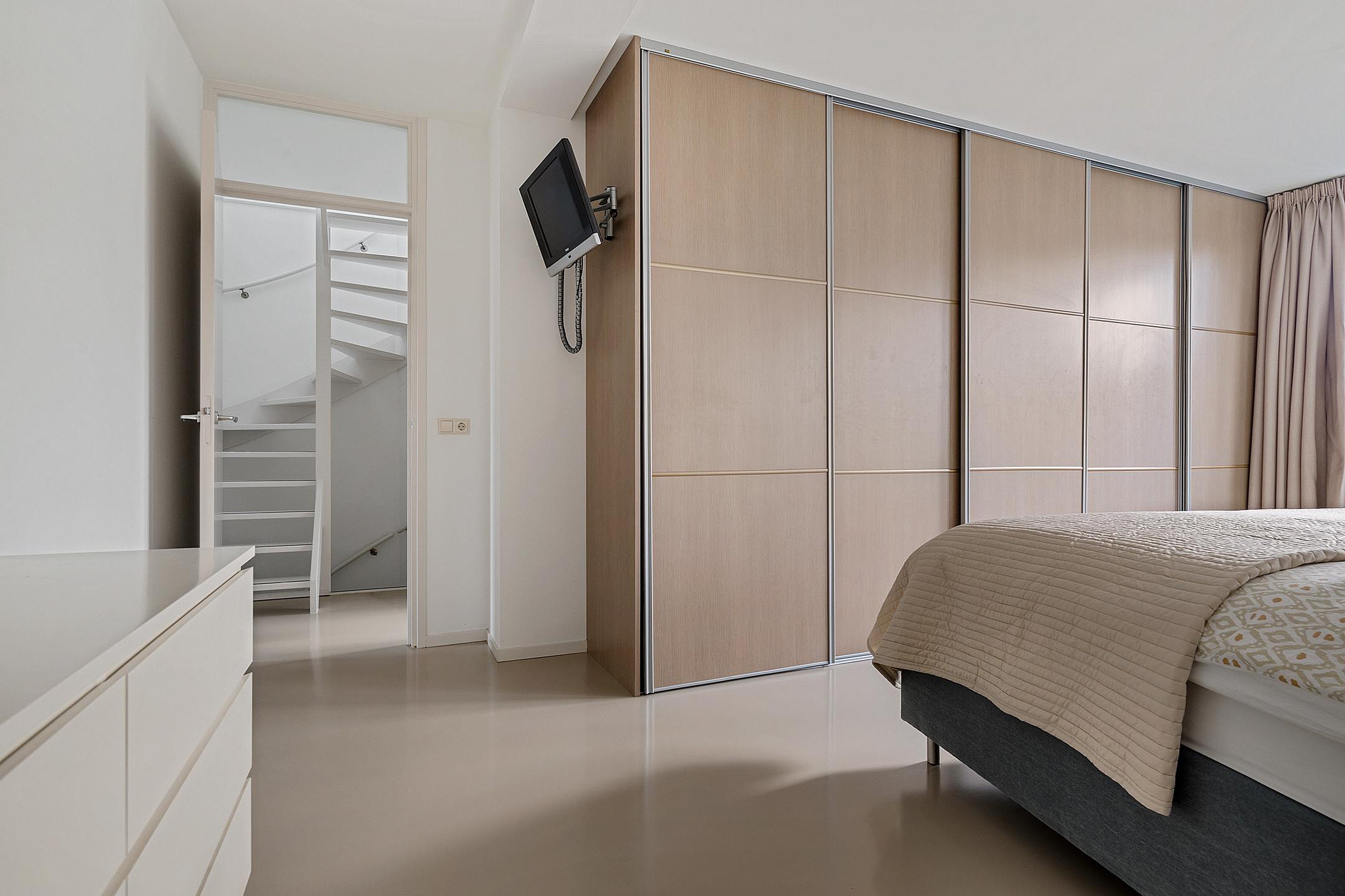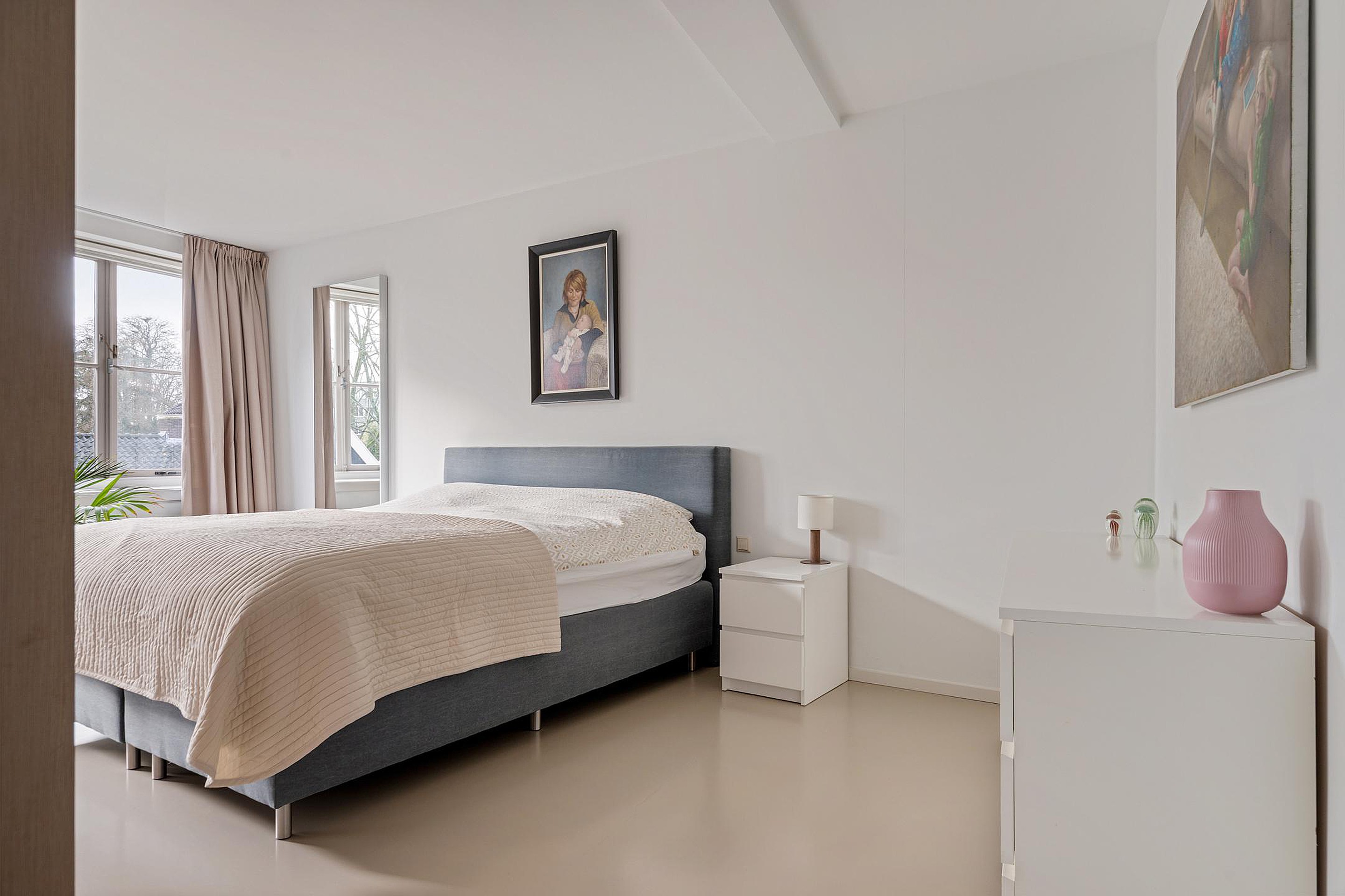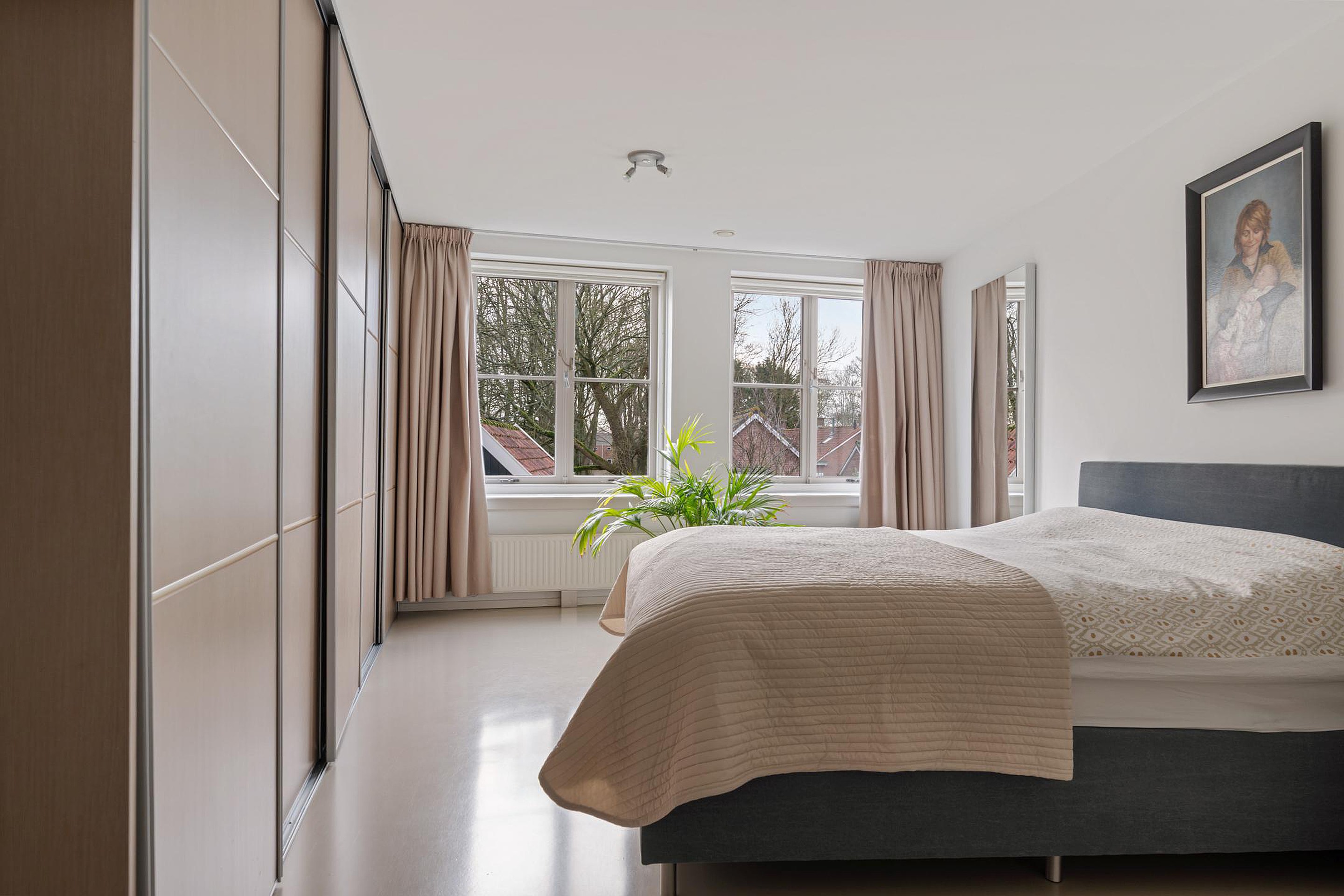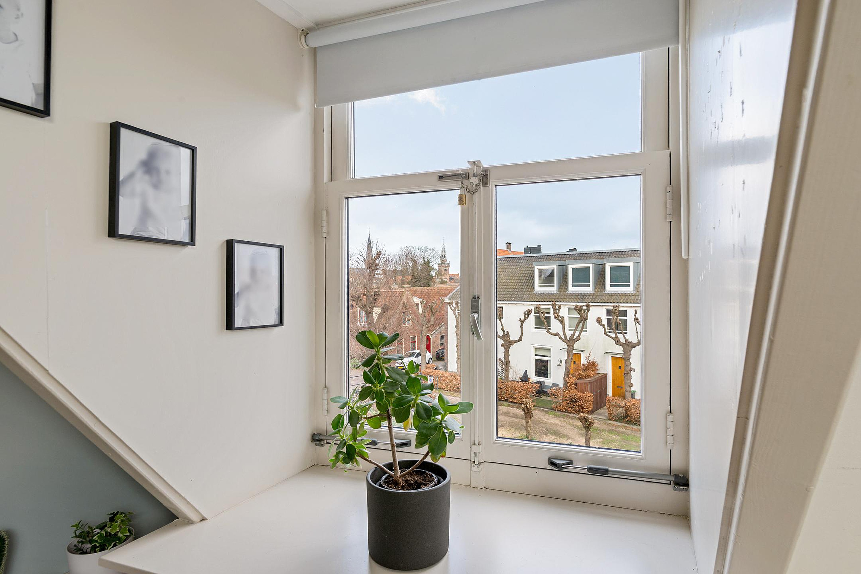 Via de trapopgang bereik je de eerste etage. Deze betonnen tussenvloer is voorzien van een gietvloer. De grootste slaapkamer van 23m2 is aan de achterzijde gelegen en beschikt over een grote kastenwand. Via de grote ramen met roedeverdeling heb je niet alleen zicht op de Grote Kerk, maar ook op de achterliggende vesting. Een tweede en derde slaapkamer liggen aan de rustige voorzijde. De moderne badkamer in lichte kleurstelling is voorzien van een ligbad, dubbele wastafel en inloopdouche. Aan de overloop is een separate moderne toiletruimte met fonteintje te vinden.