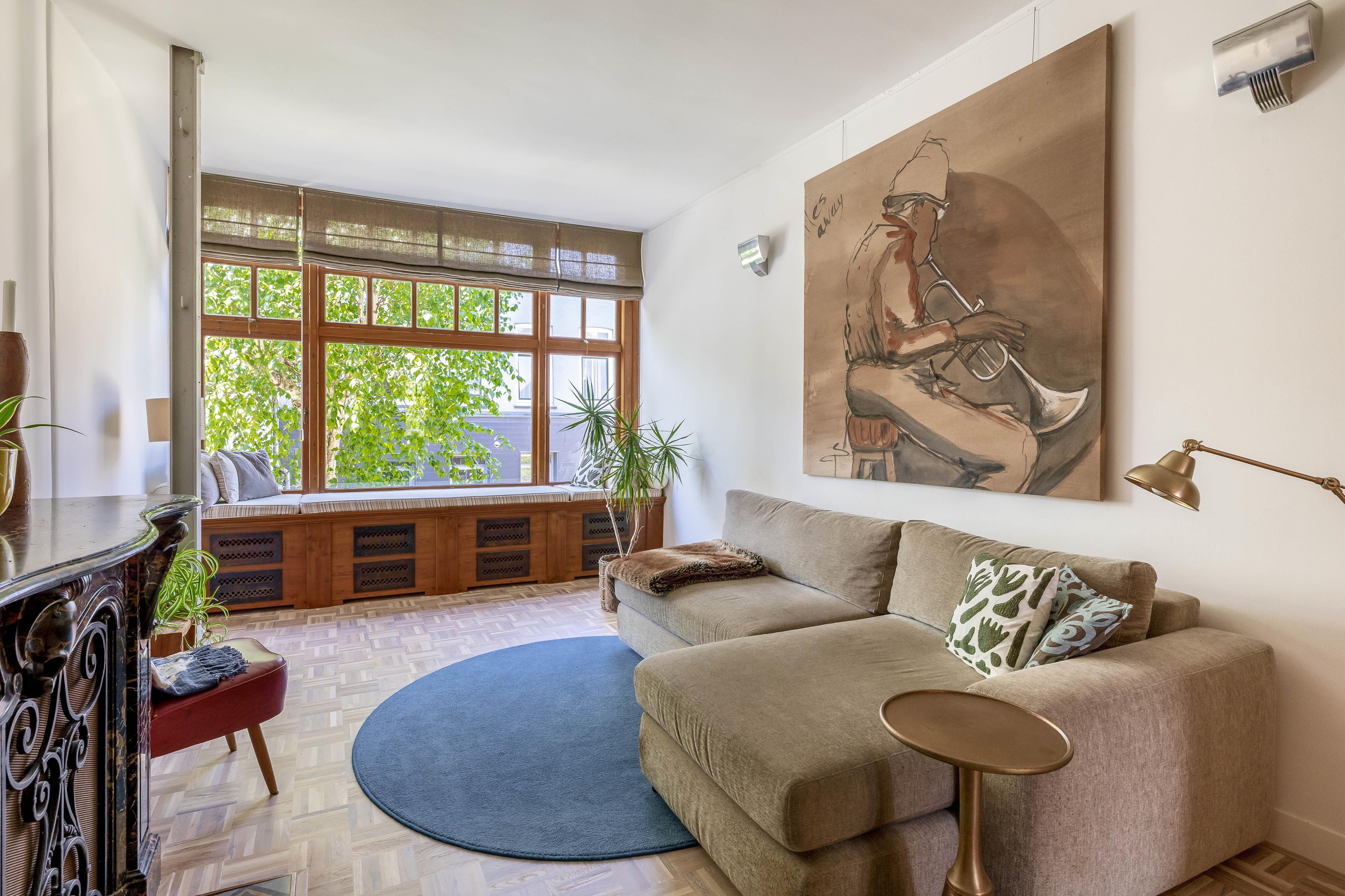 Aan de achterzijde is de woonkamer gelegen. Een lichte ruimte door de grote pui met veel glas en een gezellige plek om te zitten door de op maat gemaakte kussens in de vensterbank. Er is een prachtige marmeren schouw aanwezig.