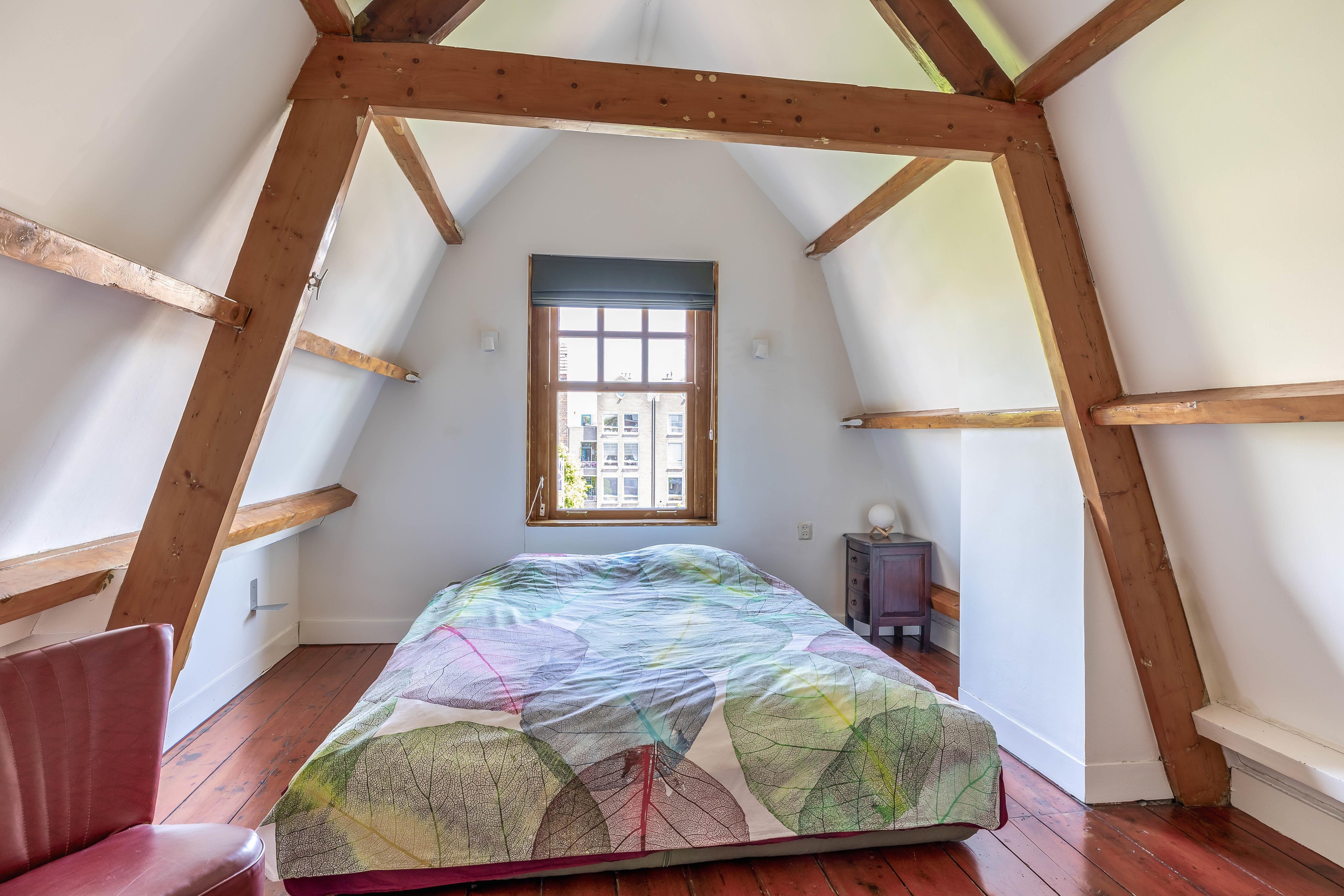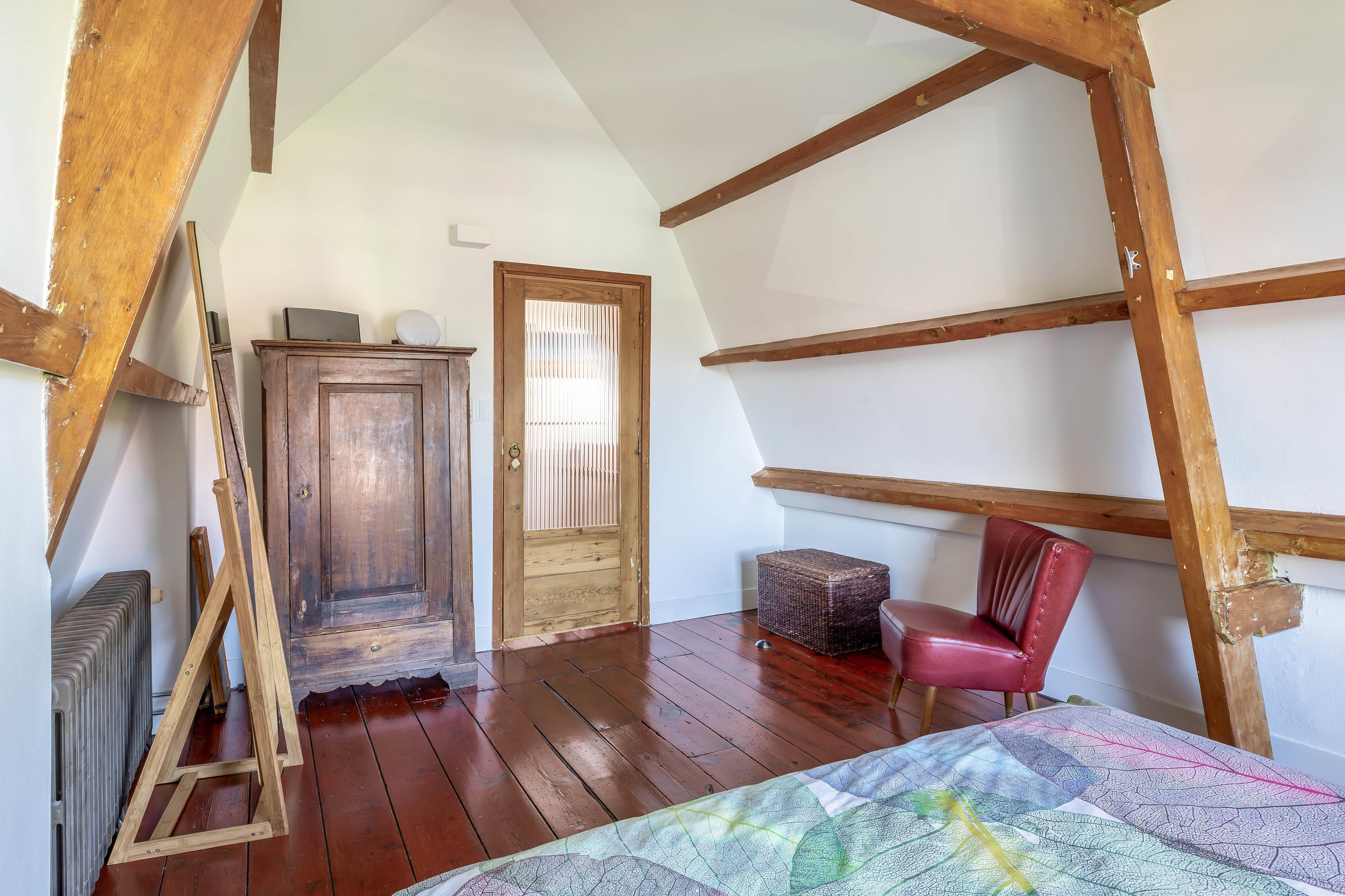 De sfeervolle hoofdslaapkamer is aan de voorzijde gelegen en heeft de mooie houten balkenconstructie van het dak mooi in het zicht. Dit is gecombineerd met strakke wanden.
