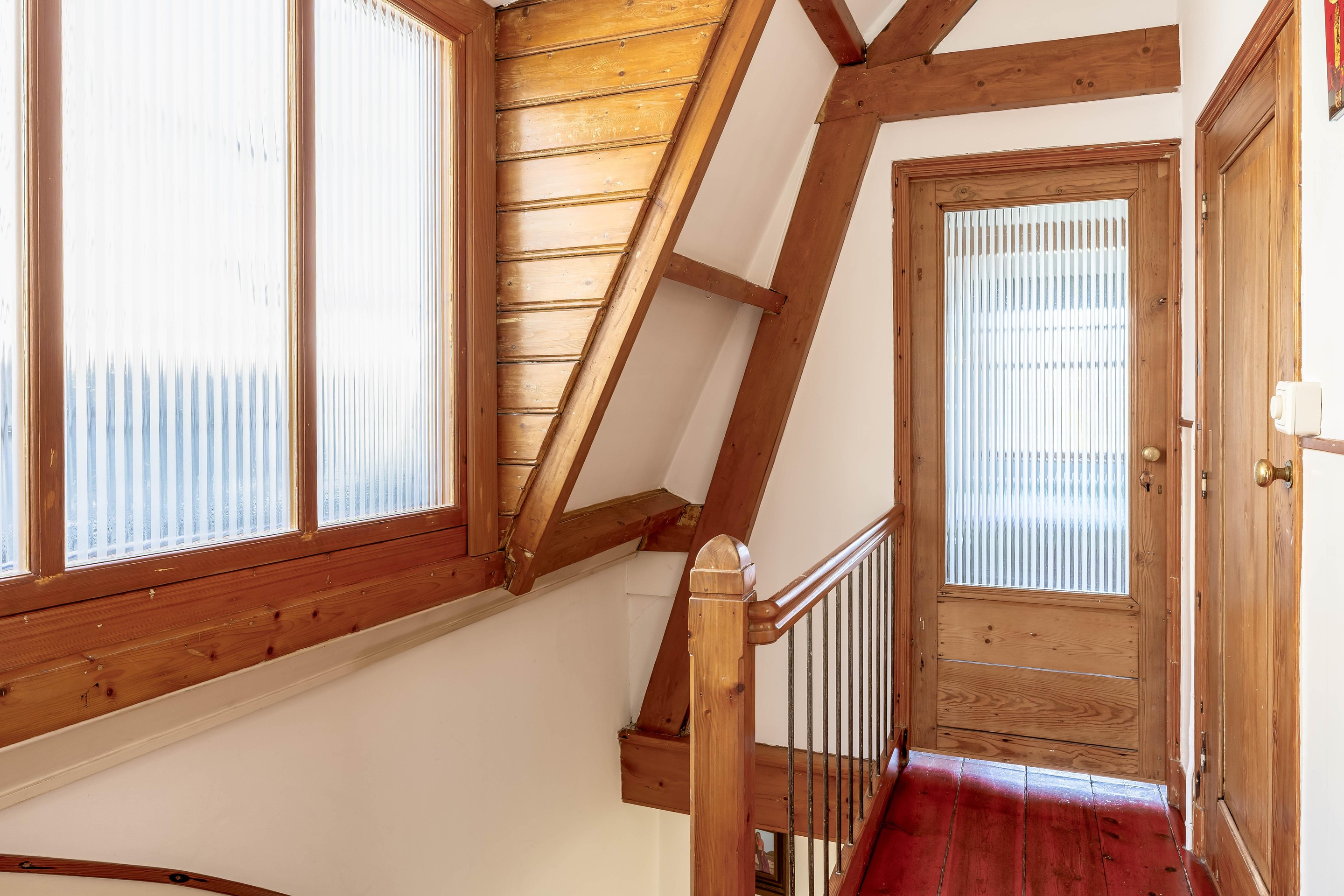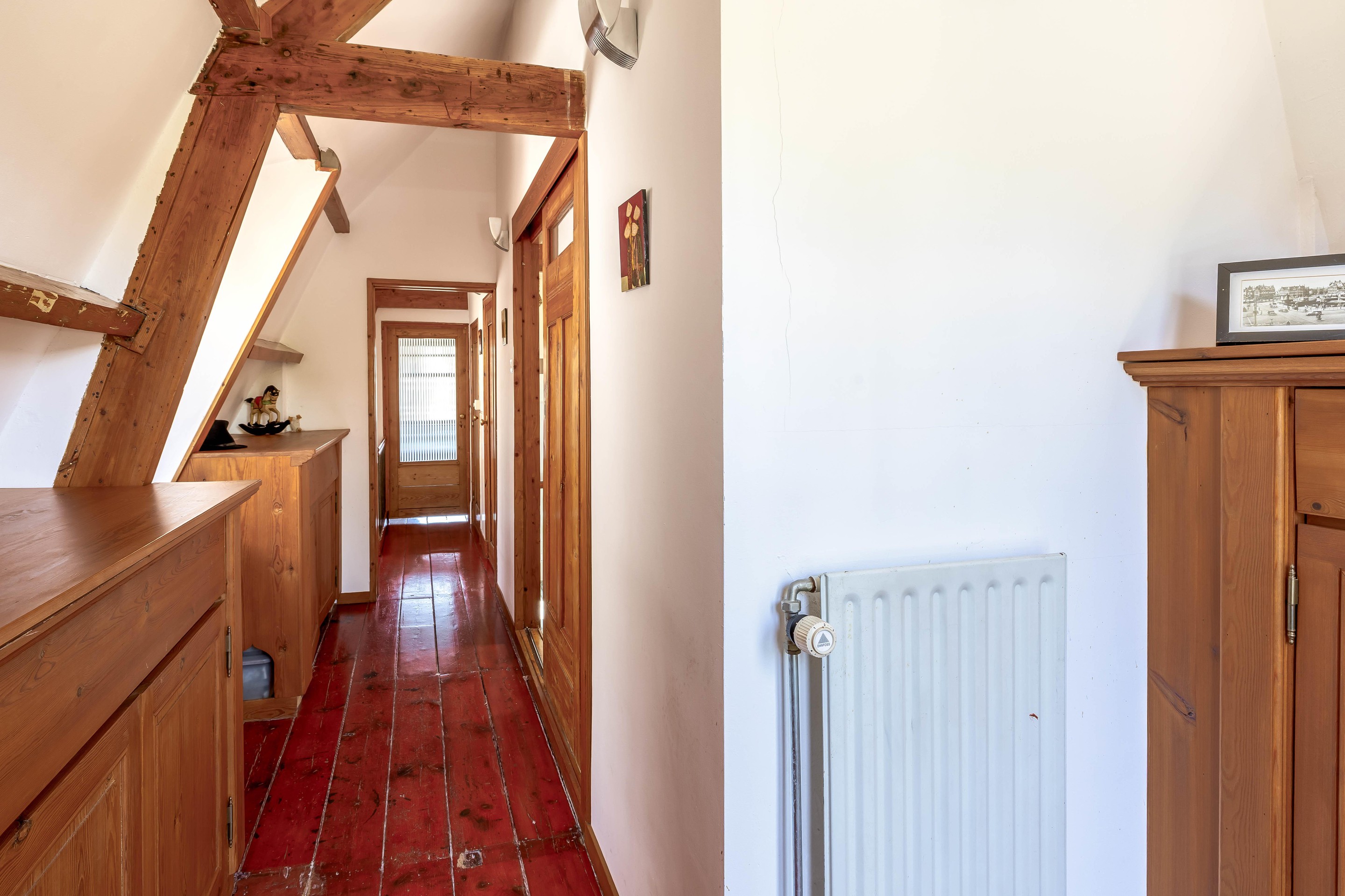 Via de trap die nog in originele staat is, kom je op de slaapverdieping. De ruime overloop met vaste kasten biedt toegang tot de berging, de slaapkamer en de badkamer.