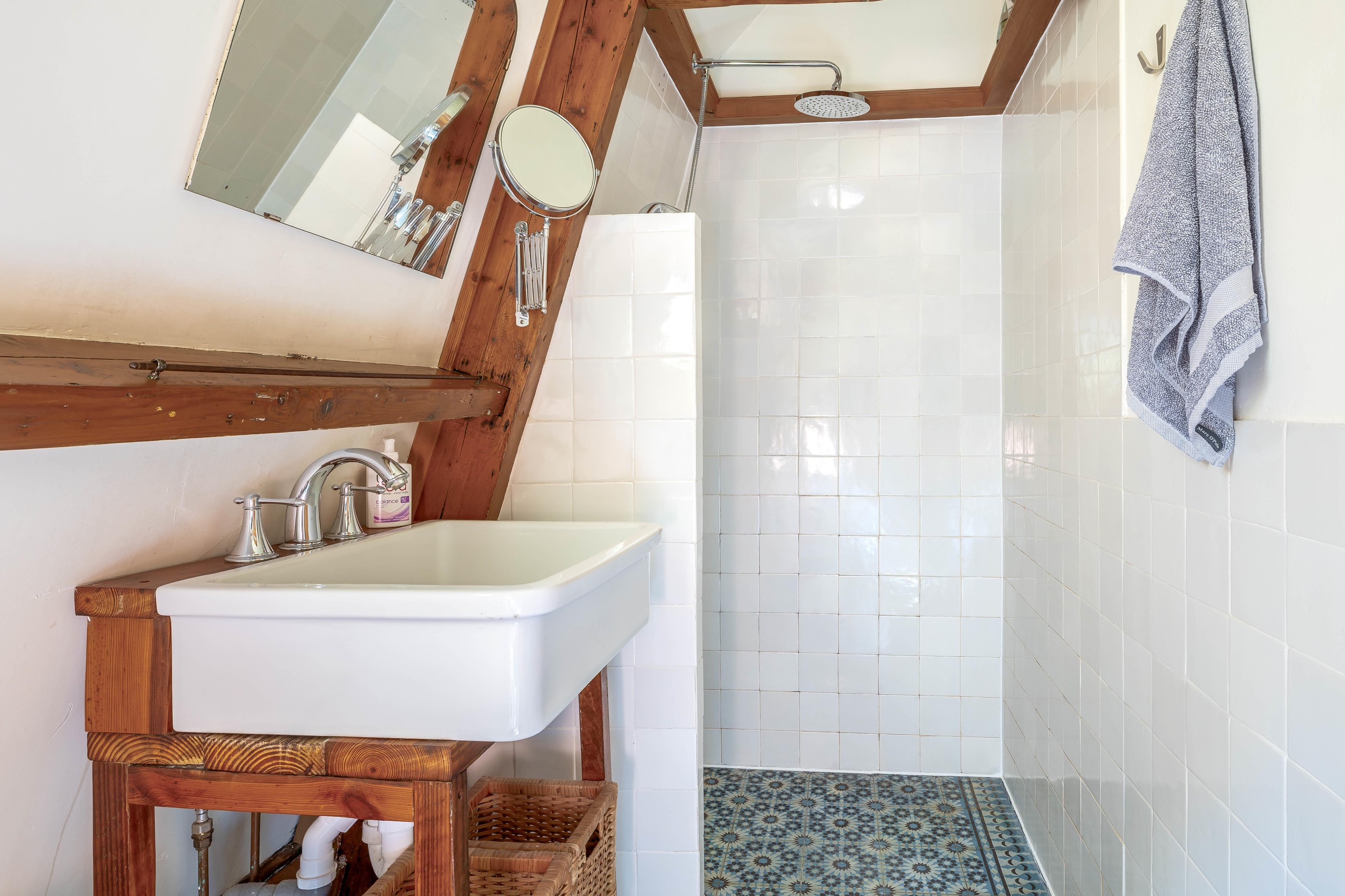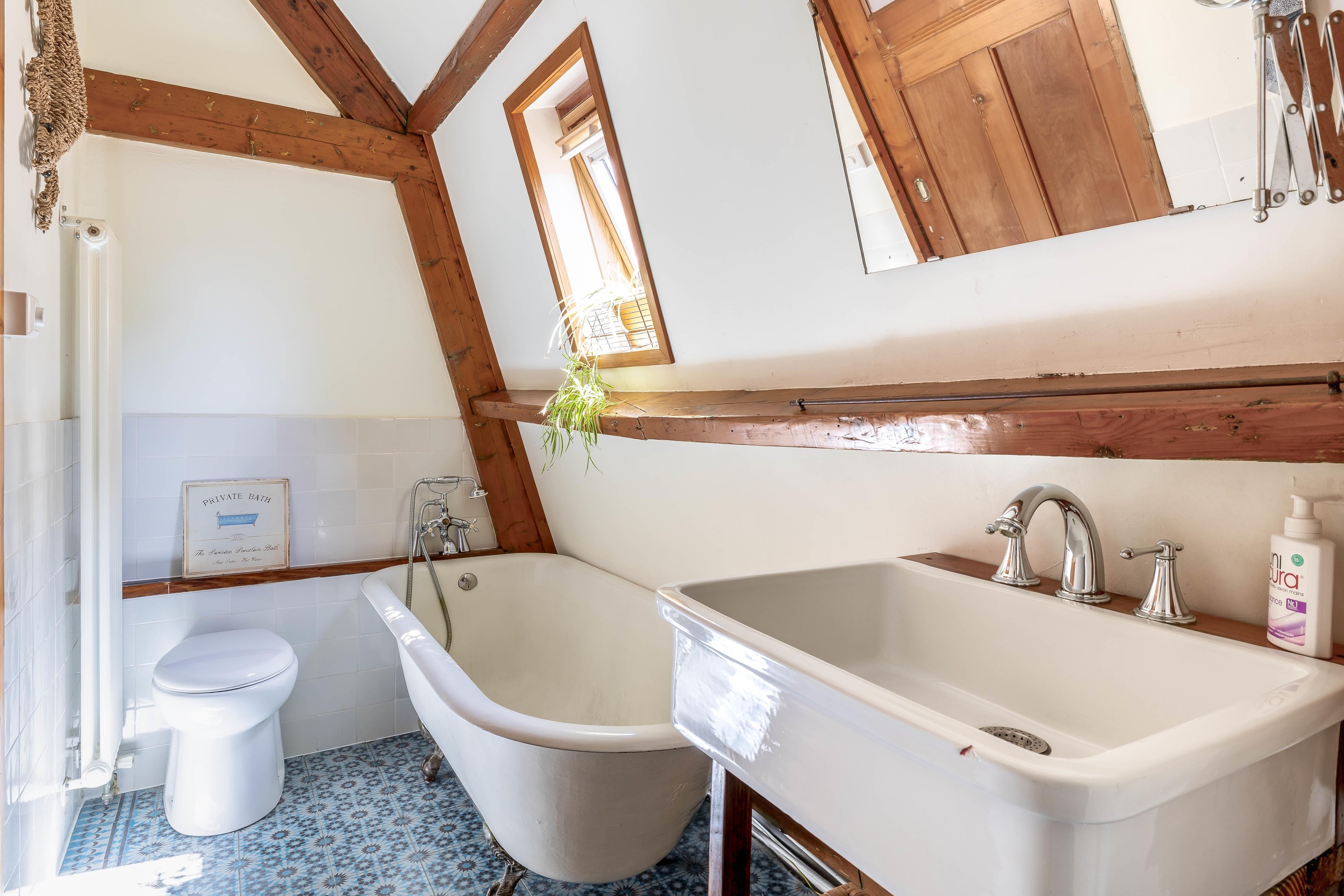 Ook in de badkamer zijn de mooie houten balken van de dakconstructie in het zicht. Het dakraam zorgt voor ook hier voor natuurlijke lichtinval. De badkamer is uitgerust met een ruime inloopdouche, een sierlijk ligbad op pootjes een wastafel met meubel en een toilet. De tegelvloer heeft een vrolijk patroon wat zorgt voor extra sfeer.