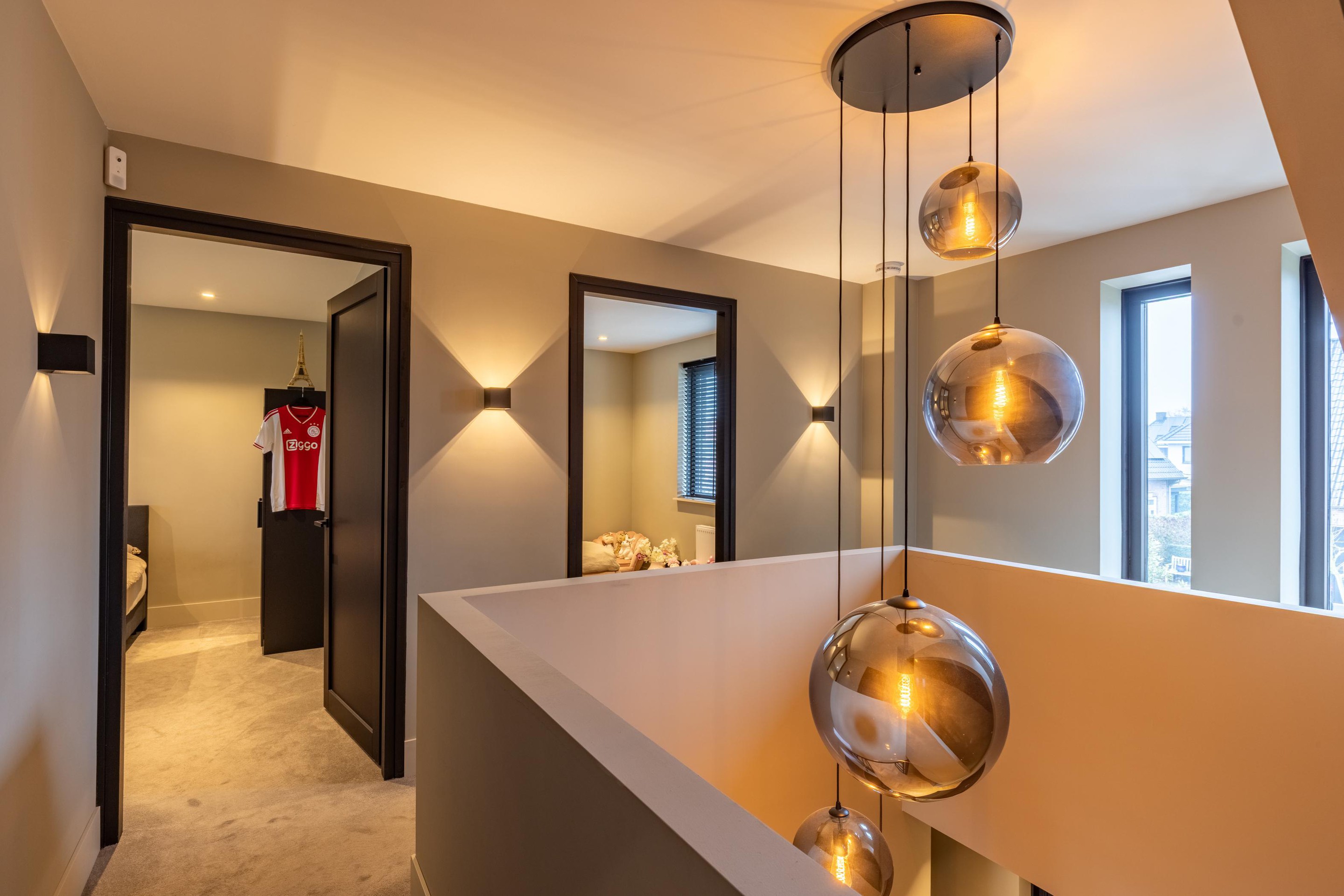 Eerste verdieping Overloop, 3 ruime slaapkamers (waarvan de ouderslaapkamer een doorloop heeft naar de ruime praktische inloopkast) moderne luxe badkamer voorzien van vloerverwarming, inloopdouche, ligbad, 2e wandcloset en dubbel wastafelmeubel;