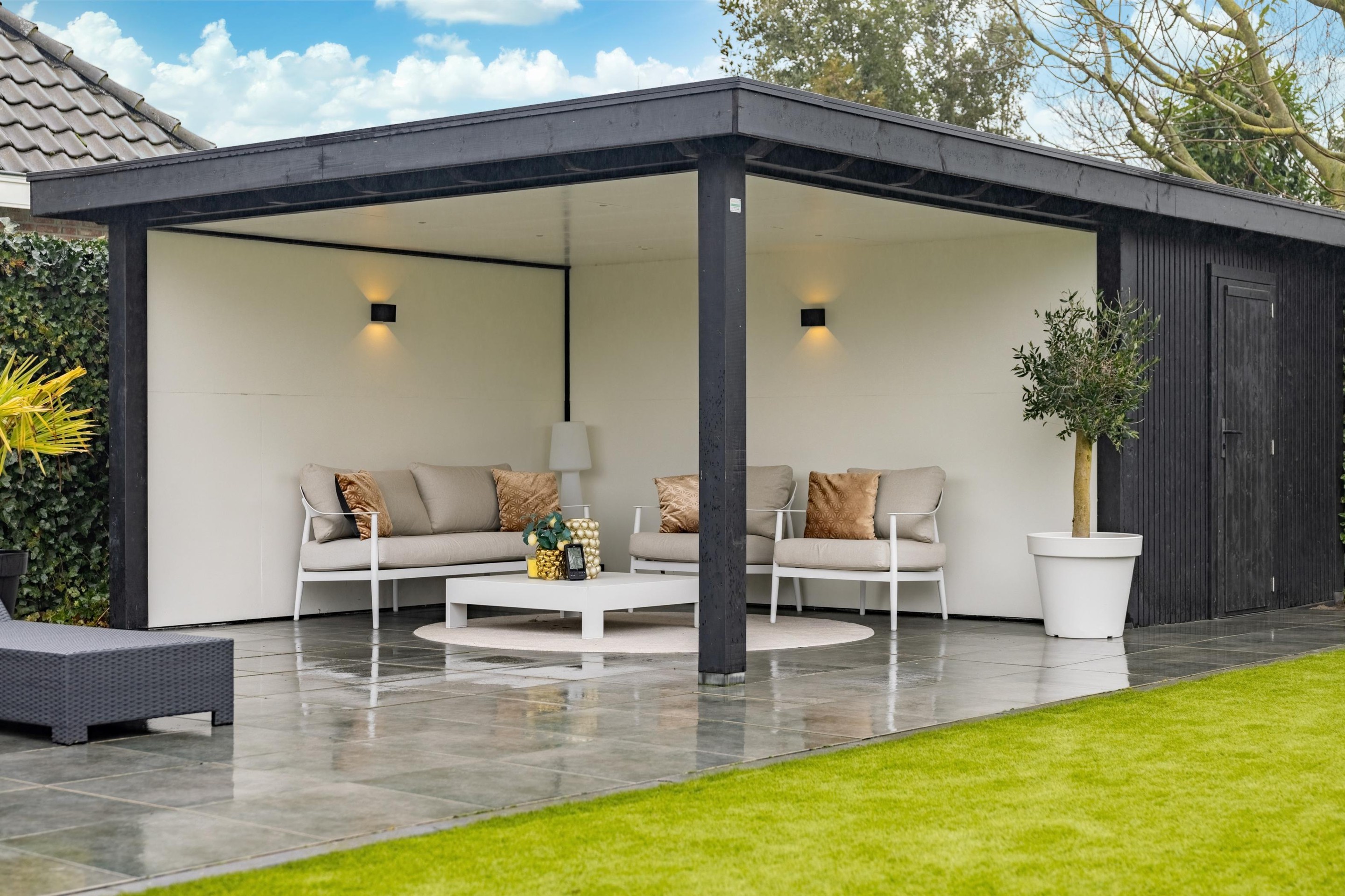 - vrijstaande houten berging en overkapping achterin de tuin (2022)
