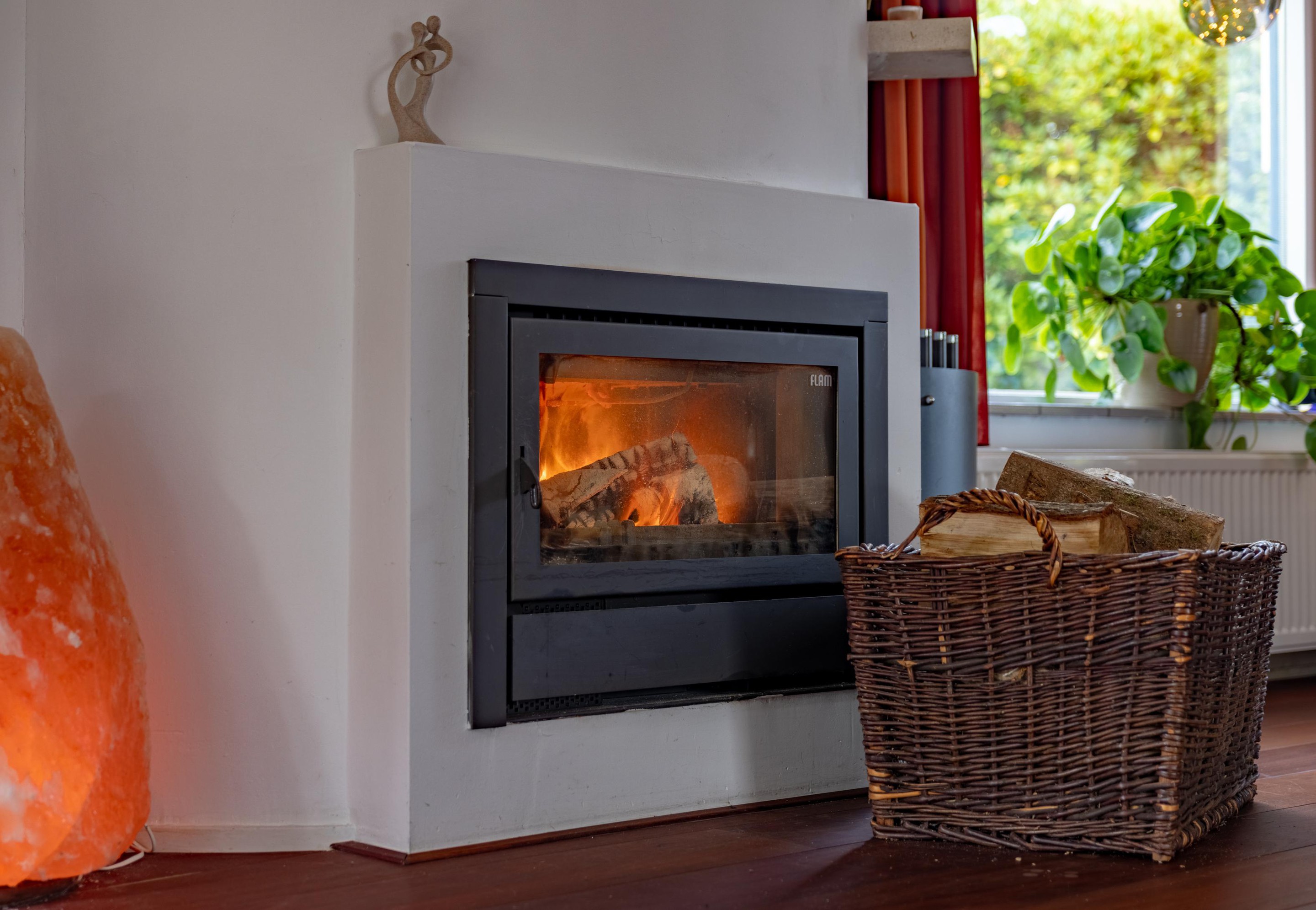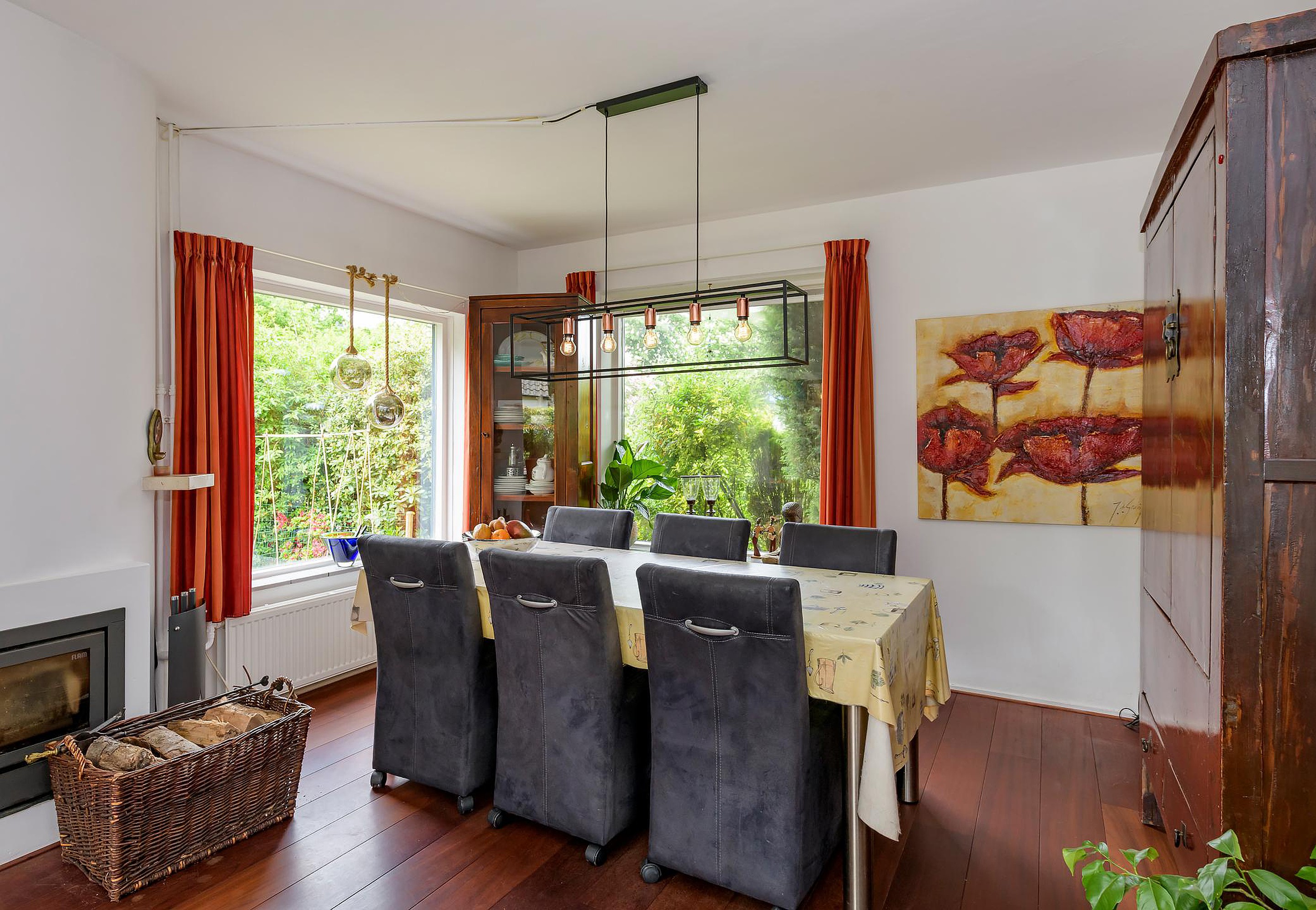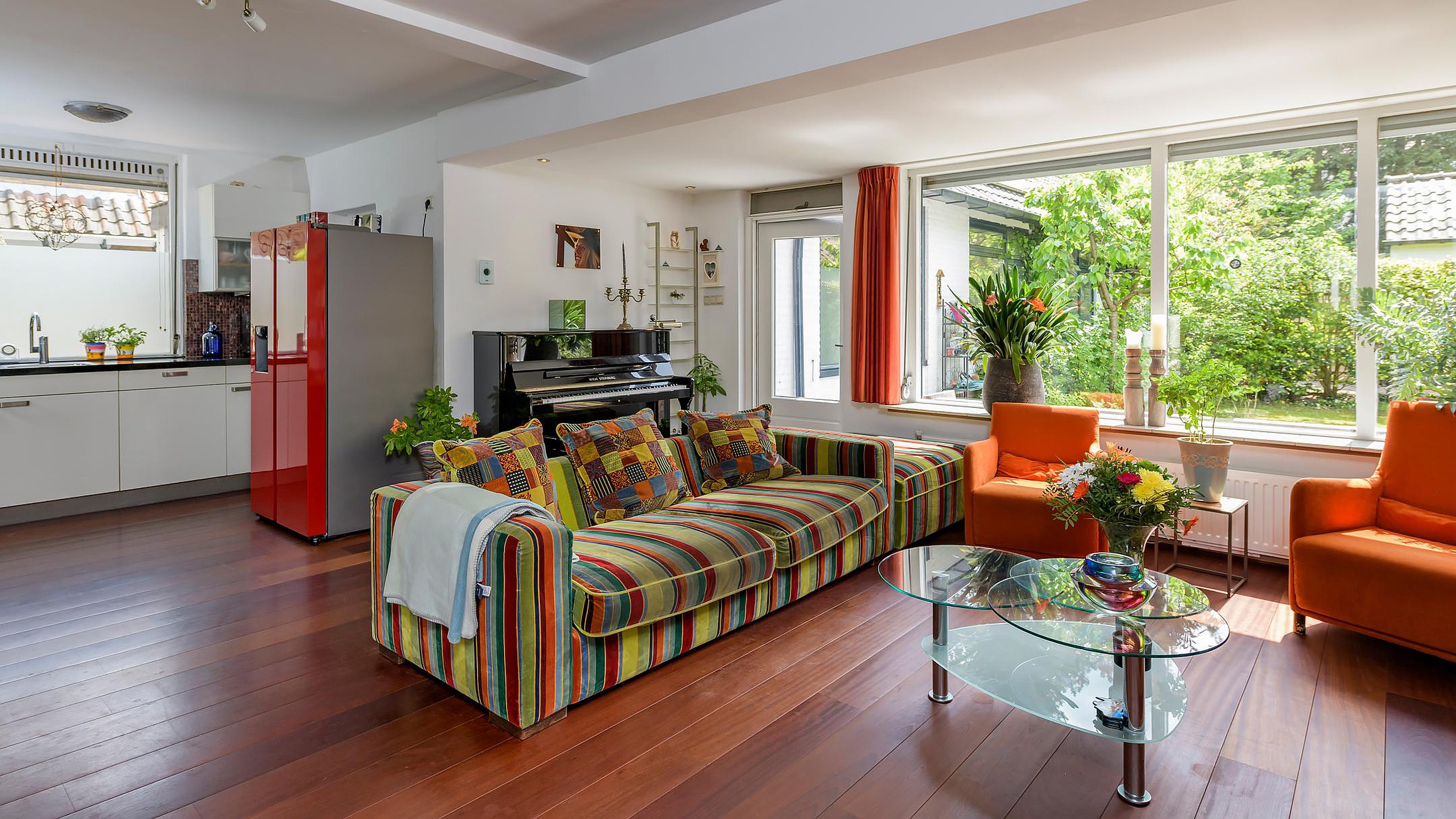 Royale, lichte woonkamer met hardhouten vloer (Jatoba) en sfeervolle houtkachel met ventilatorsysteem.