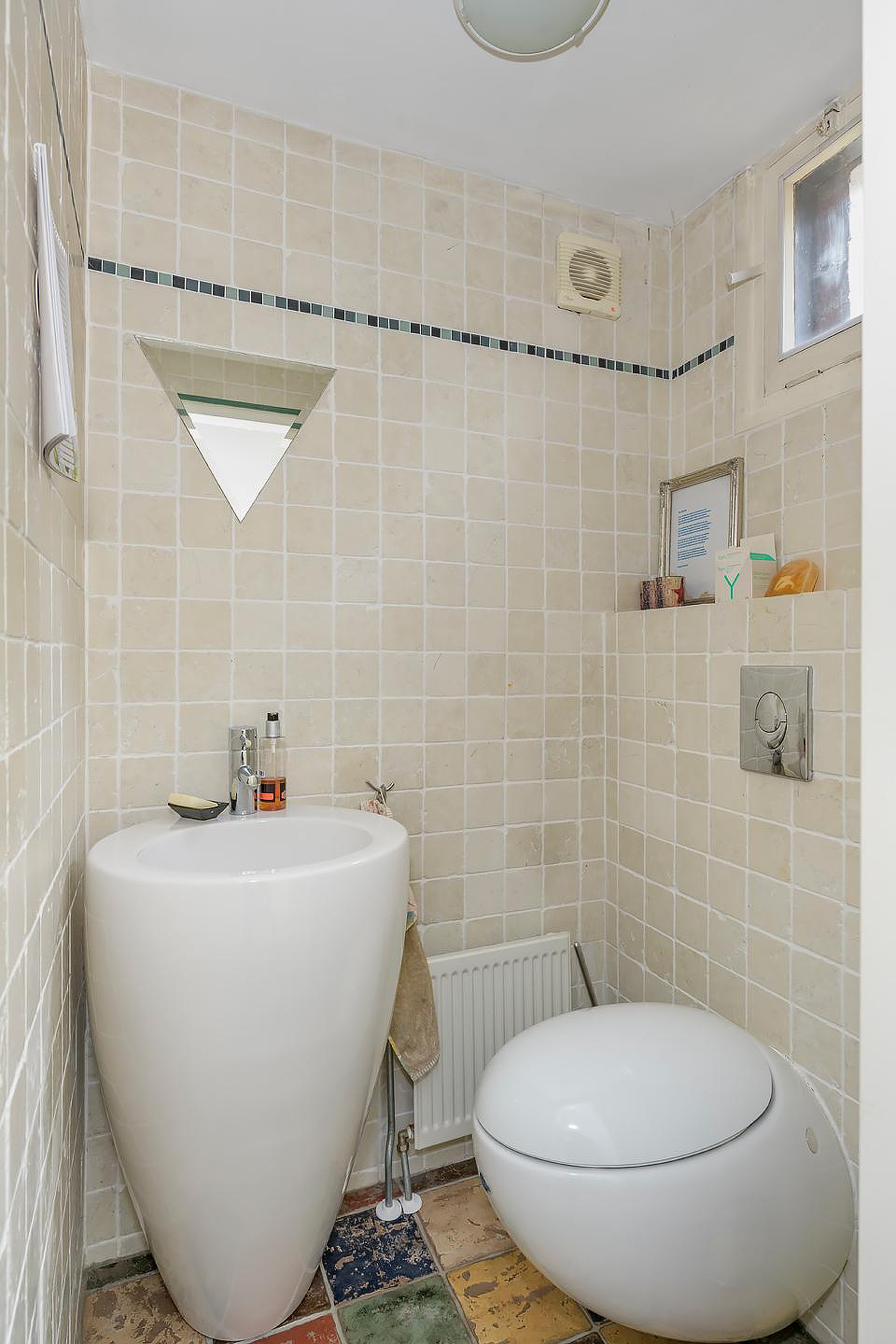 Entree/hal met toilet en designfontein (Alessi), trapopgang en toegang tot kelder (ca. 13 m2, ideaal als provisie- of wijnkelder).