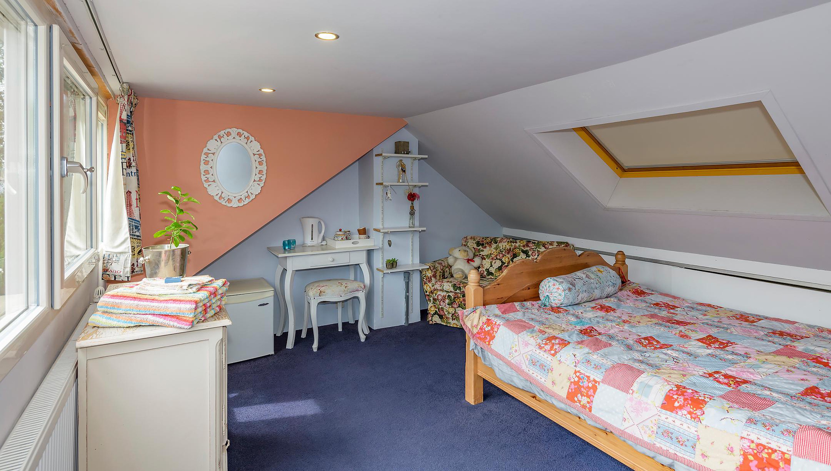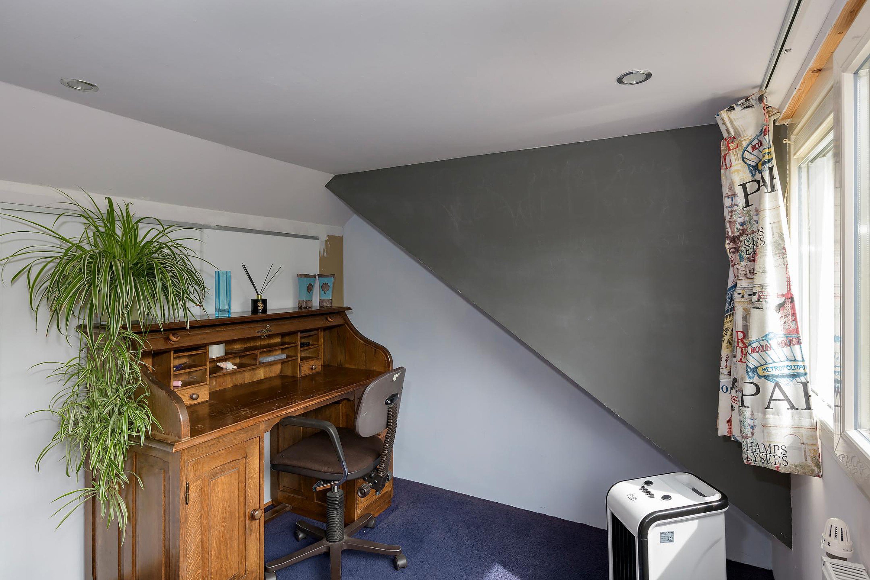 Ruime zolderkamer met dakkapel over de volle breedte, geschikt als slaap-/logeerkamer, werk- of hobbyruimte.