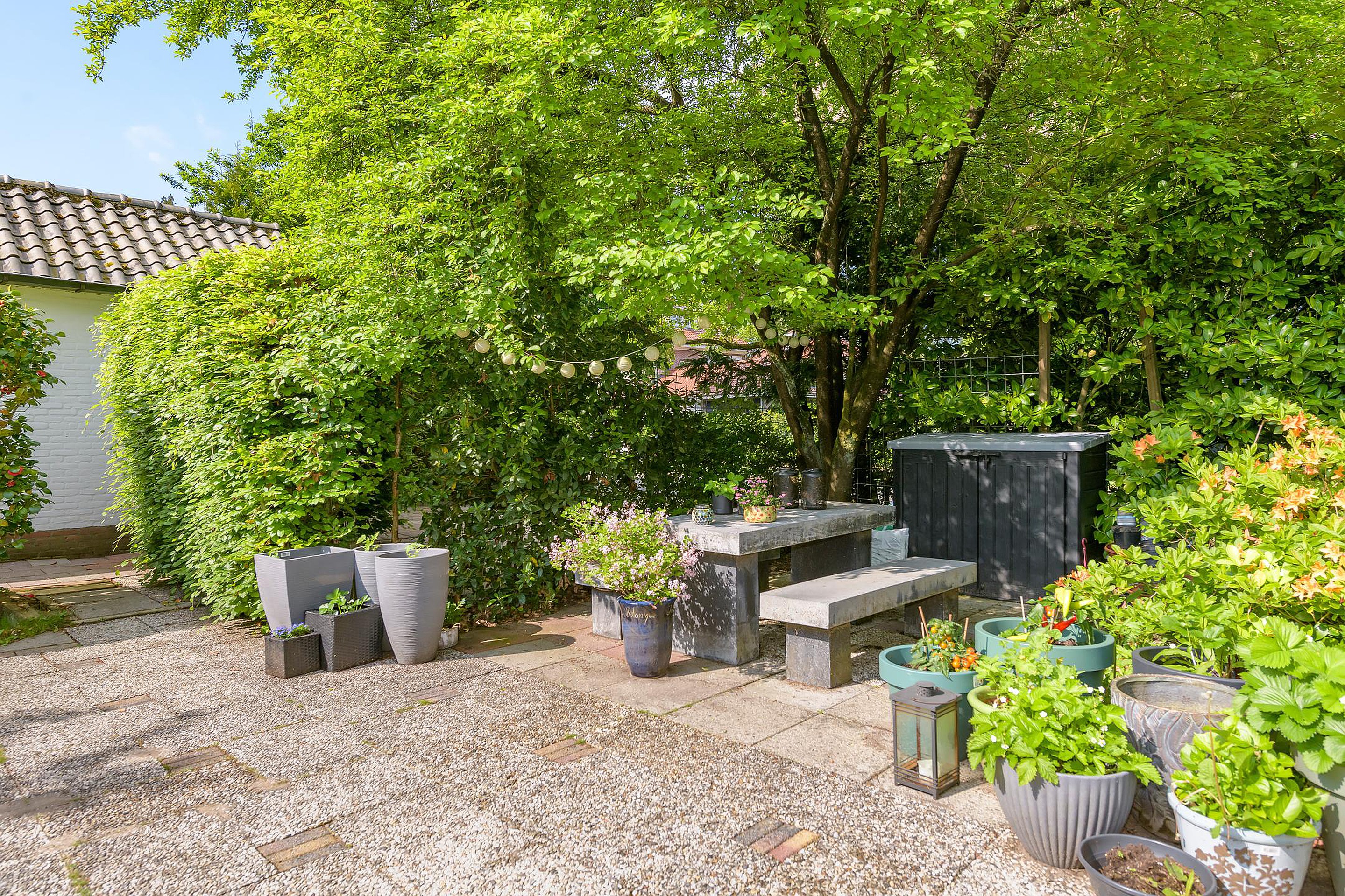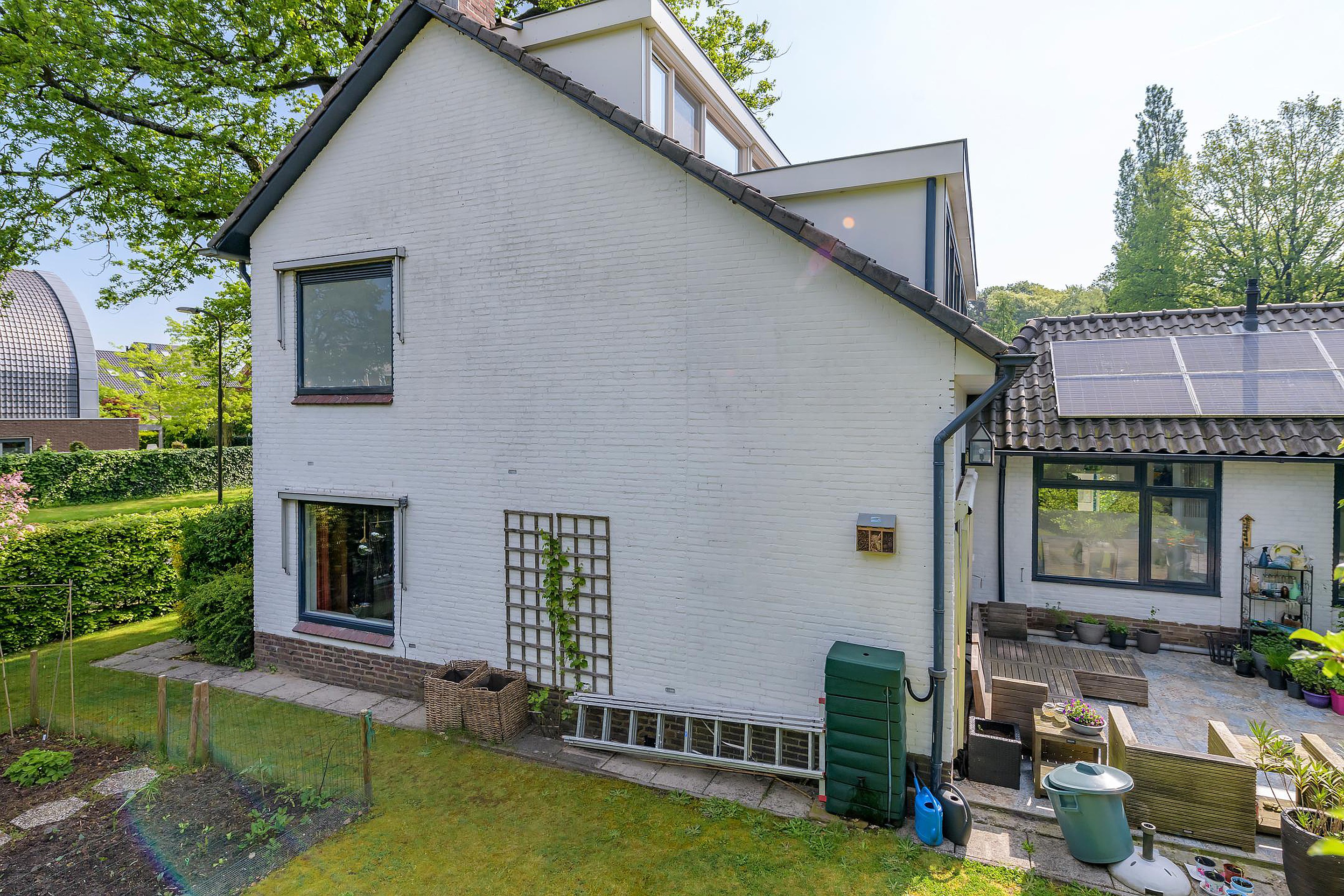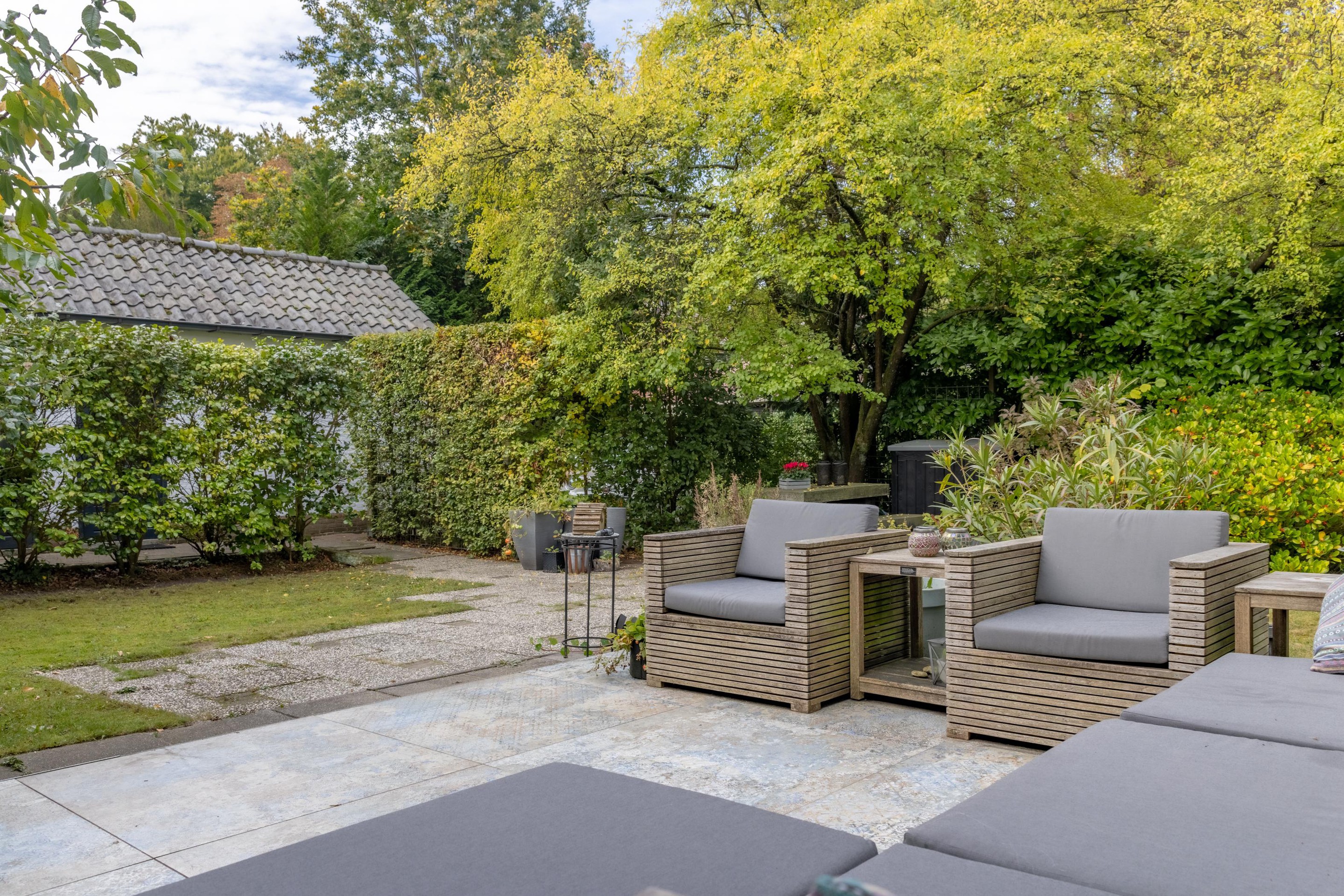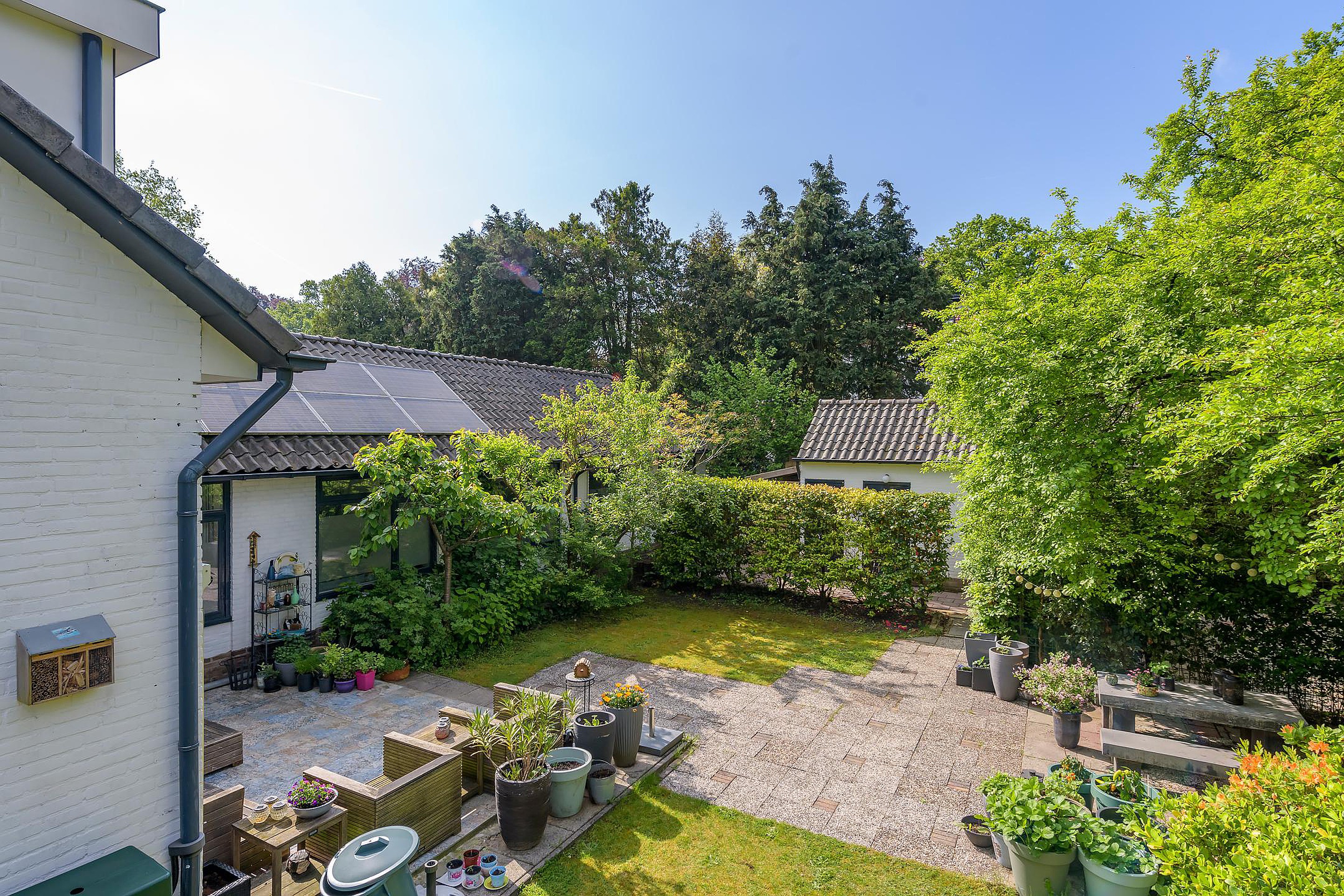 De besloten achtertuin op het zuiden biedt veel privacy en is ingericht met terrassen, een moestuin en diverse fruit- en notenbomen. Via de Meester van Hasseltlaan bereikt u de garage met bergzolder en de oprit met ruimte voor meerdere auto’s.