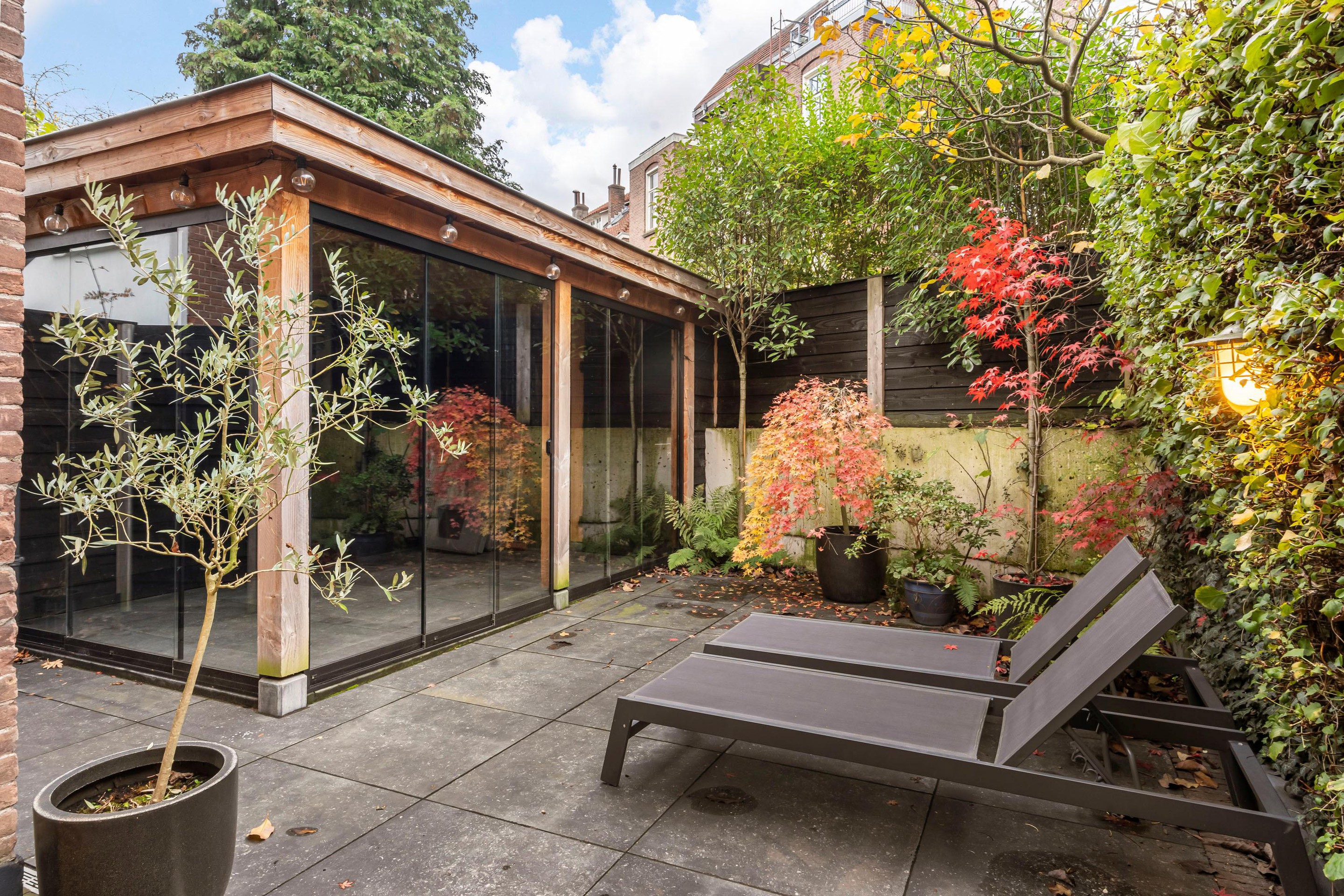 Via de openslaande glazen pui stap je in de stadstuin: een knusse, beschutte buitenruimte met houten veranda. Deze veranda is volledig afsluitbaar met glazen panelen, zodat je er het hele jaar door kunt genieten — van een zomerse barbecue tot een winterse borrel bij kaarslicht. Achter de veranda bevindt zich een extra berging en de tuin is eveneens bereikbaar via een poortdeur.