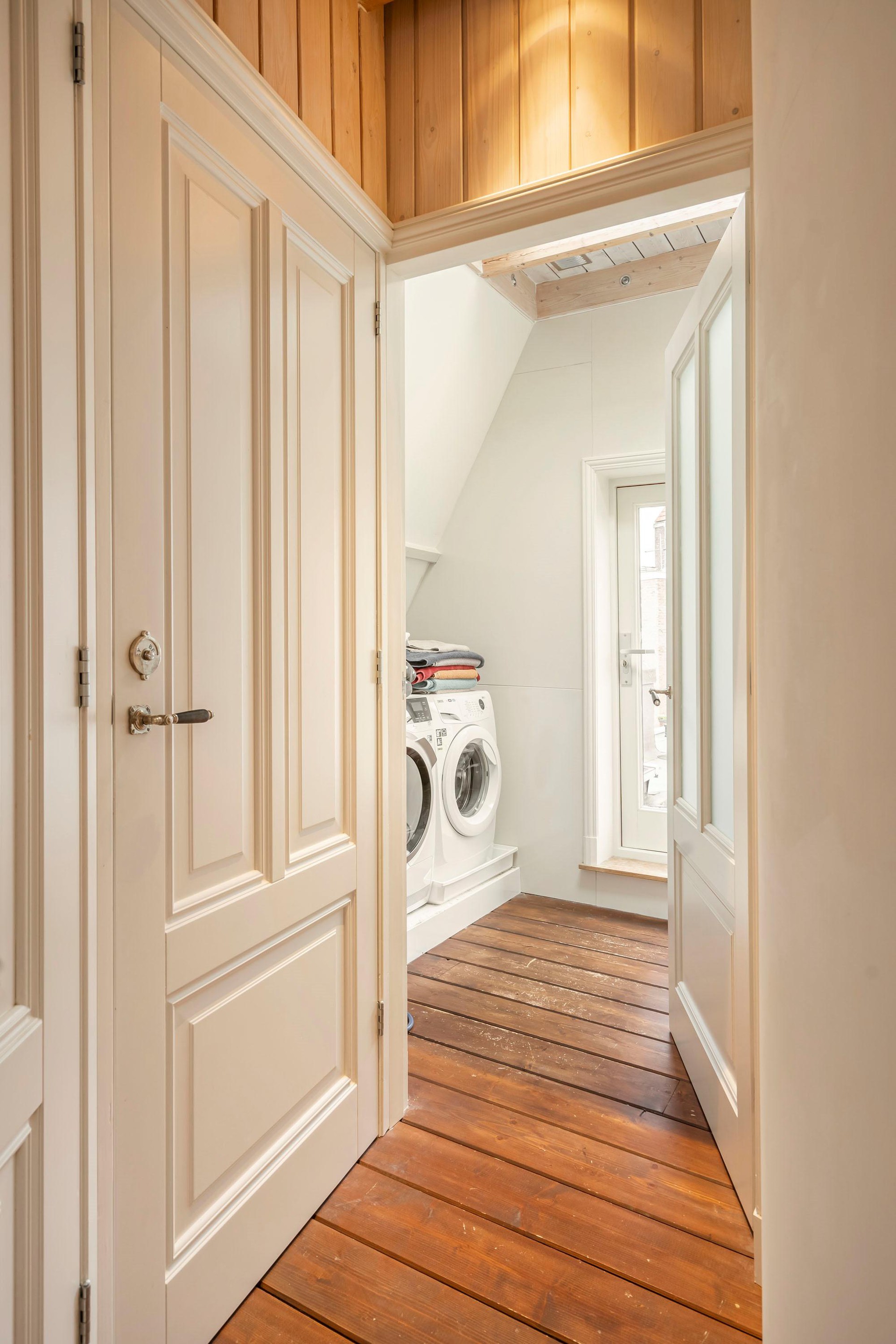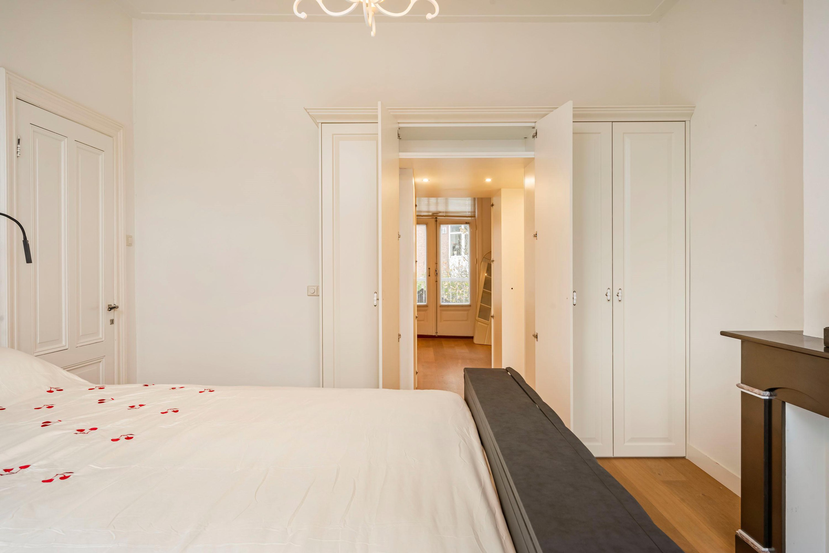 De master bedroom aan de voorzijde is ruim, licht en elegant. De maatwerk kastenwand biedt volop bergruimte en is volledig in stijl met de woning ontworpen. Ook hier is de materiaalkeuze weer van bijzonder hoog niveau. Een bijzondere doorgang in deze kastenwand leidt naar een tweede kamer welke perfect gebruikt kan worden als walk-in closet, eveneens zeer hoogwaardig afgewerkt, met toegang tot een fraai dakterras. Hier is het ’s avonds heerlijk vertoeven - een zeldzaam stukje privé buitenruimte midden in de stad.