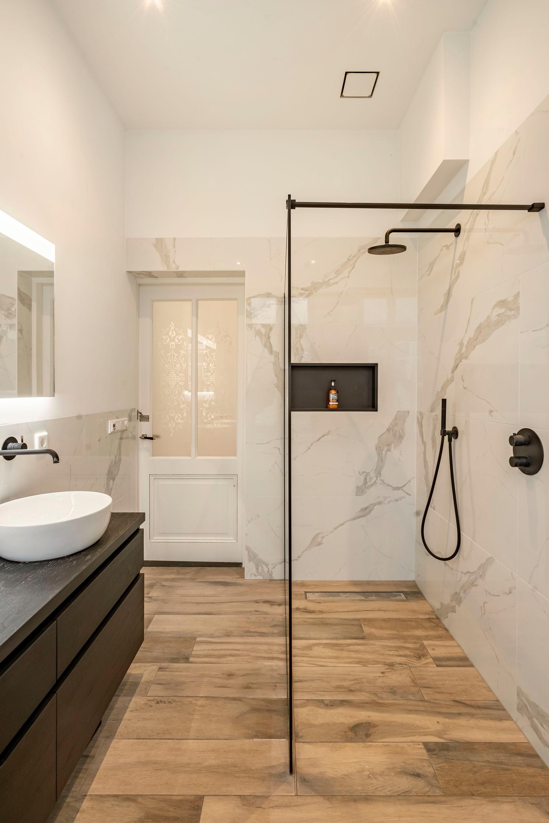 De badkamer is een oase van rust en stijl: een vrijstaand ligbad, ruime inloopdouche, dubbel wastafelmeubel en elektrische vloerverwarming maken het geheel compleet. De materialen zijn zorgvuldig gekozen en de afwerking is tot in perfectie uitgevoerd en staat op eenzame hoogte.
