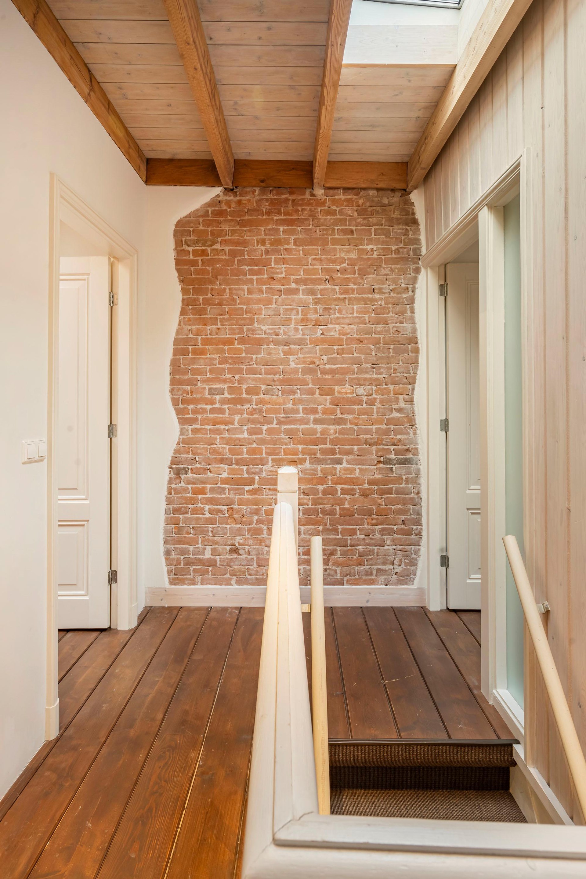 De bovenste verdieping verrast opnieuw met haar ruimtelijkheid en karakter. Drie volwaardige slaapkamers bieden plaats aan gezin, gasten of hobby’s. Het zichtbare metselwerk, de houten spanten en de subtiele verlichting creëren een bijzondere, warme sfeer. De wanden zijn op de houten vloer geplaatst, zodat een eventuele aanpassing in de indeling binnen handomdraai gerealiseerd kan worden.