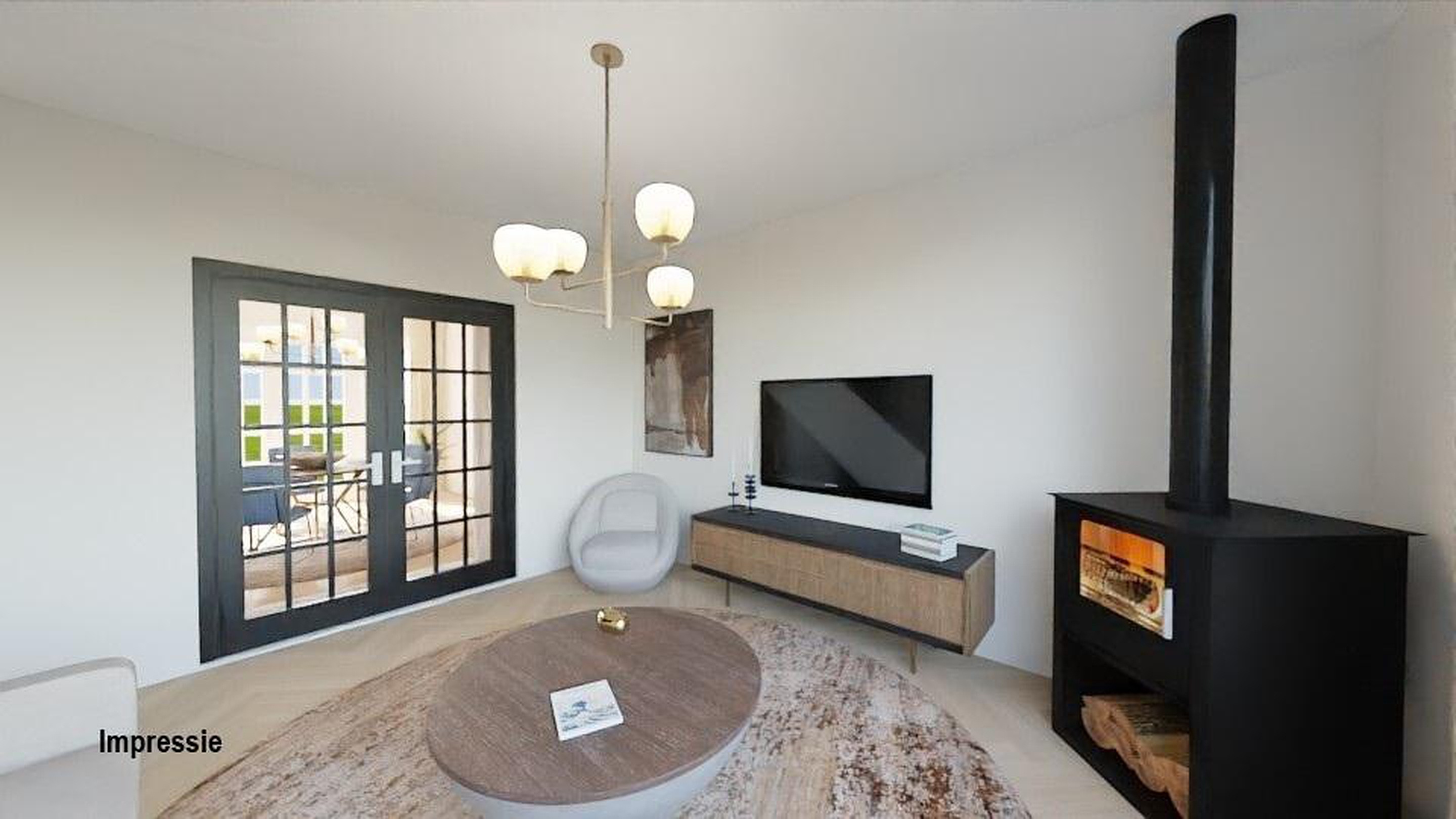 De ruimte is afgewerkt met een houtenvloer, structuur geverfde wanden en een gestuukt plafond met sierlijsten.