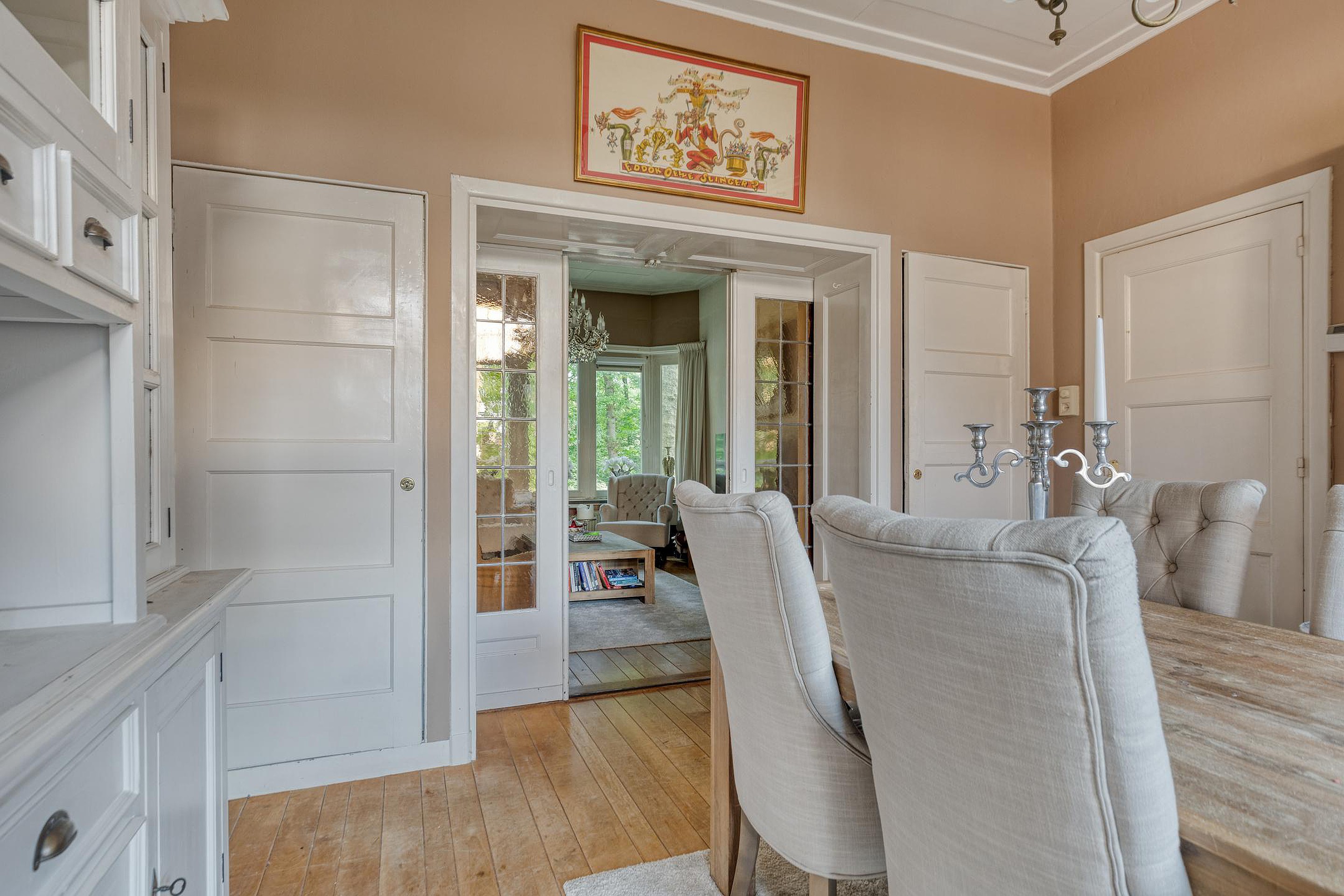 Bij een statig huis als dit hoort ook een aparte eetkamer. De eetkamer heeft een mooie haardpartij waar je en houtkachel kunt plaatsen en via de openslaande deuren is er toegang tot tuin. Ook in de achterpui is het glas-in-lood nog volop aanwezig. Met een royale eettafel kun je hier uren tafelen met familie en vrienden.