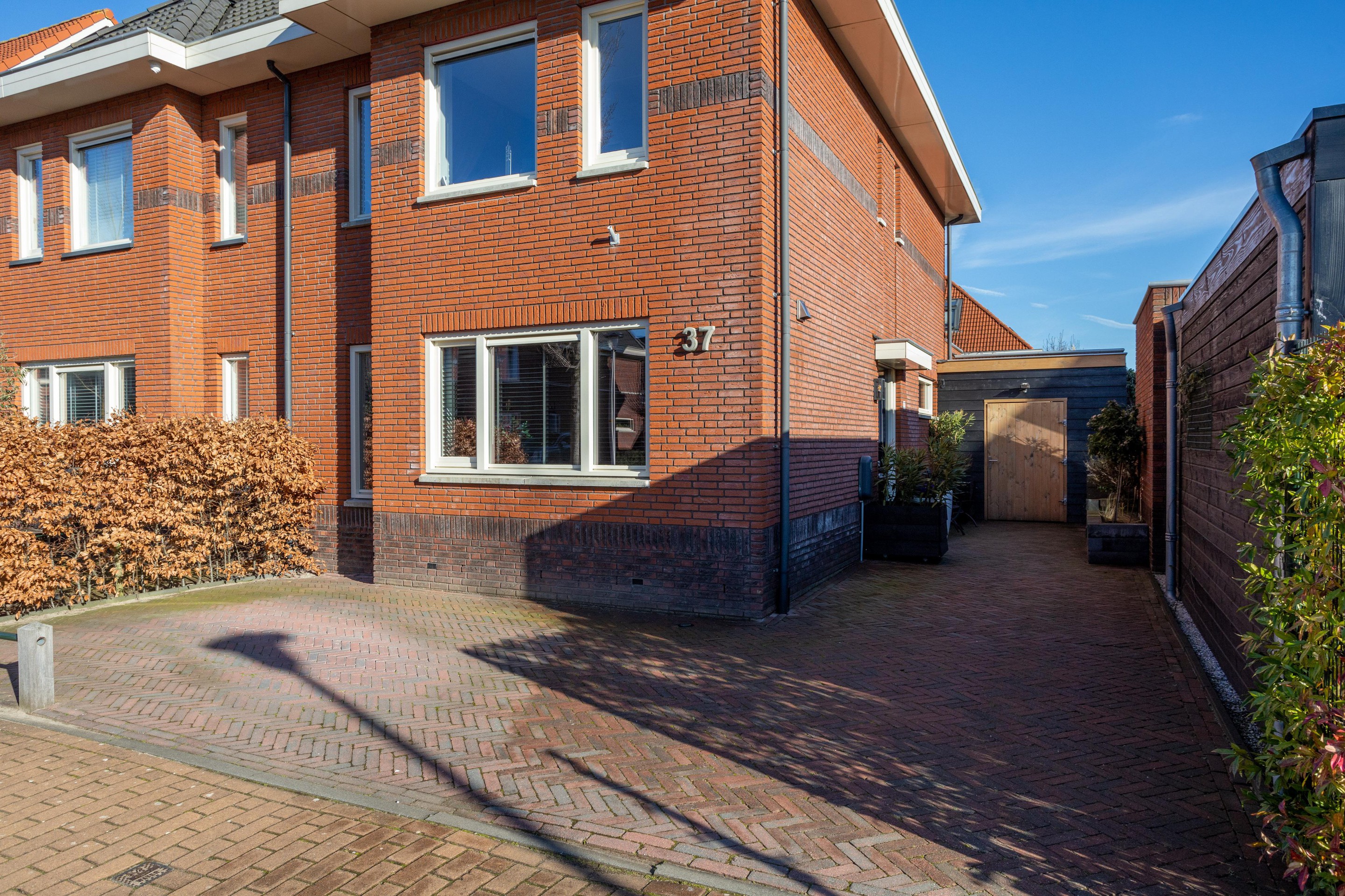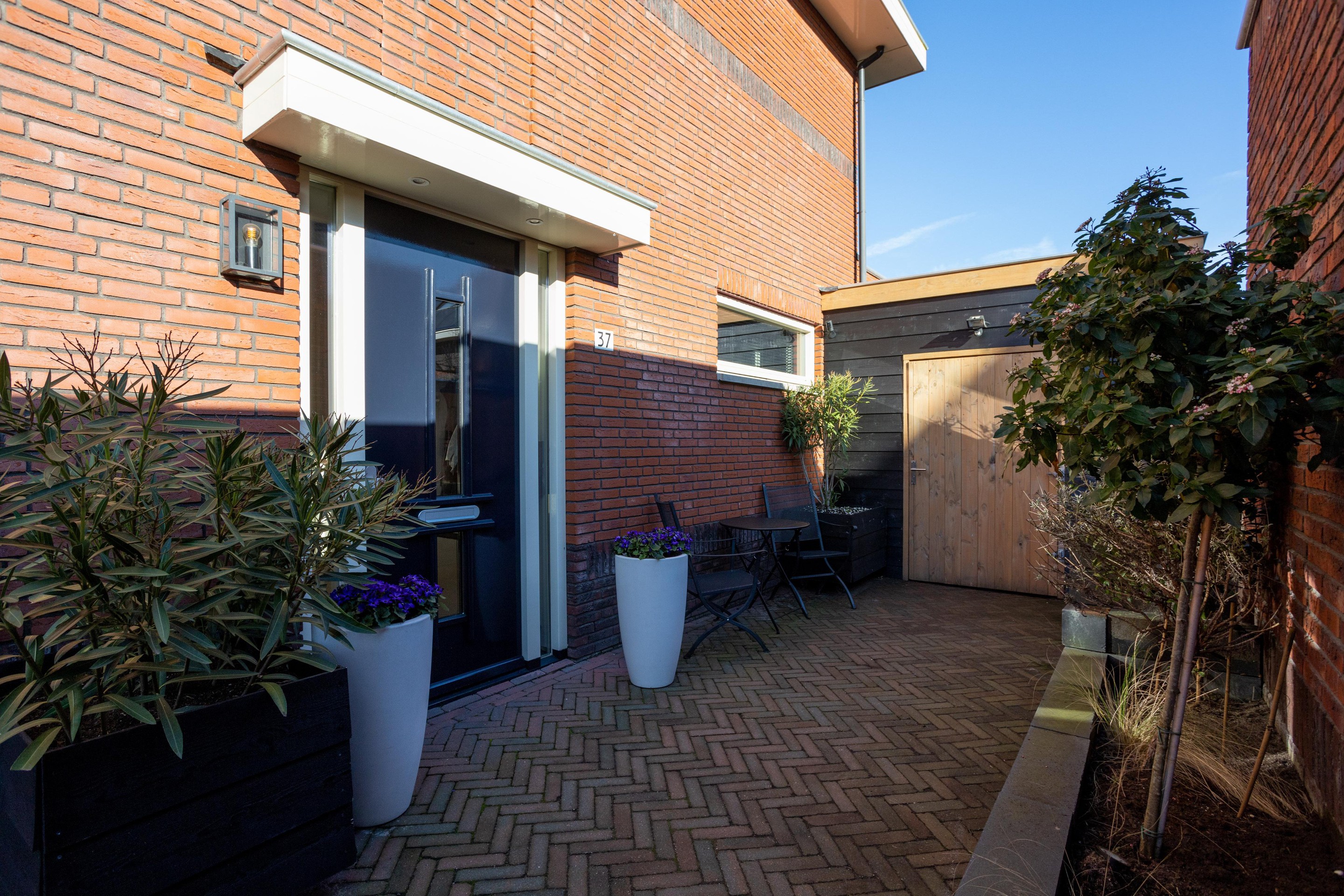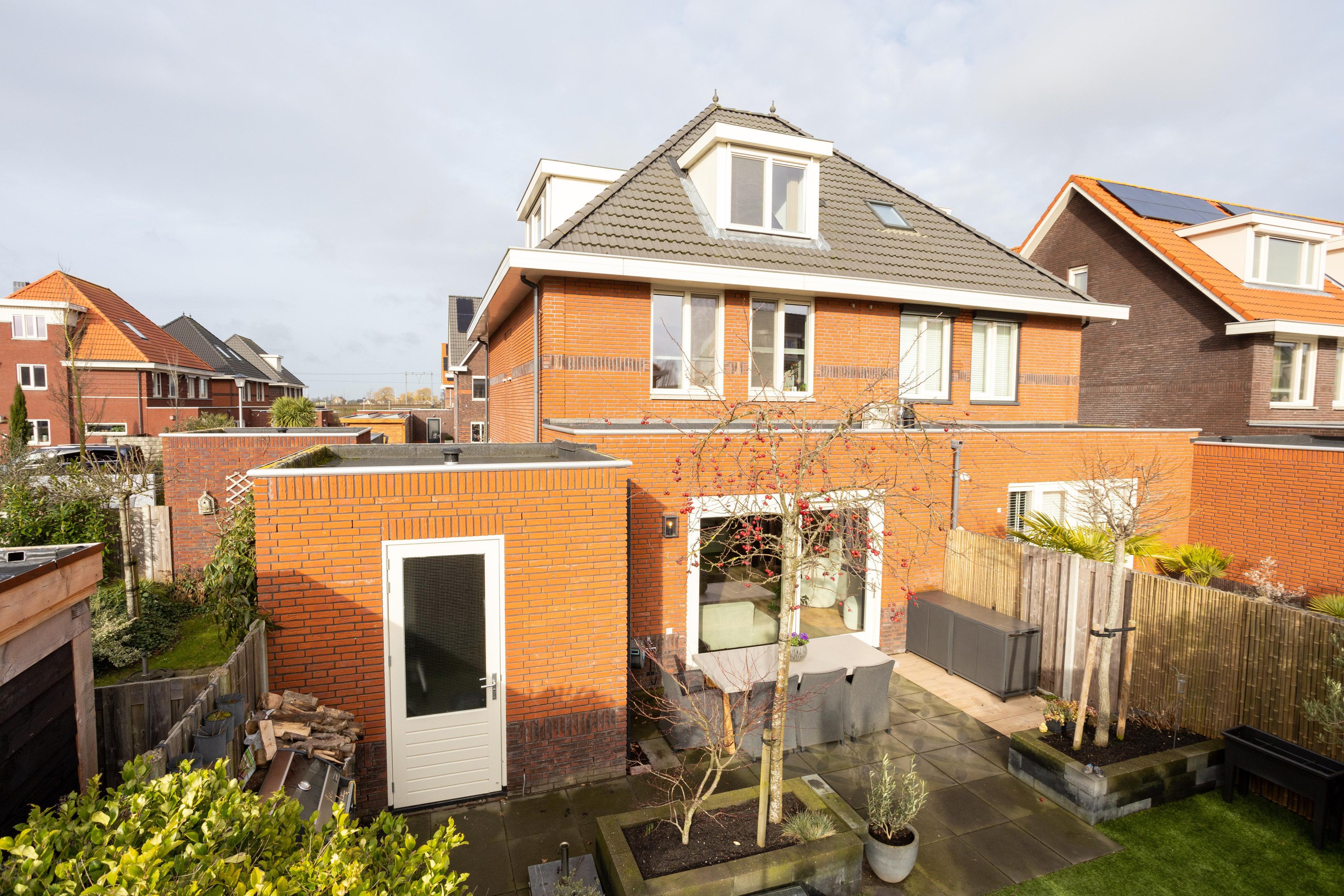 De prachtige en ruim opgezette achtertuin is gelegen op het zuidoosten en beschikt over een fraaie overkapping. Heerlijk genieten van de zon! Aan de voorzijde van de stenenberging is een riante houten voorzetschuur geplaatst, zodoende voldoende ruimte voor extra fietsen.