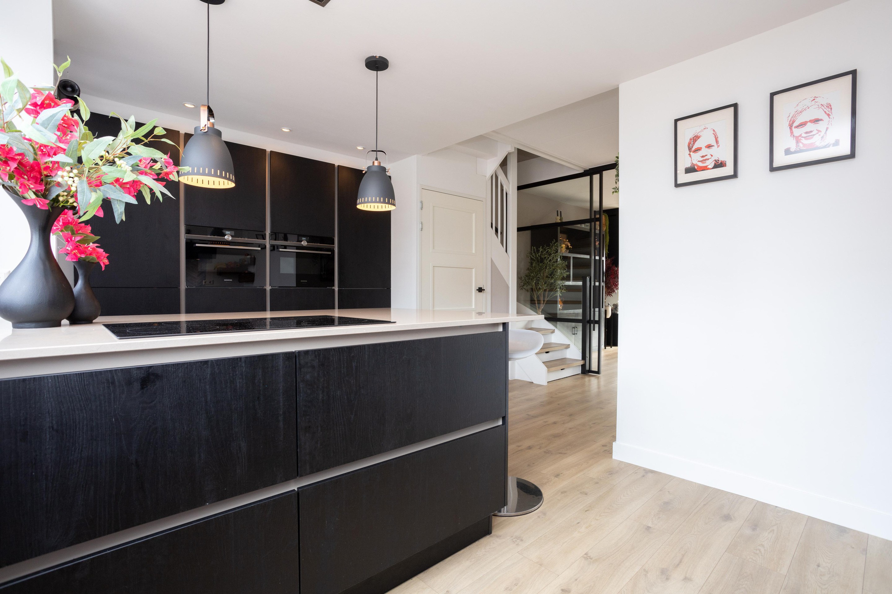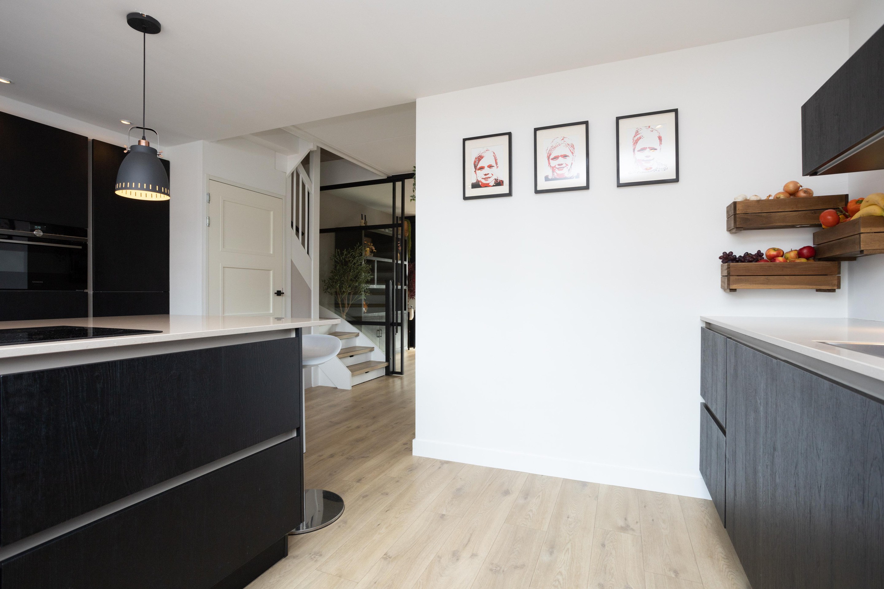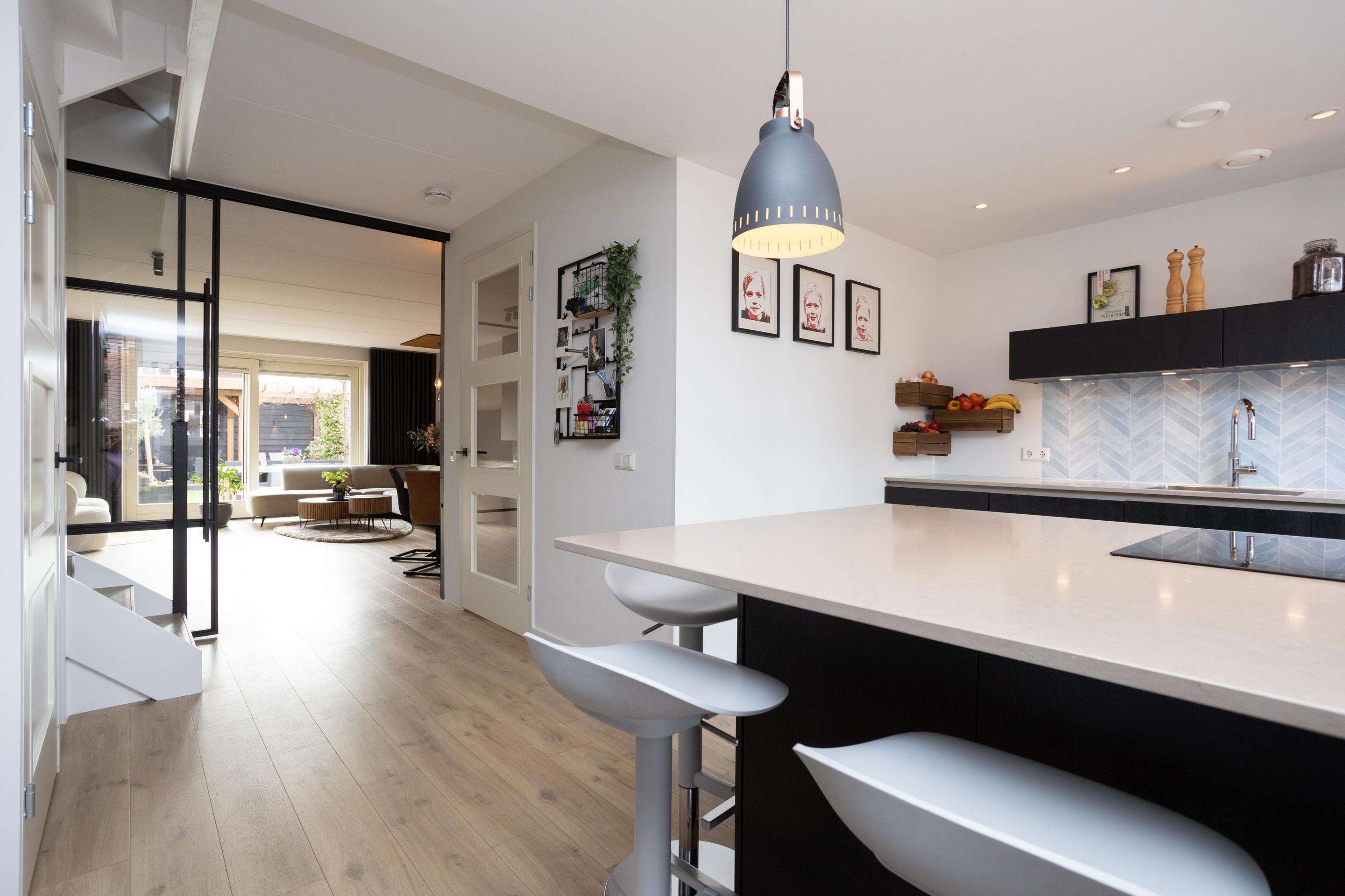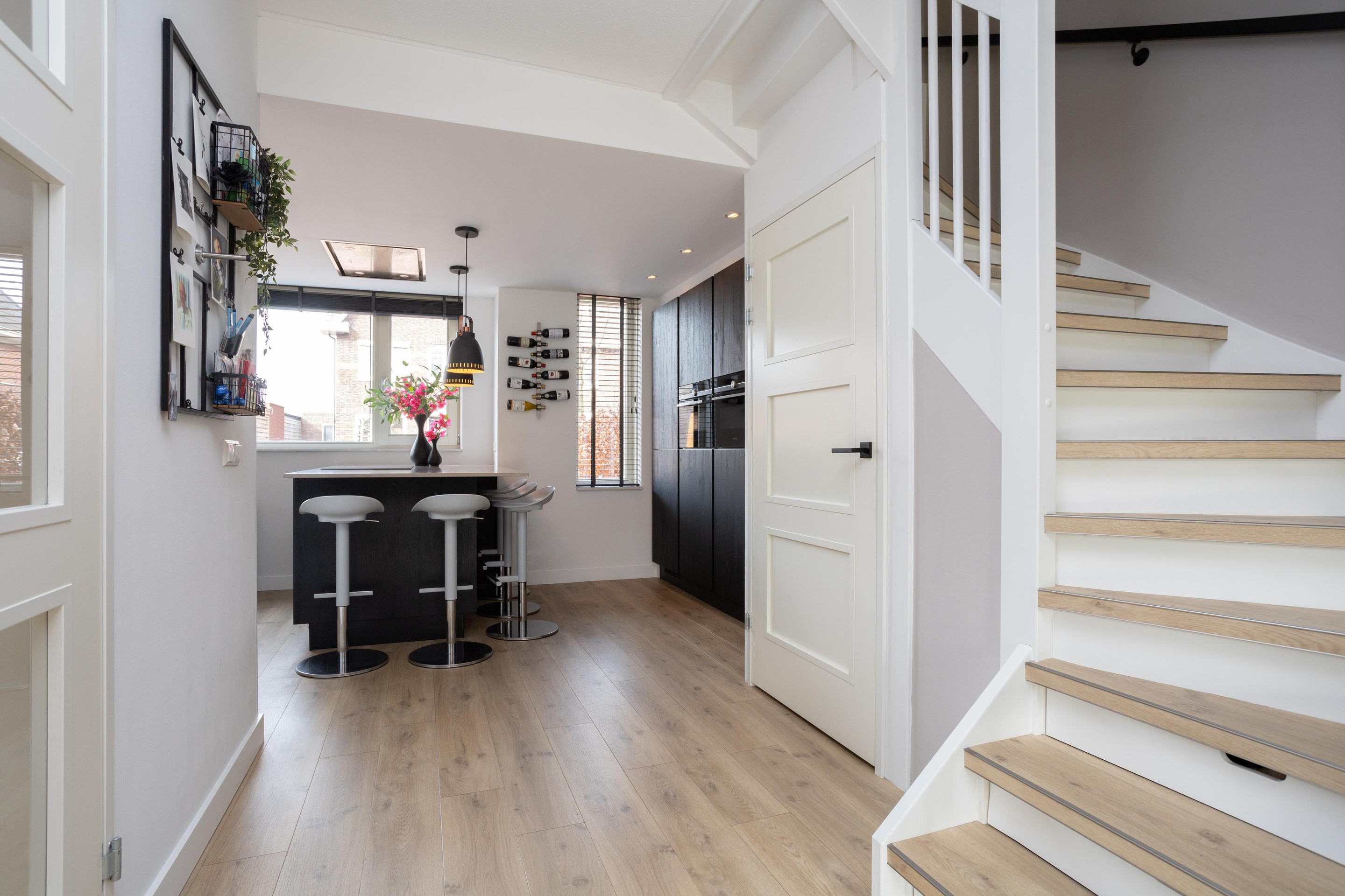 Entree woning; hal met meterkast; toiletruimte met hangend closet en fonteintje en toegang tot de riante living. Bij binnenkomst vallen direct de prachtige raampartijen op, heerlijk al dat licht. Op de vloer prachtig PVC en de gashaard maakt het geheel af. Tussen woonkamer en keuken is een moderne stalen deur geplaatst. De luxe open keuken is aan de voorzijde gelegen en het ontbreekt u hier aan helemaal niets. Quooker, XXL koelkast, combi-oven, stoomoven, vriezer en een vaatwasser. Het geheel is afgewerkt met een composiet blad. Let ook op het plafond, deze is prachtig verlaagd en voorzien van inbouwafzuigkap en inbouwspots. Beide trappen naar de hoger gelegen verdiepingen zijn ook voorzien van PVC.