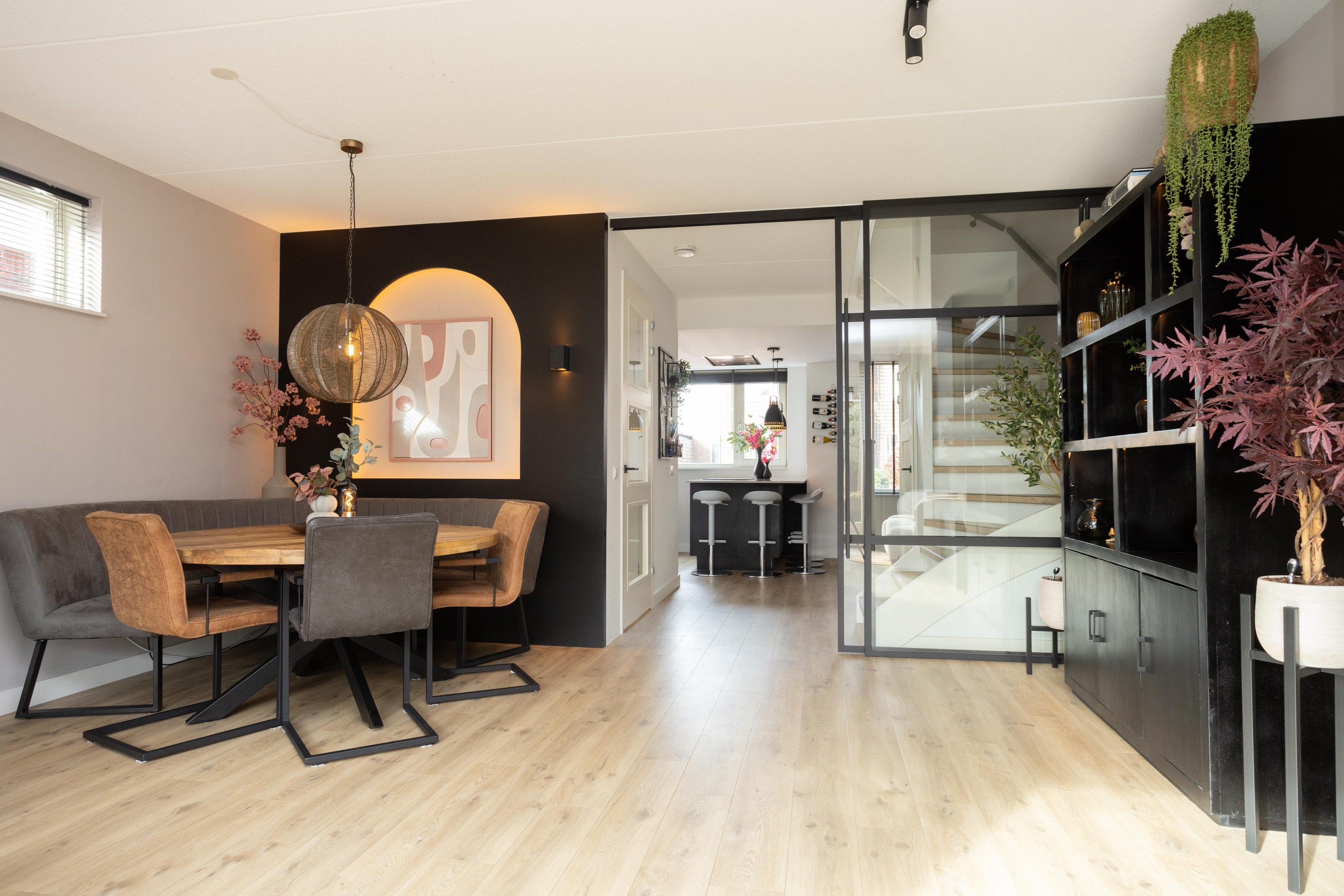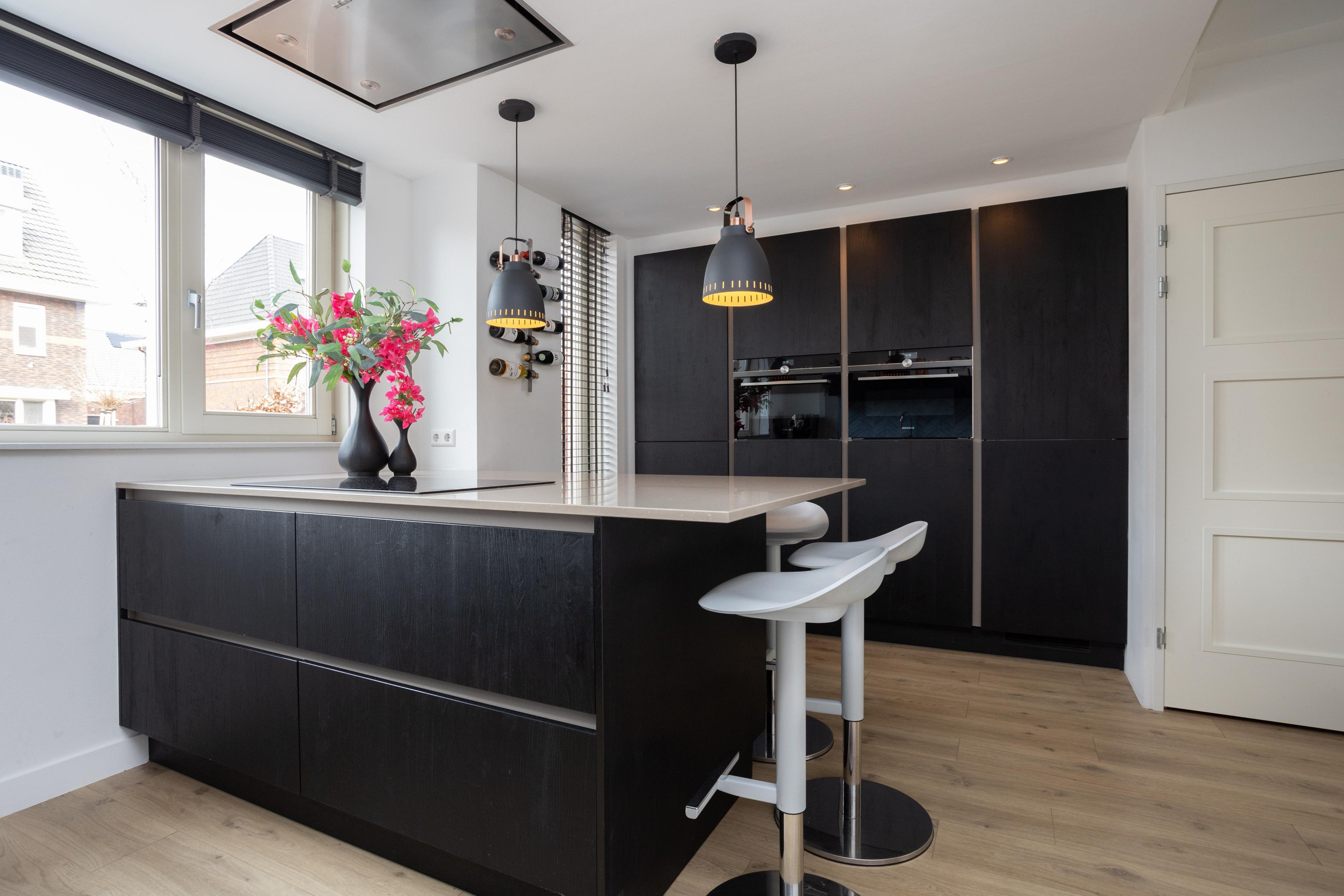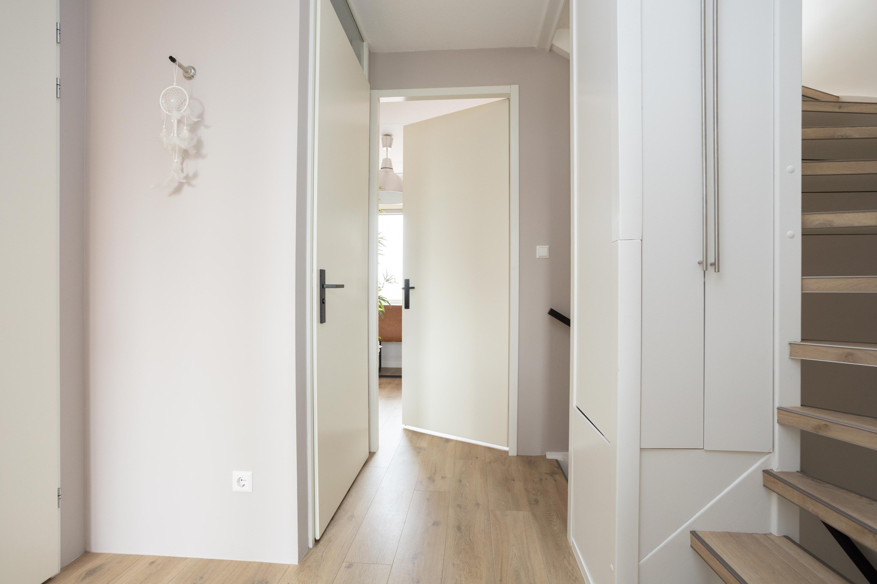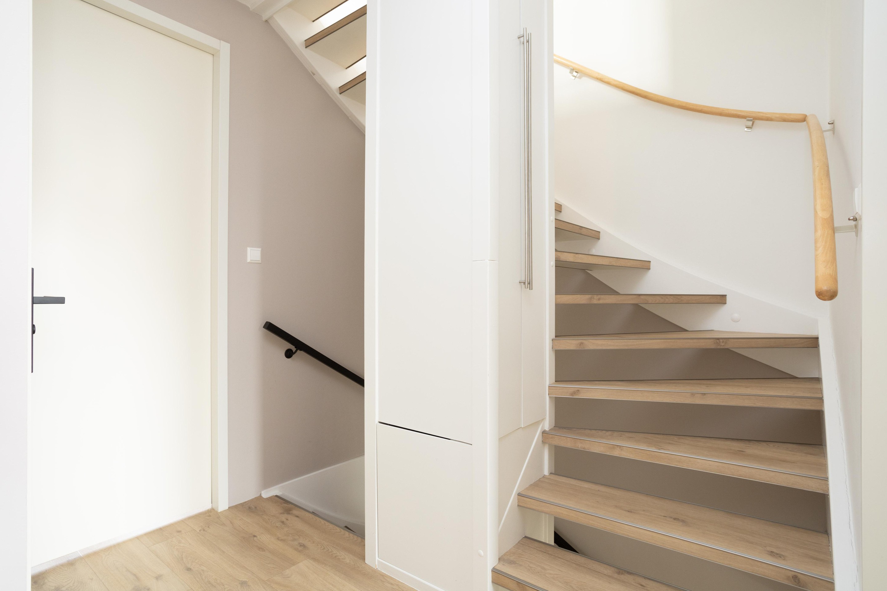 Entree woning; hal met meterkast; toiletruimte met hangend closet en fonteintje en toegang tot de riante living. Bij binnenkomst vallen direct de prachtige raampartijen op, heerlijk al dat licht. Op de vloer prachtig PVC en de gashaard maakt het geheel af. Tussen woonkamer en keuken is een moderne stalen deur geplaatst. De luxe open keuken is aan de voorzijde gelegen en het ontbreekt u hier aan helemaal niets. Quooker, XXL koelkast, combi-oven, stoomoven, vriezer en een vaatwasser. Het geheel is afgewerkt met een composiet blad. Let ook op het plafond, deze is prachtig verlaagd en voorzien van inbouwafzuigkap en inbouwspots. Beide trappen naar de hoger gelegen verdiepingen zijn ook voorzien van PVC.