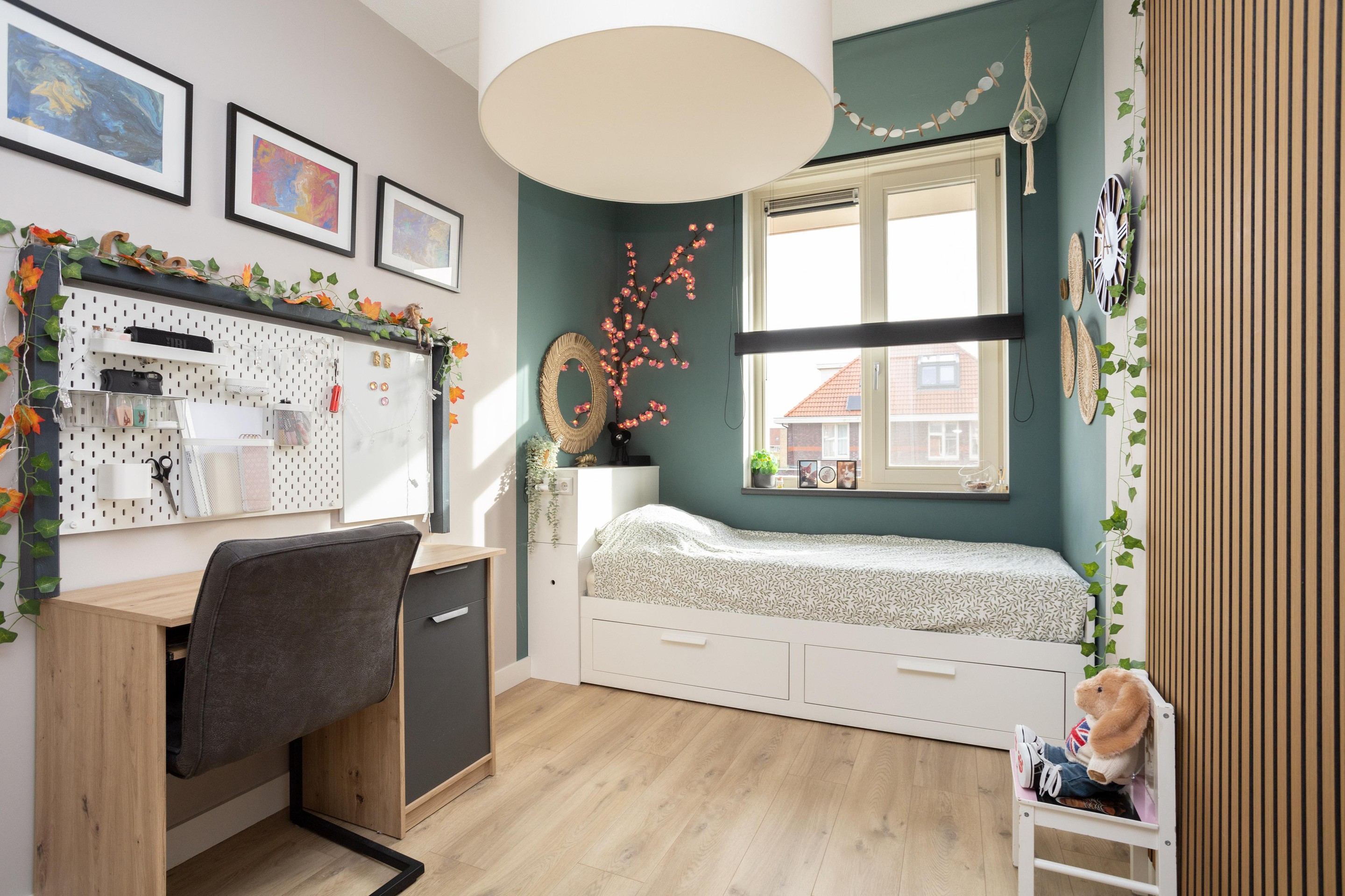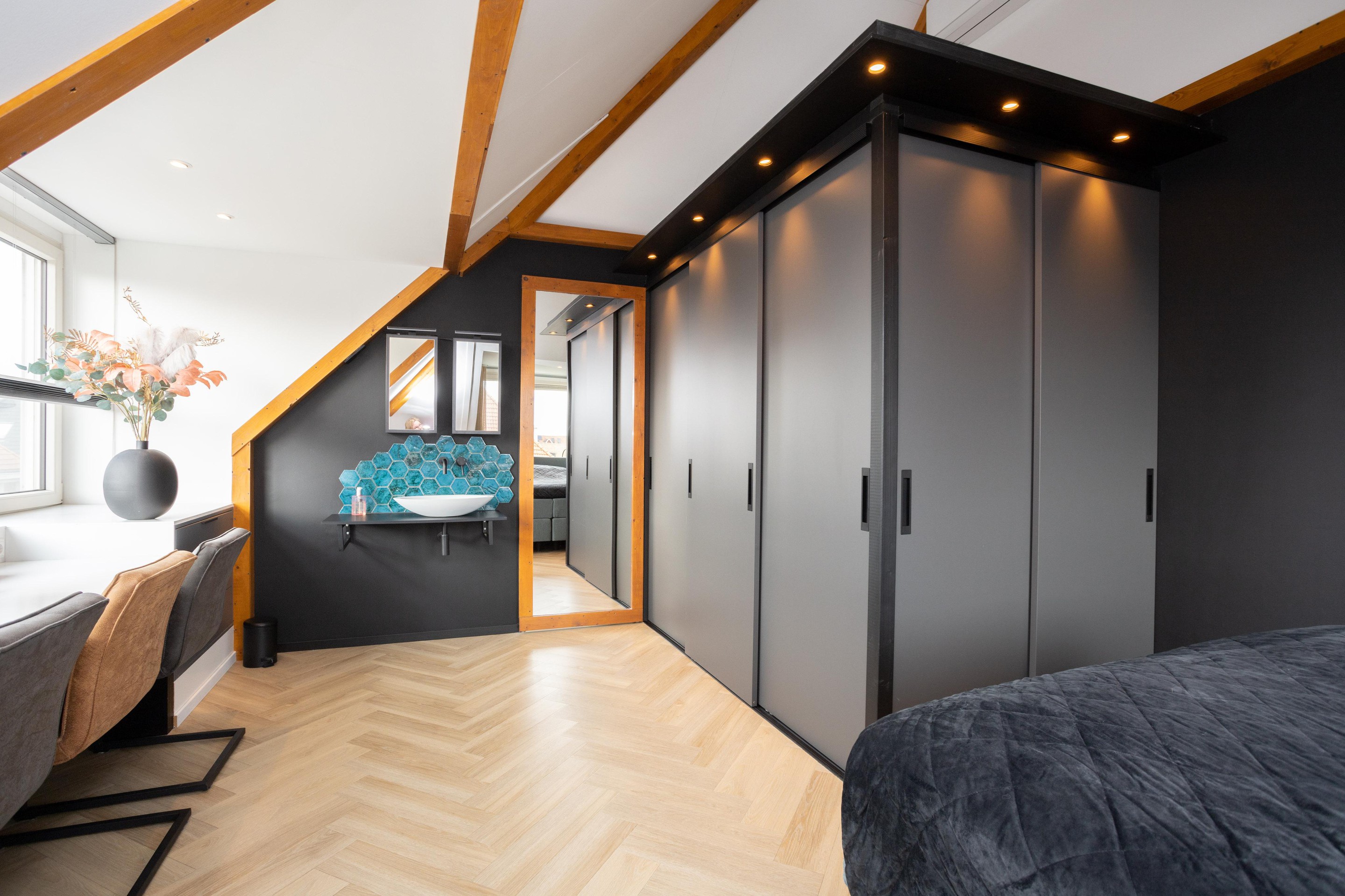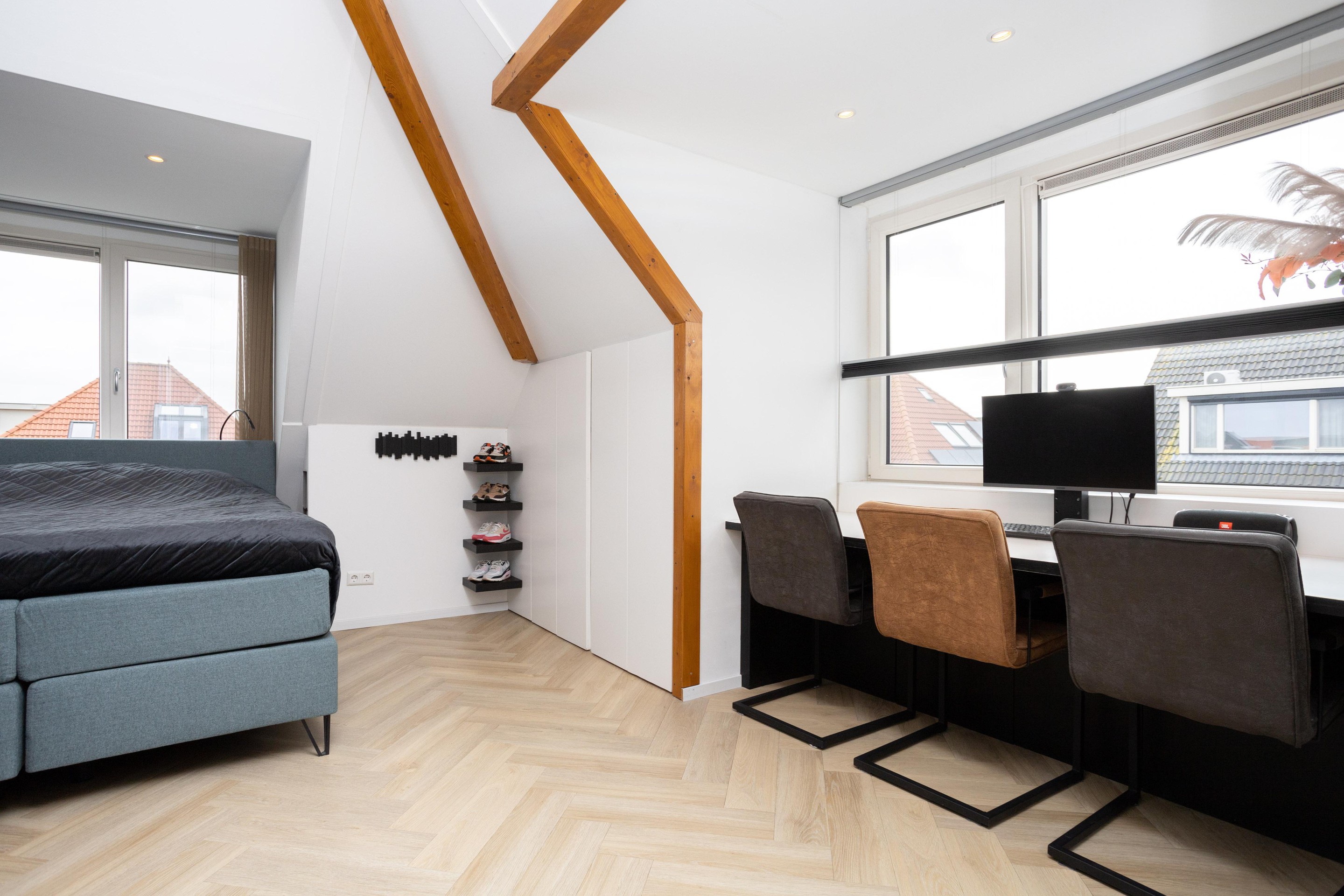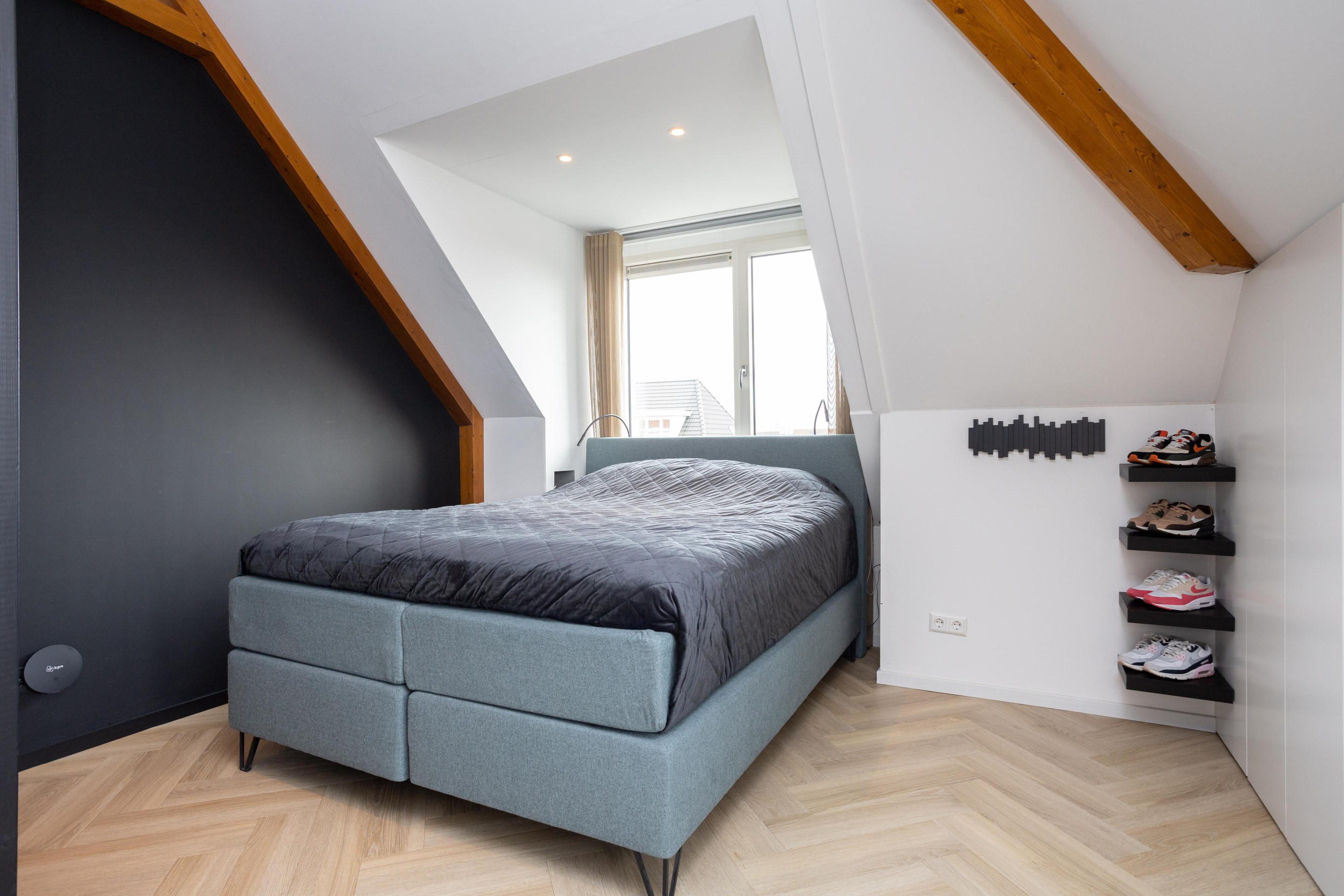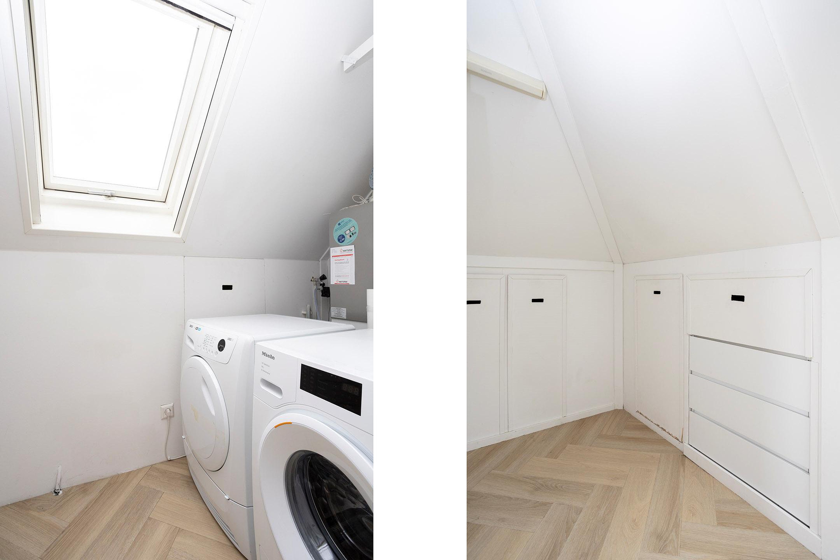 Wat is dit een geweldige verdieping. Een verdieping met 2 dakkapellen (beide zijn voorzien van sunscreens). Hier treft u de vierde slaapkamer aan, voorzien van een wastafel. Heel praktisch is de hoeveelheid bergruimte. Tot slot is er nog een aparte ruimte met opstelling van de hybride warmtepomp, de wasmachine en wasdroger.