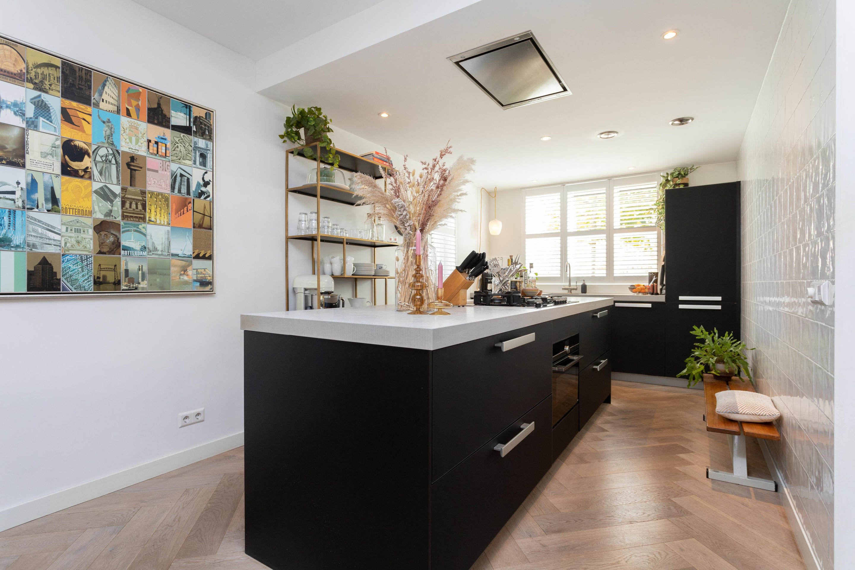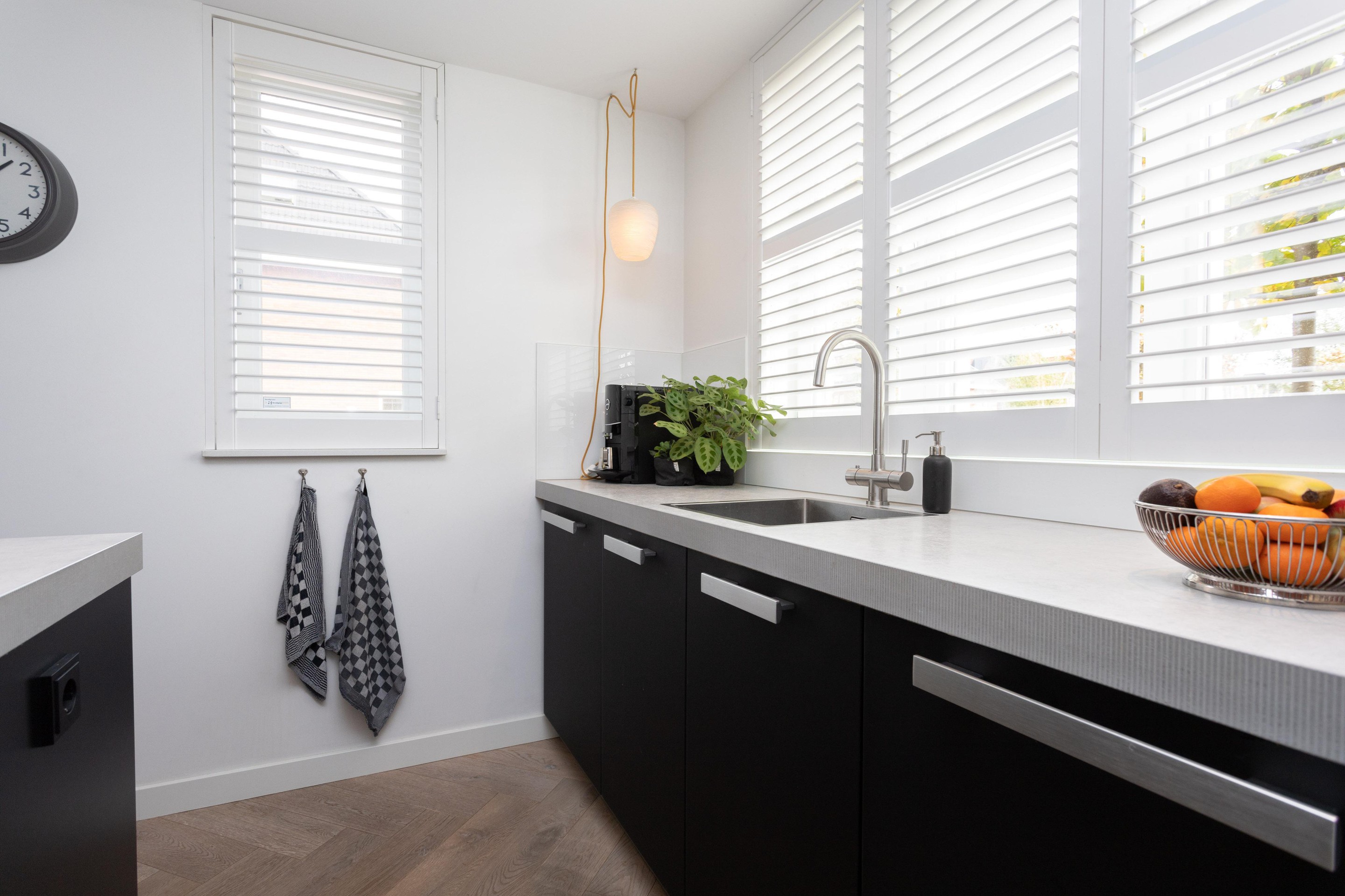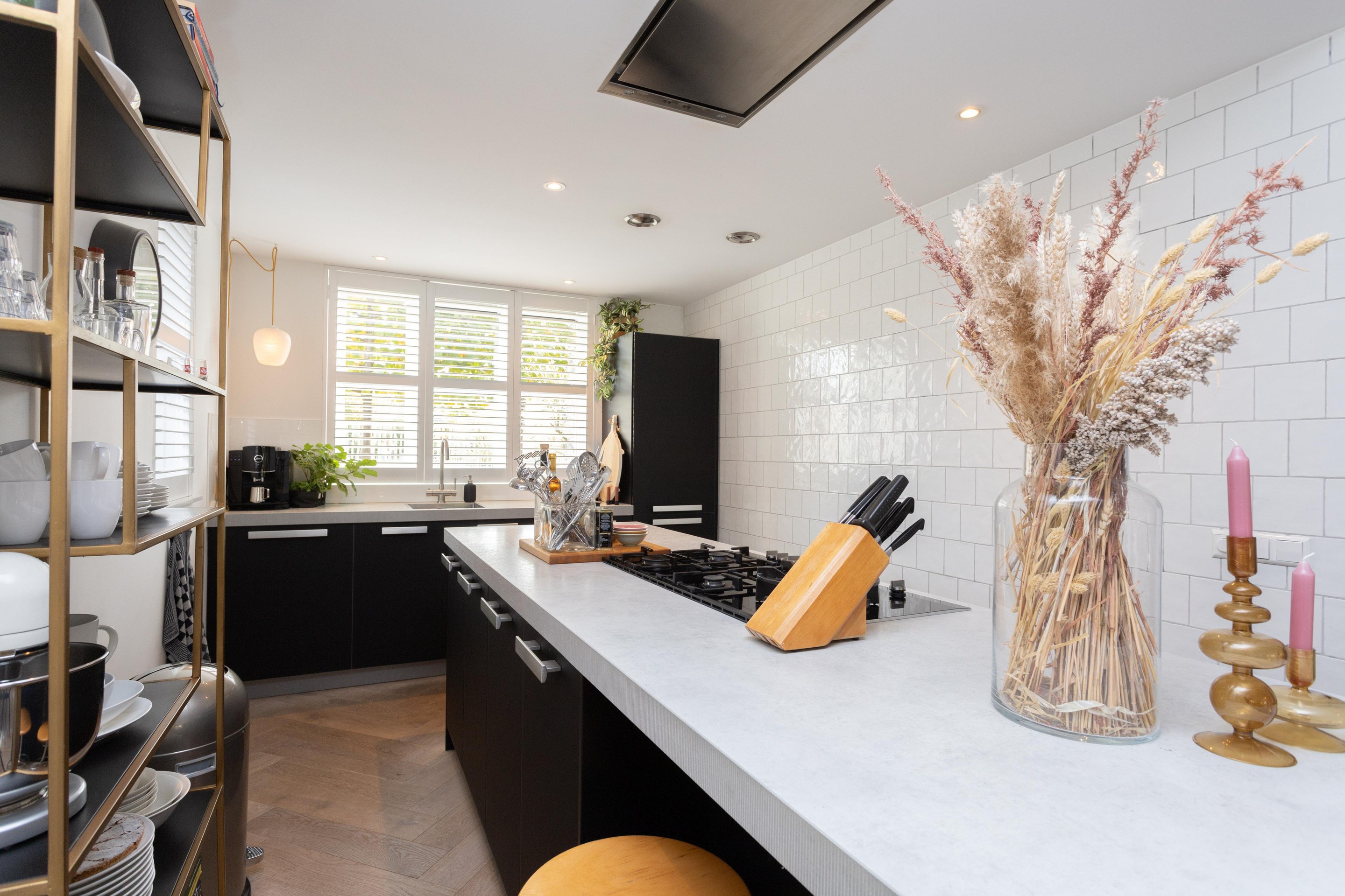 Hal met meterkast, toilet met fonteintje en toegang tot de ruime woonkamer. In de woonkamer prachtig parket in visgraat motief en een ingebouwde elektrische sfeerhaard; wat een luxe! Zwarte steel-look deuren naar de hal en de trapkast. Let ook op de wanden en plafond; strak gestuukt! En dan de open keuken aan de voorzijde; dit is ook één van de eyecatchers van de woning. Aan alles is gedacht: een groot kookeiland met bar, 5 pits gaskookplaat, design afzuigkap, multifunctionele oven, koelkast, vriezer, kokendwaterkraan, vaatwasser en het geheel is afgewerkt met een beton-look aanrechtblad.