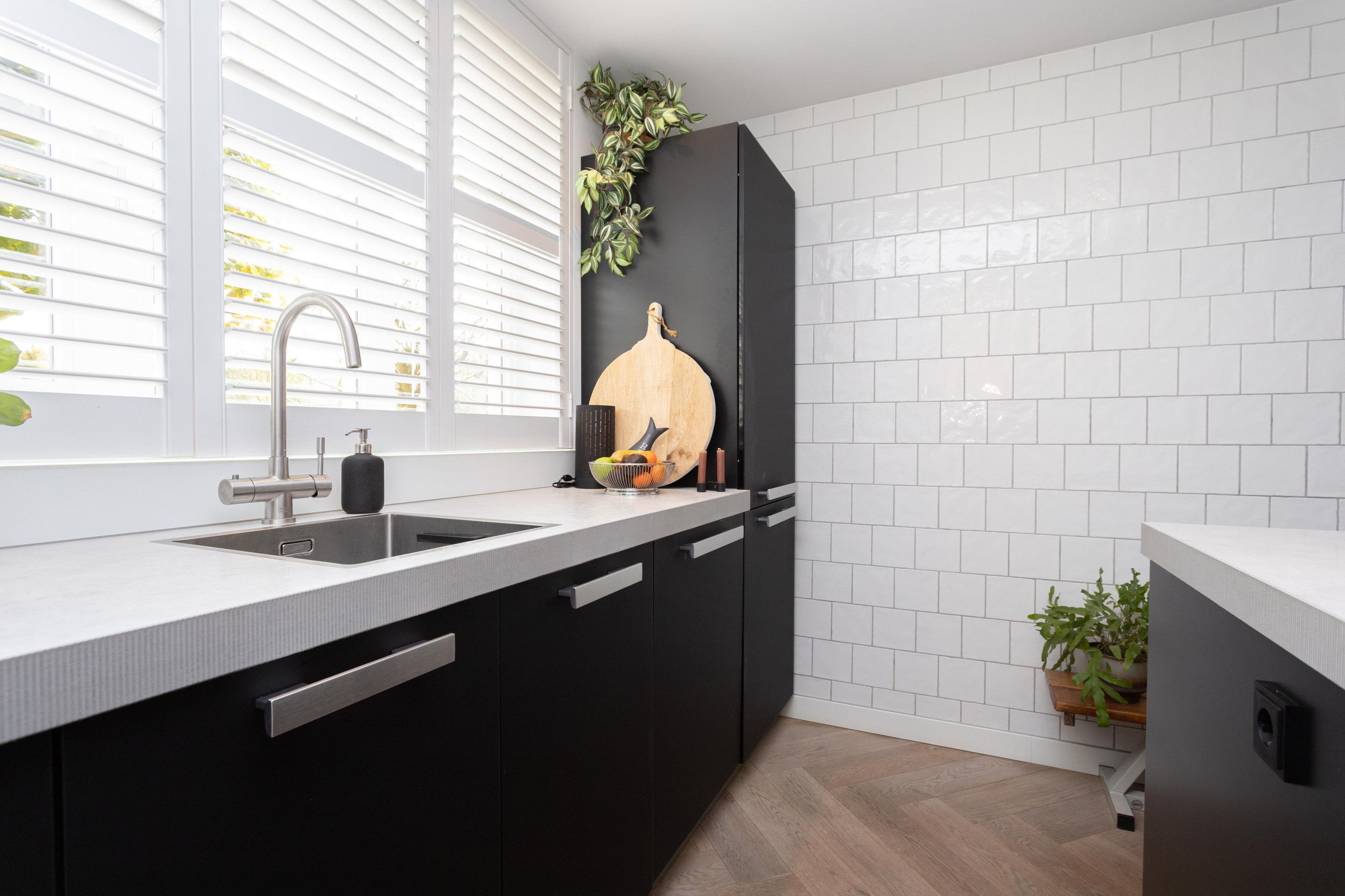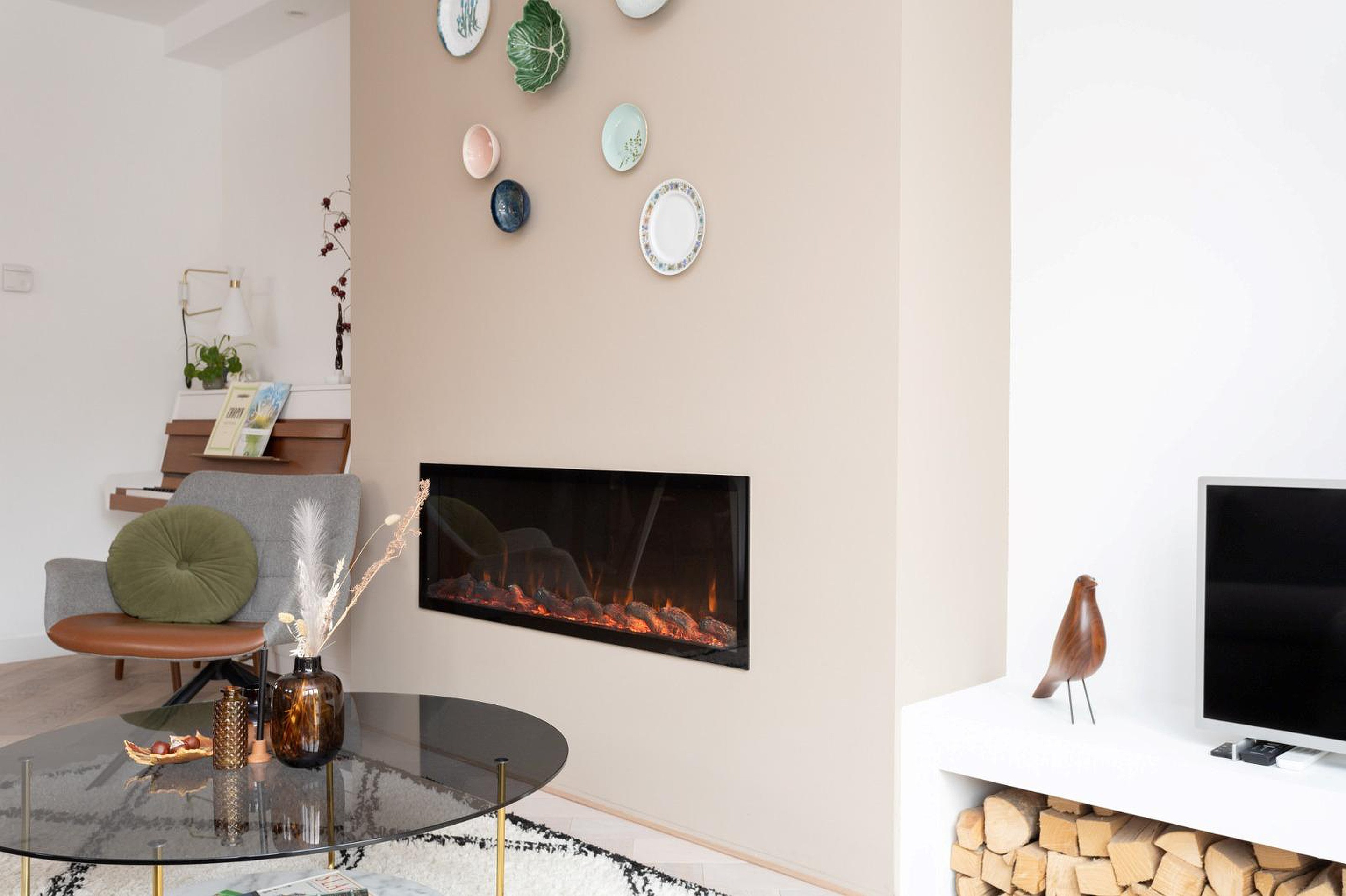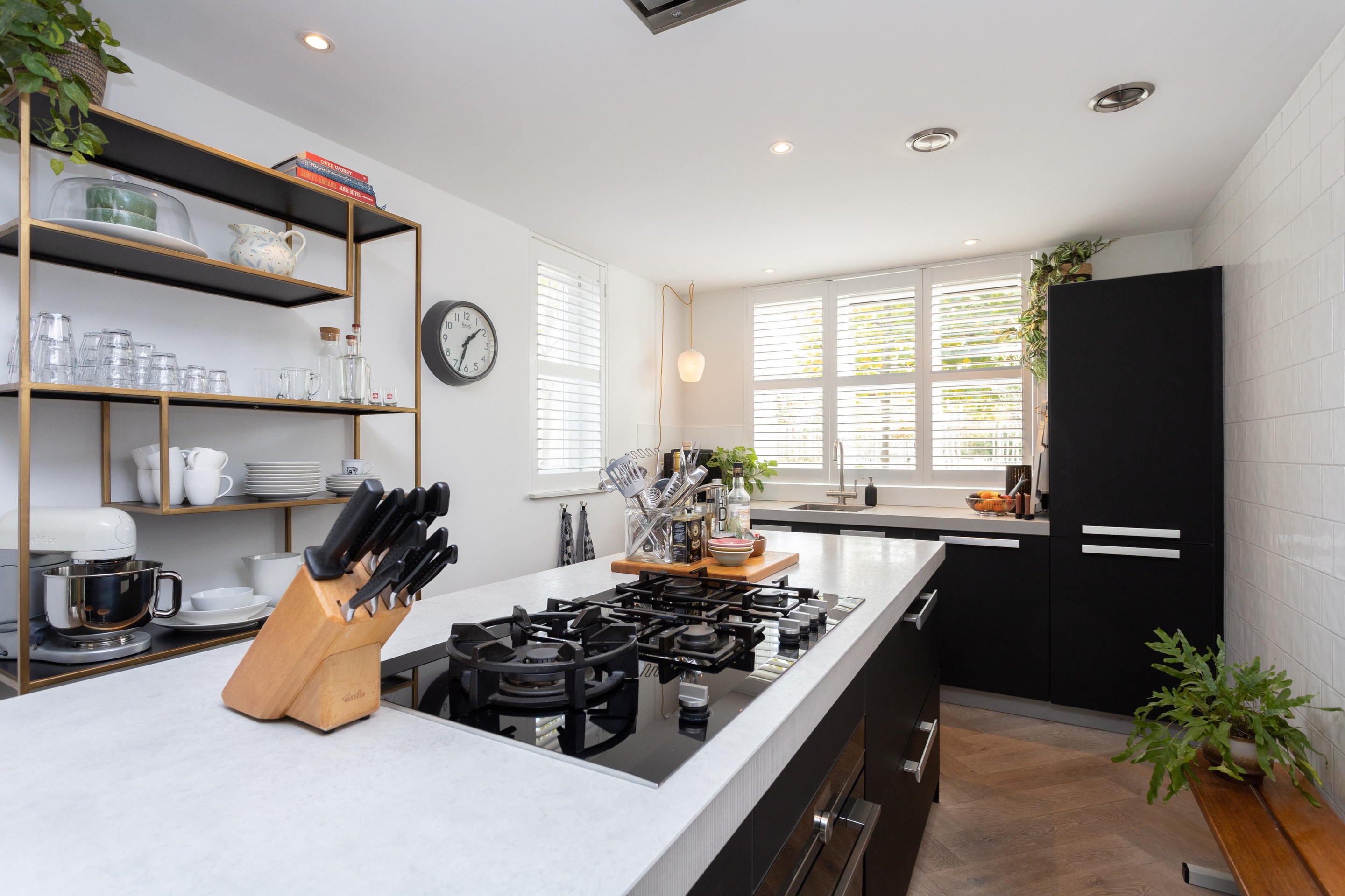 Hal met meterkast, toilet met fonteintje en toegang tot de ruime woonkamer. In de woonkamer prachtig parket in visgraat motief en een ingebouwde elektrische sfeerhaard; wat een luxe! Zwarte steel-look deuren naar de hal en de trapkast. Let ook op de wanden en plafond; strak gestuukt! En dan de open keuken aan de voorzijde; dit is ook één van de eyecatchers van de woning. Aan alles is gedacht: een groot kookeiland met bar, 5 pits gaskookplaat, design afzuigkap, multifunctionele oven, koelkast, vriezer, kokendwaterkraan, vaatwasser en het geheel is afgewerkt met een beton-look aanrechtblad.