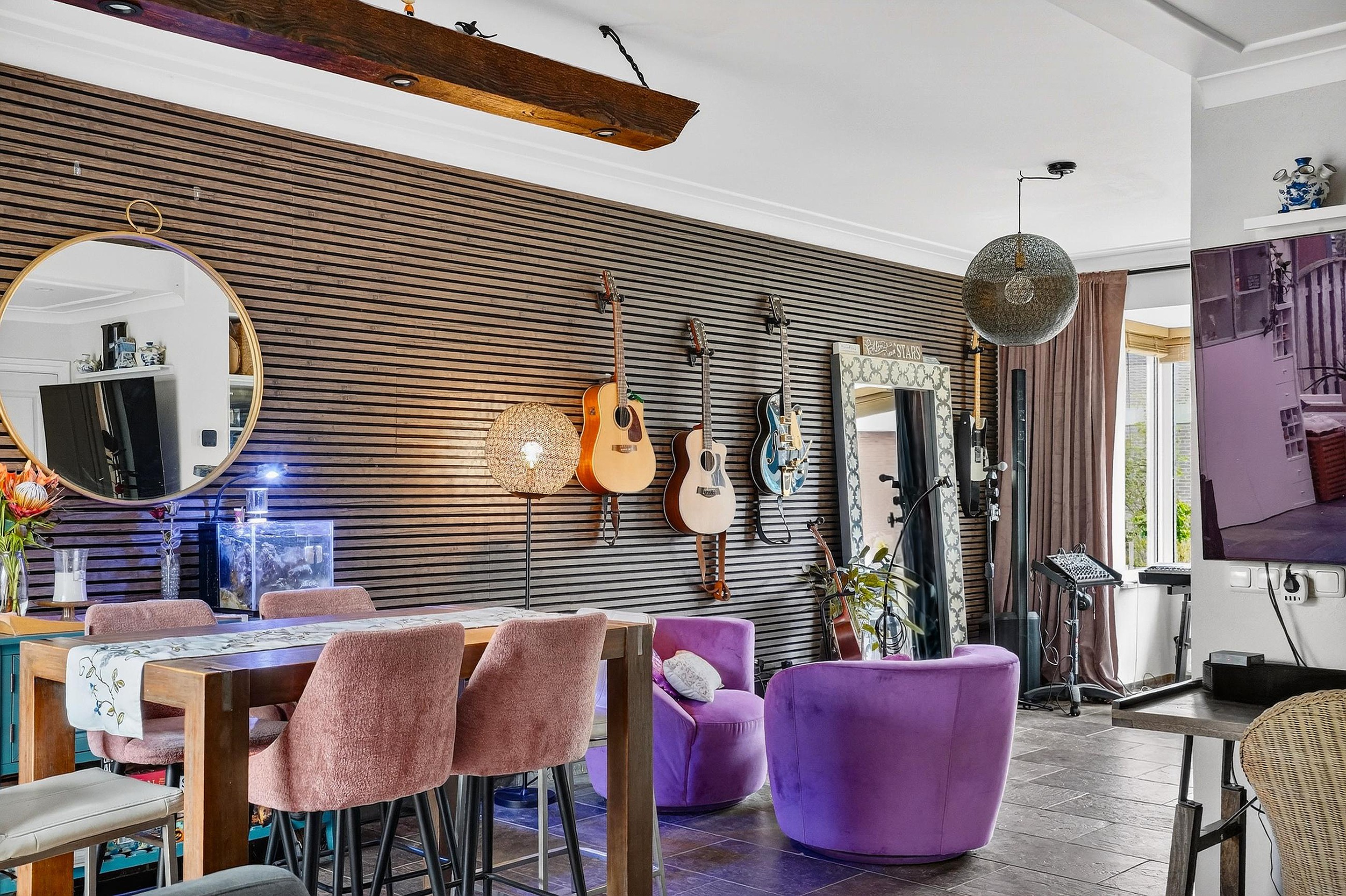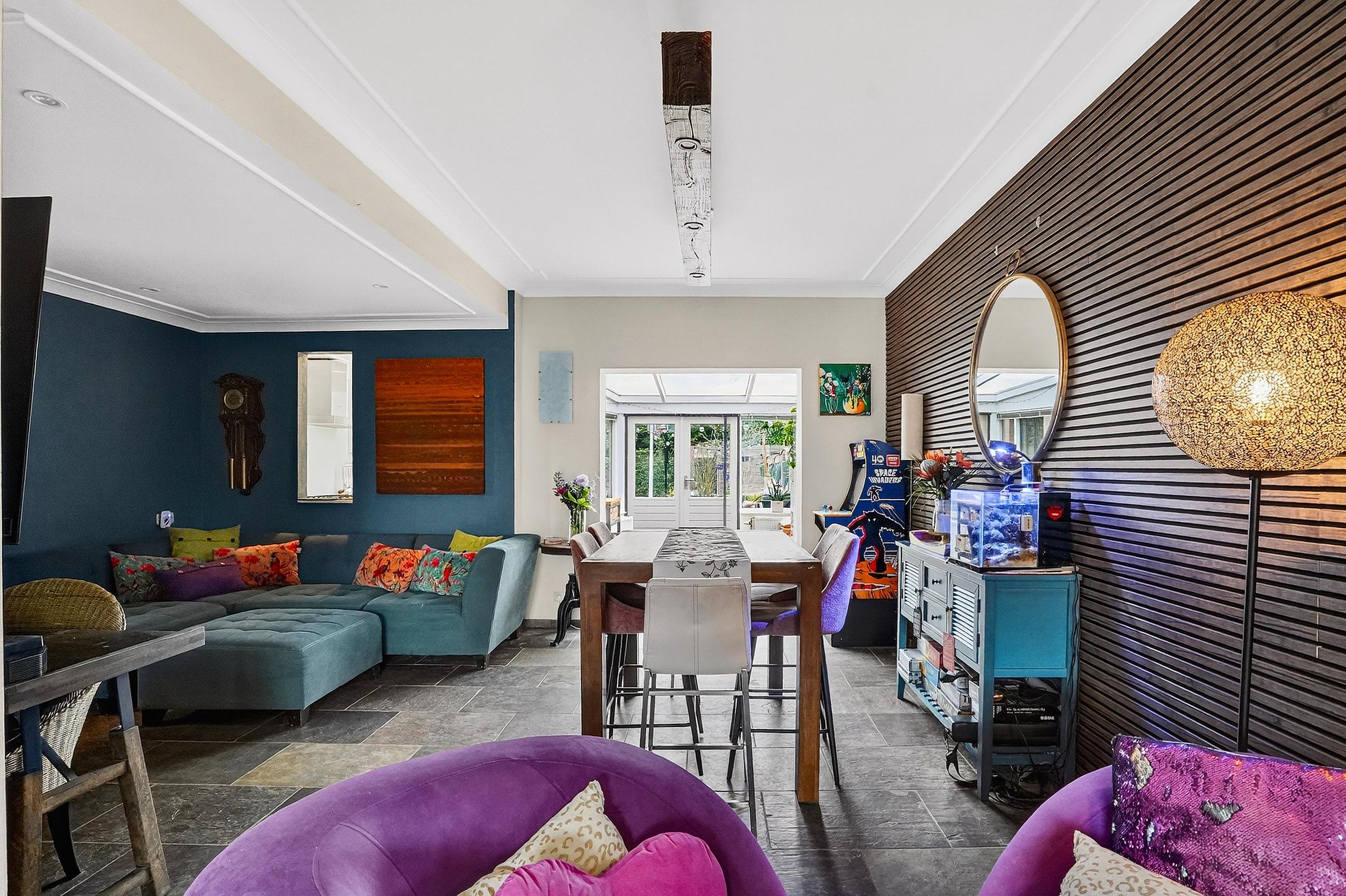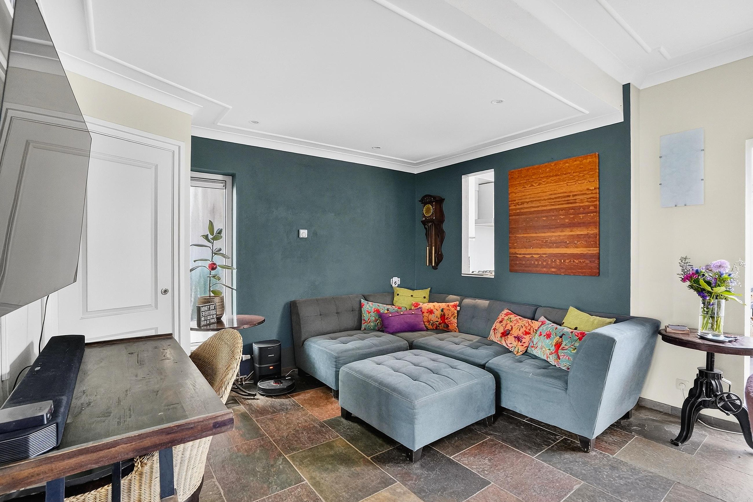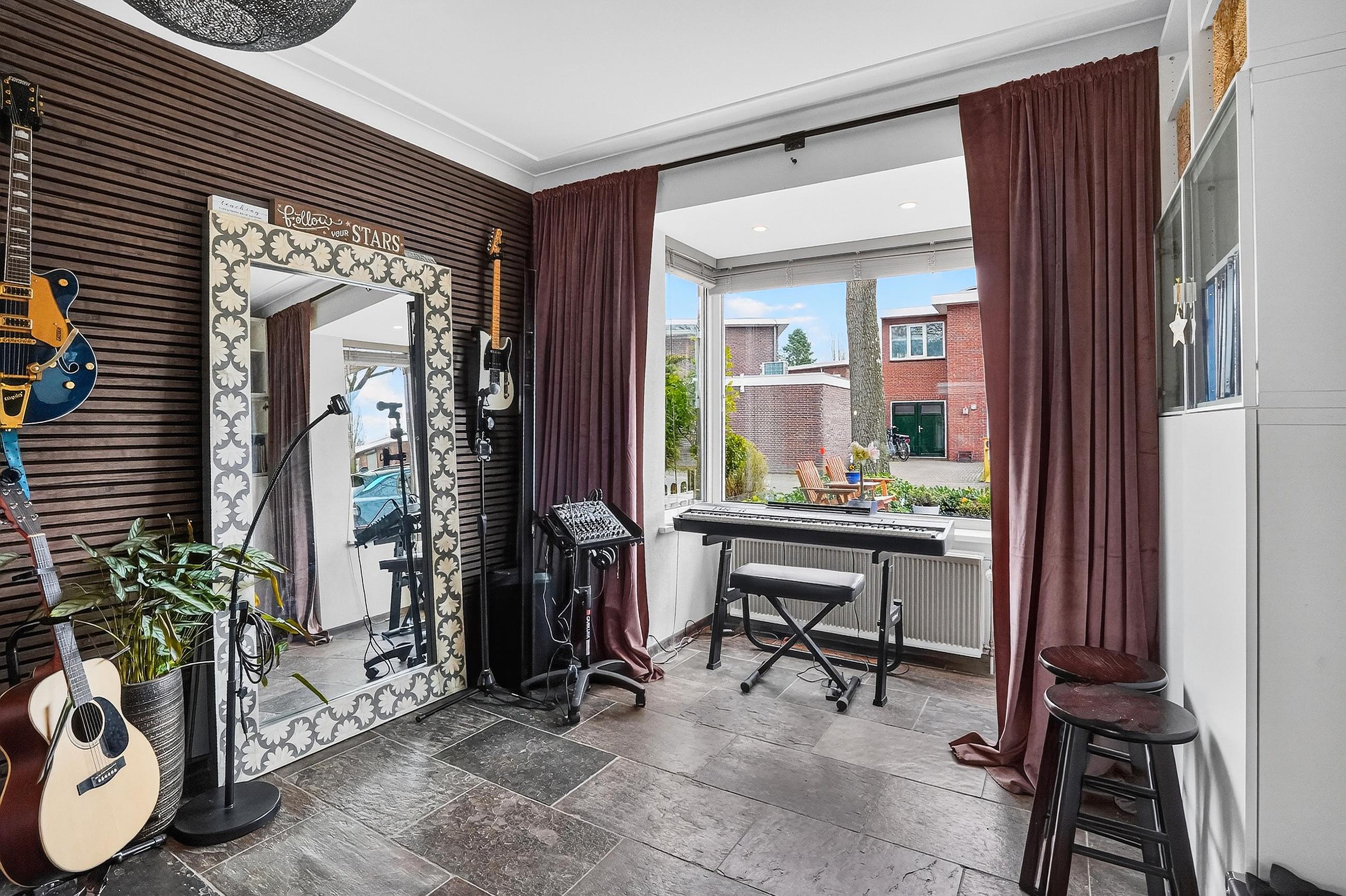 De woonkamer met erker en serre is voorzien van een leistenen vloer (met vloerverwarming), Spachtelputz wanden en stucwerkplafonds met lijsten. Aan de voorzijde is er zicht op de gezellige voortuin met terras en aan de achterzijde is er zicht op de royale achtertuin.