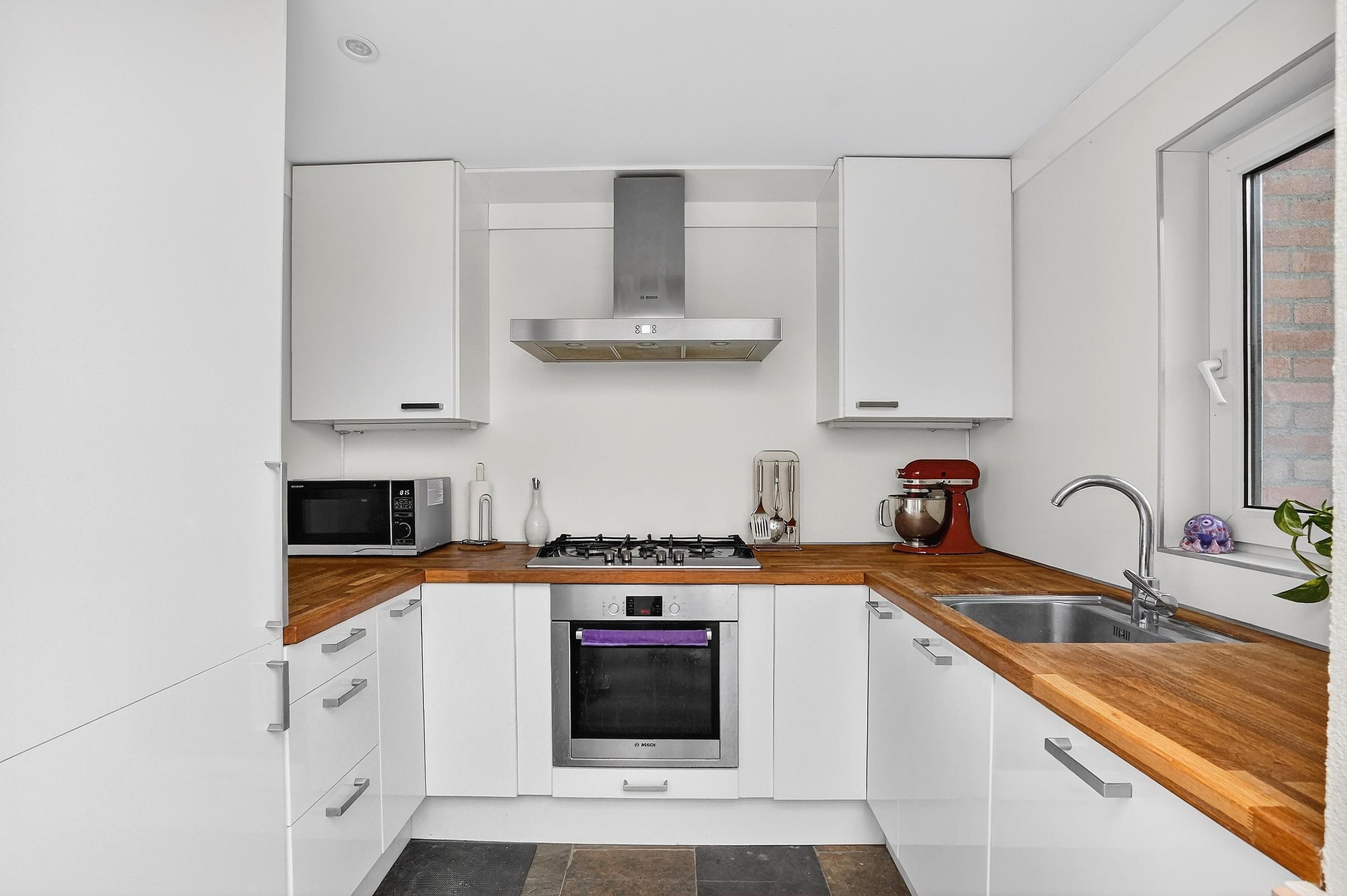 De keuken beschikt over een U-opgestelde keukeninrichting met voldoende boven- en onderkasten, laden en de nodige inbouwapparatuur. Het royale werkblad biedt plaats aan o.a. een koffiemachine.