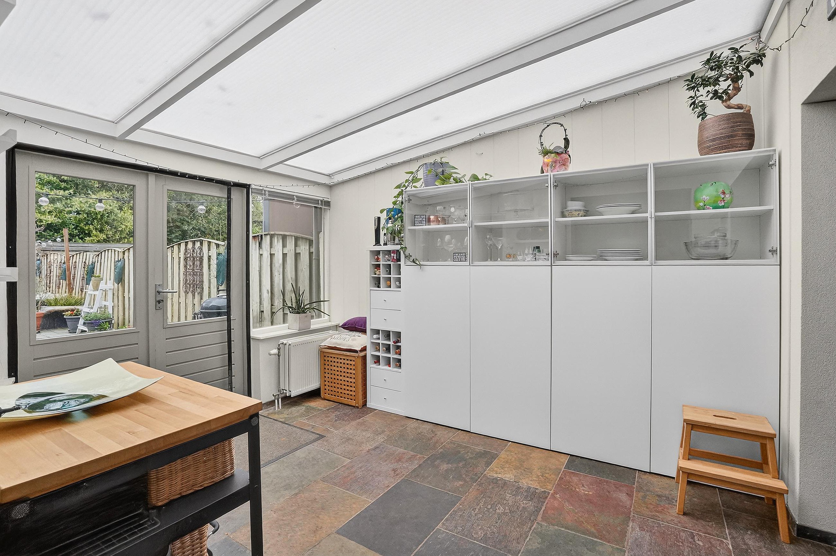 In de uitbouw is de eetkamer gesitueerd. Vanuit de uitbouw is de achtertuin bereikbaar, via een overkapping.