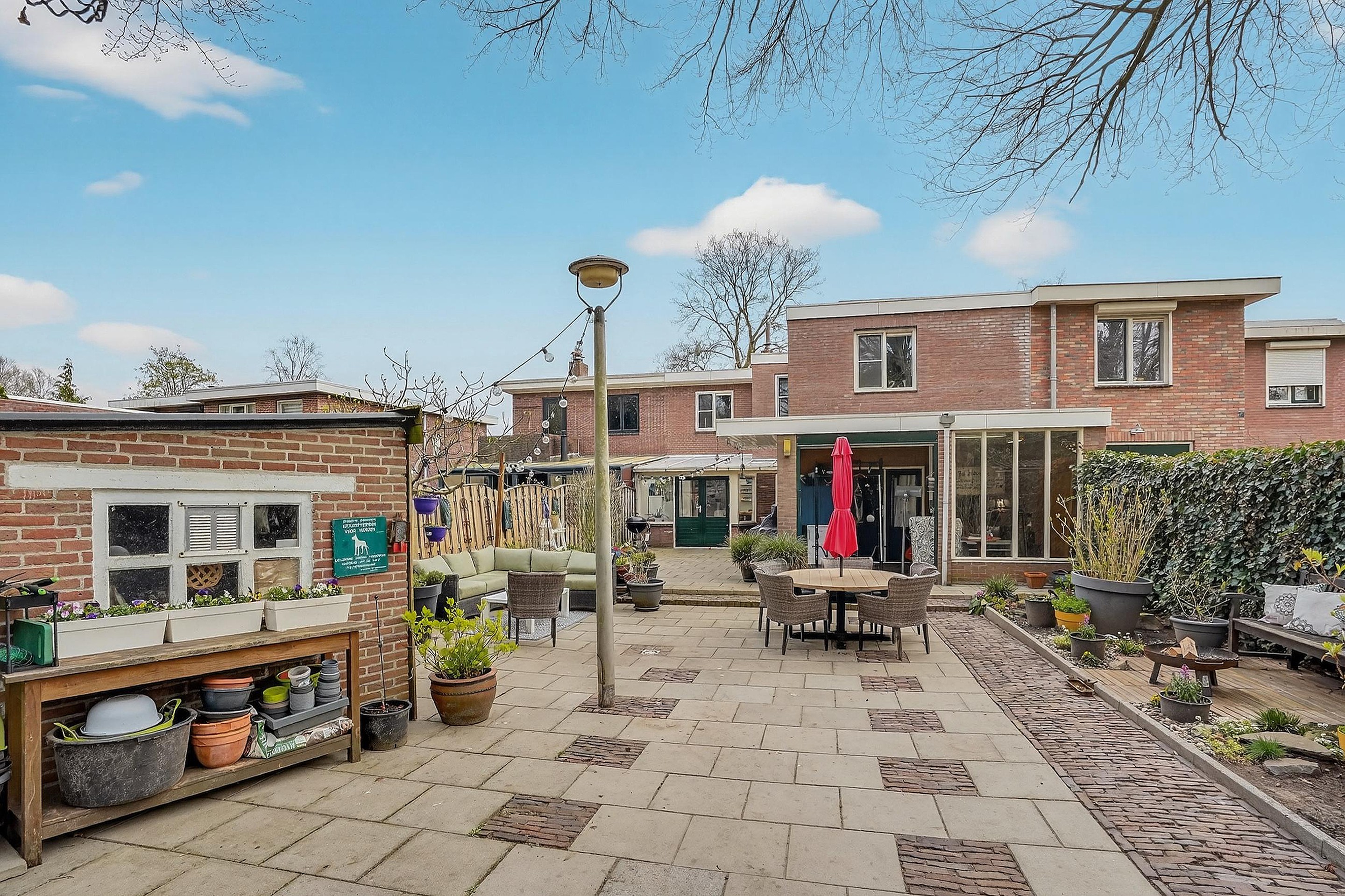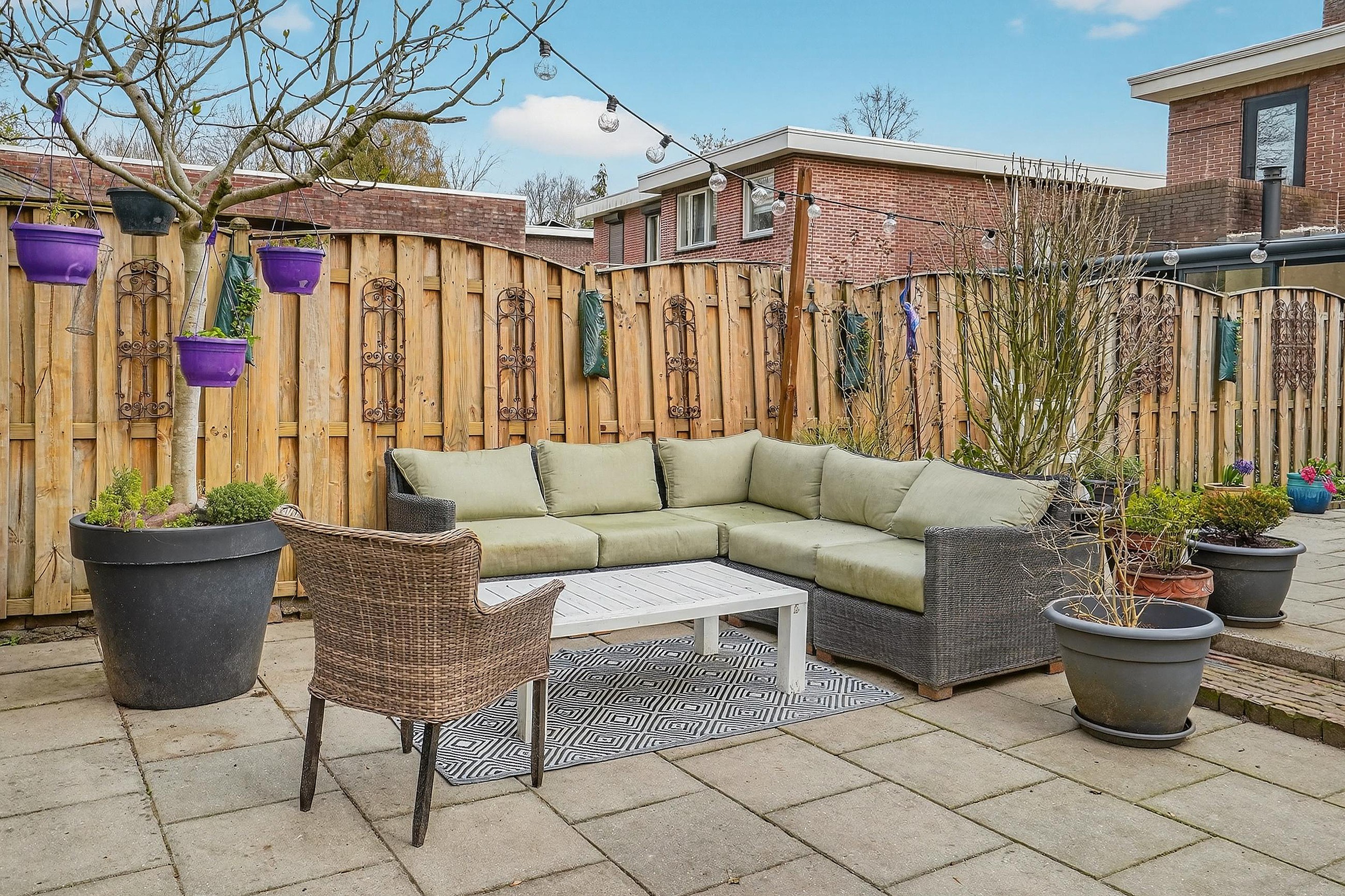 De tuin is verder geheel omheind, vrijwel geheel betegeld en voorzien van borders met vaste planten en struiken. Een enorme, monumentale rode beuk maakt de tuin af!