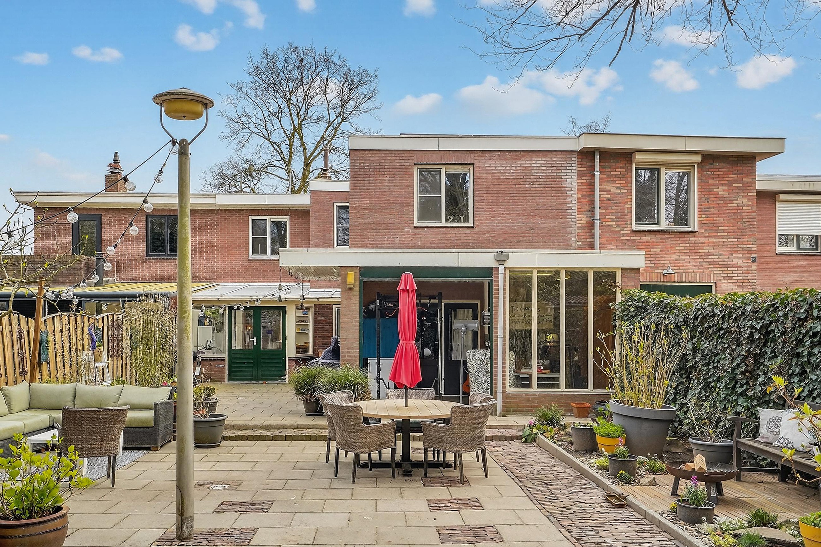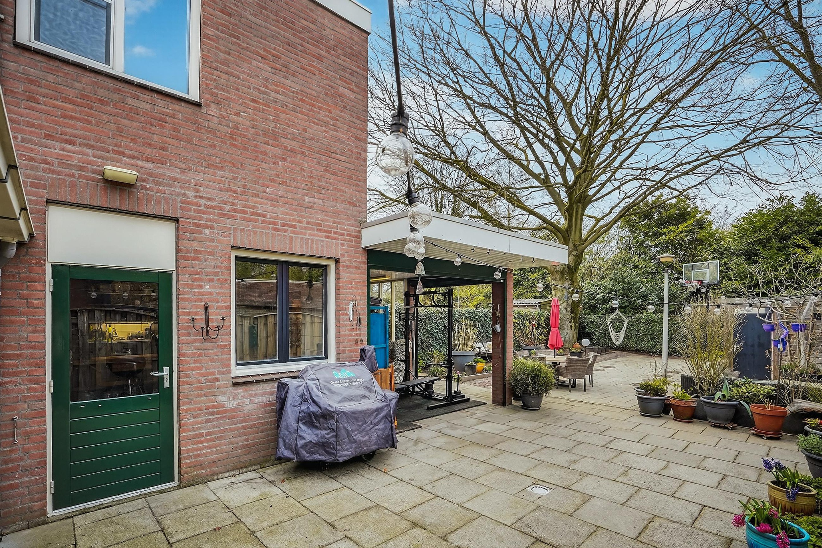 De zeer ruime achtertuin beschikt over een tweetal overdekte terrassen, waarvan één terras kan worden afgesloten met elektrisch bediende rolluiken.