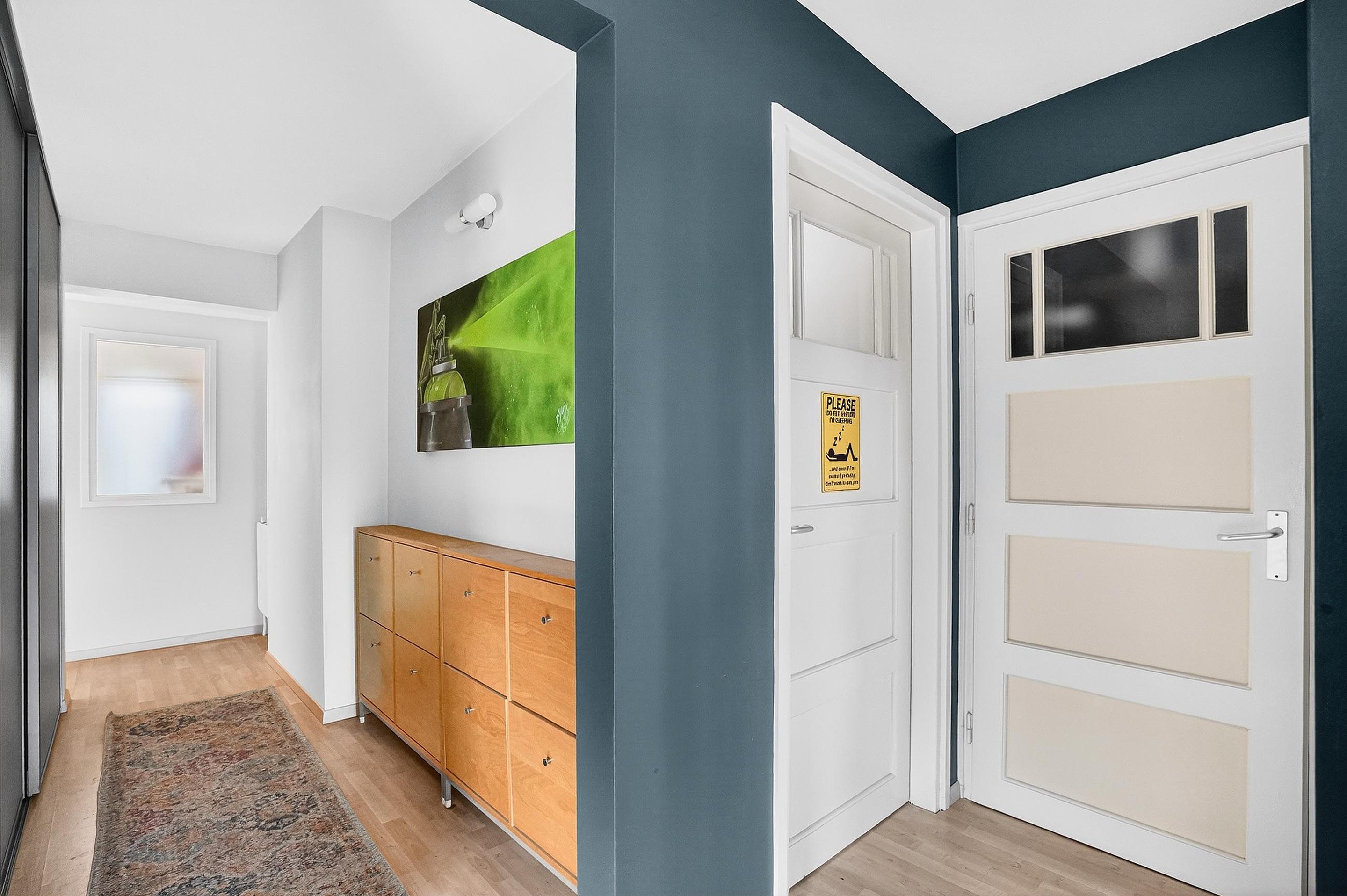 De gang naar de mastersuite is voorzien van een grote inbouwkastenwand en geeft toegang tot een derde slaapkamer, de wasruimte met aansluitingen voor de wasmachine en -droger en de mastersuite.