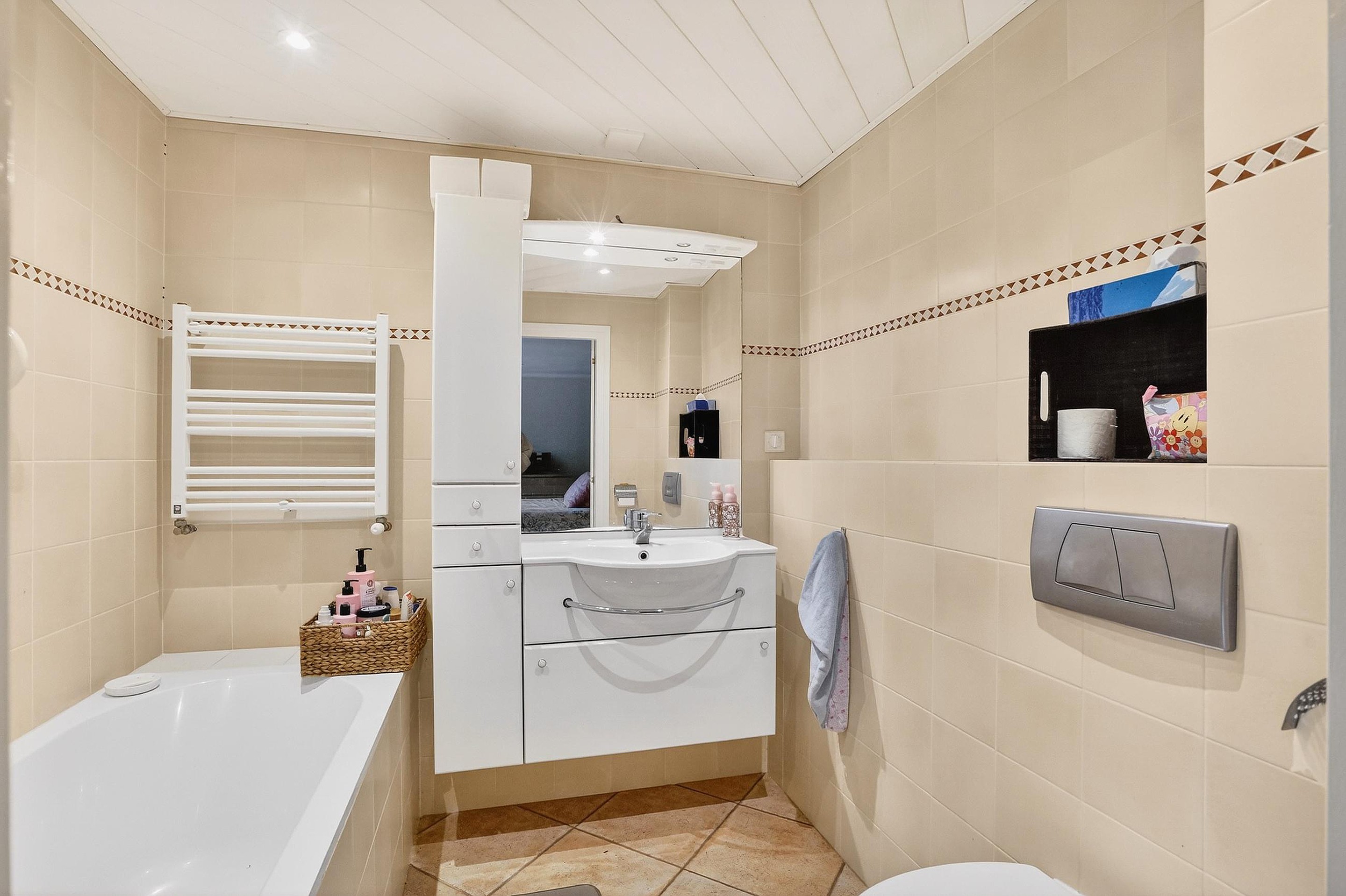 Beide slaapkamers zijn voorzien van een eigen inbouwkast, laminaatvloeren (houtlook), stucwerk wanden en dito plafonds. De badkamer is voorzien van een douchecabine, een wandcloset, een wandmeubel met geïntegreerde wastafel en een bad-geiser.