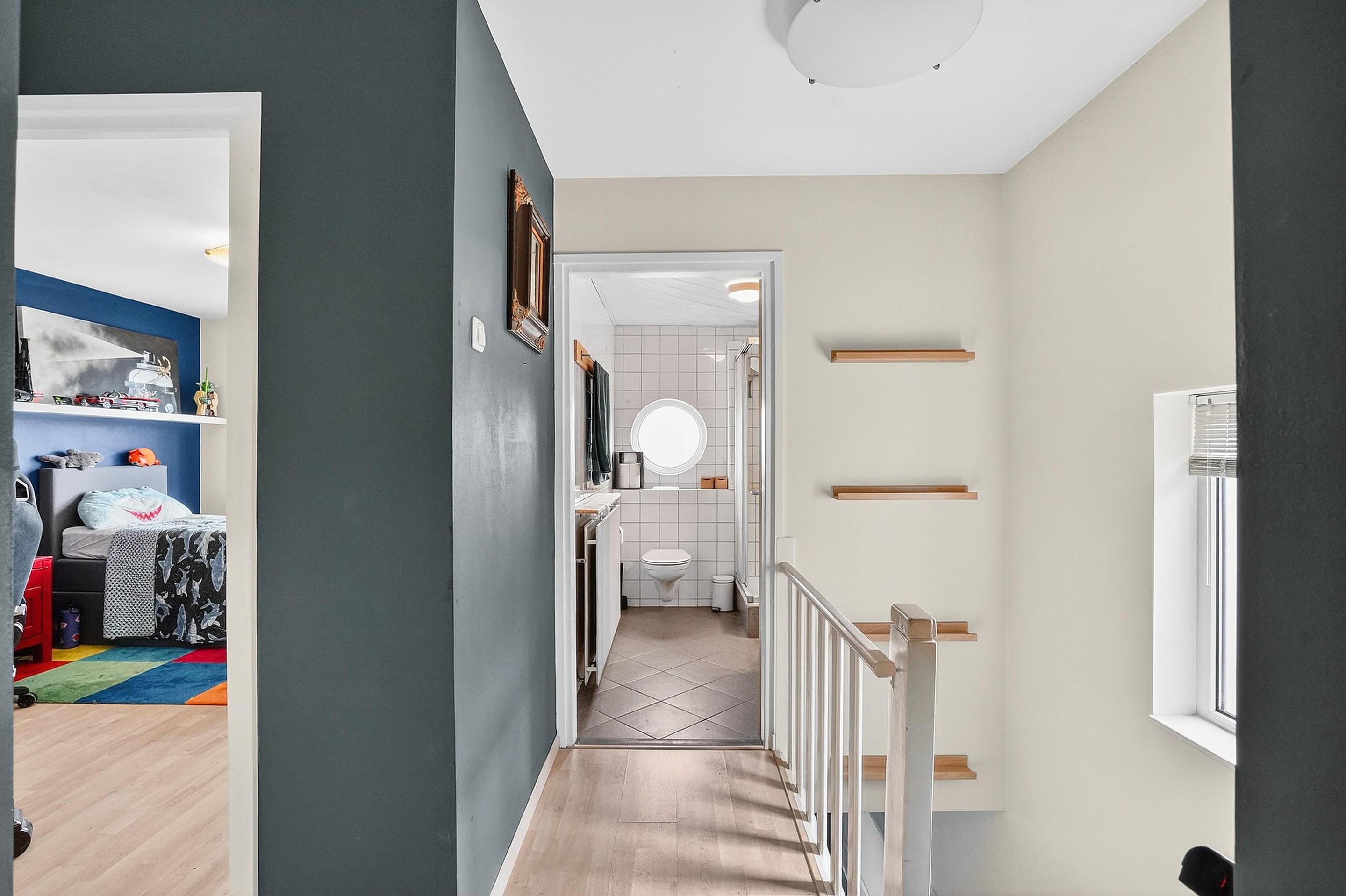 Overloop met toegang tot 2 slaapkamers, een badkamer, een inbouwkast en de gang naar de mastersuite.