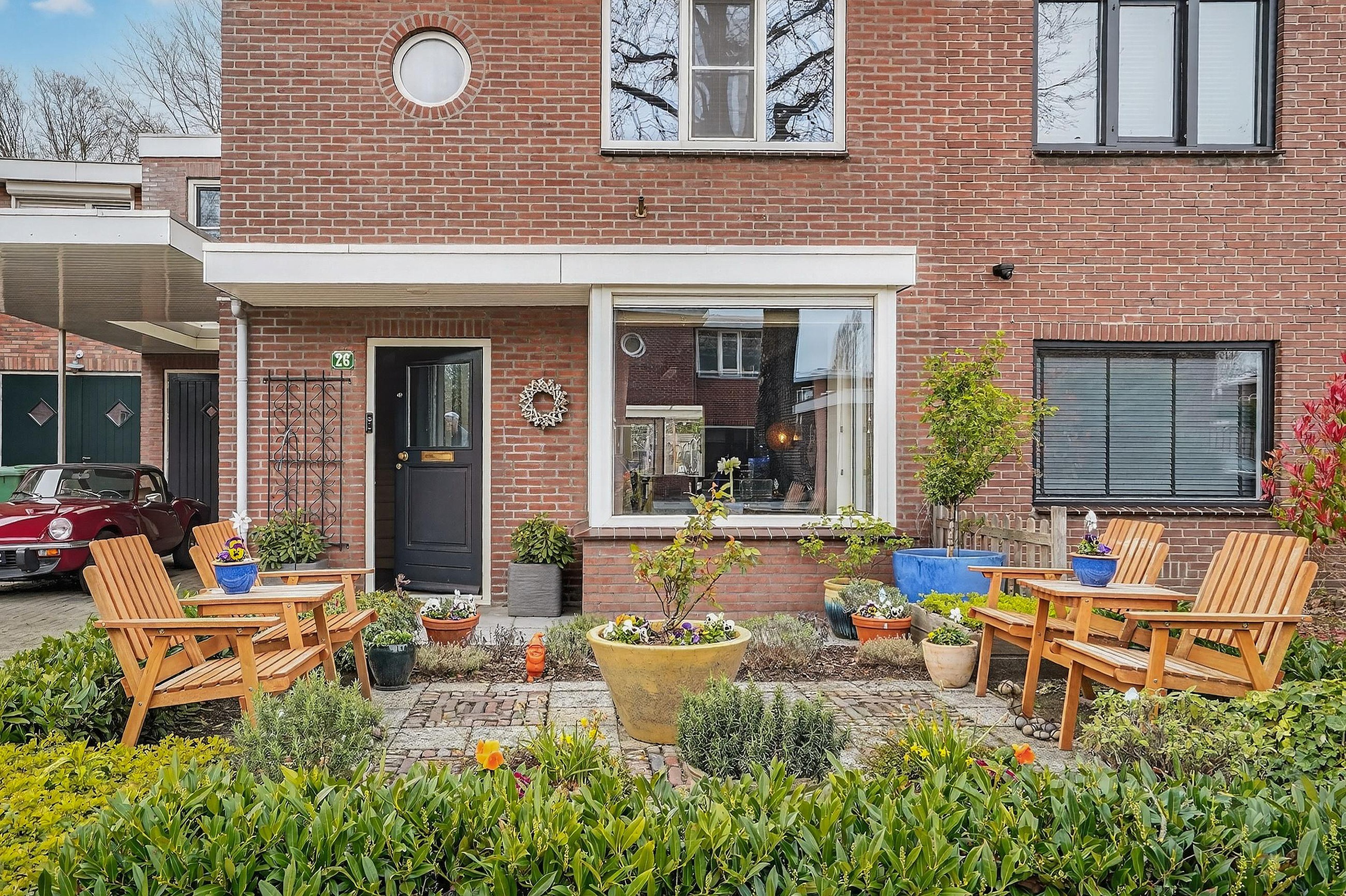 De voortuin is voorzien van een terras en is omheind met vaste planten en struiken.