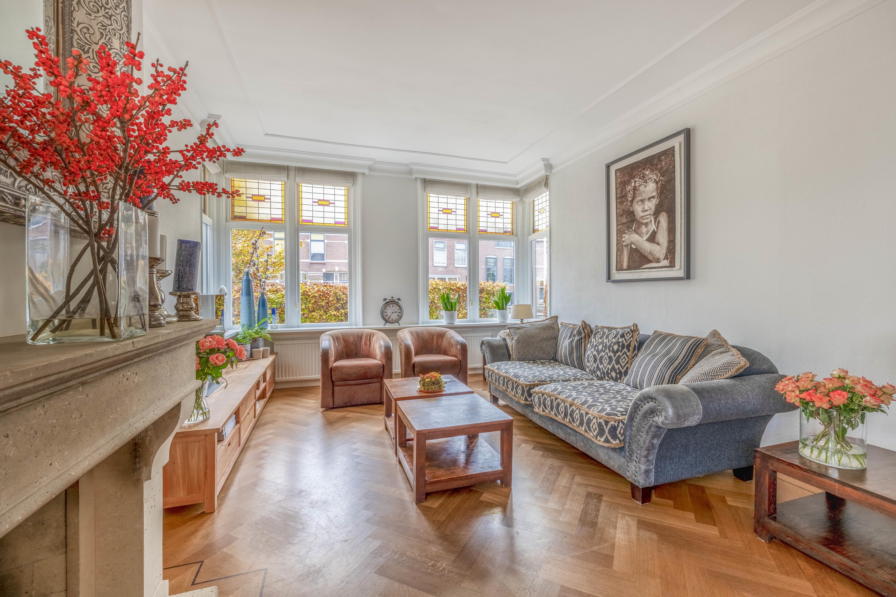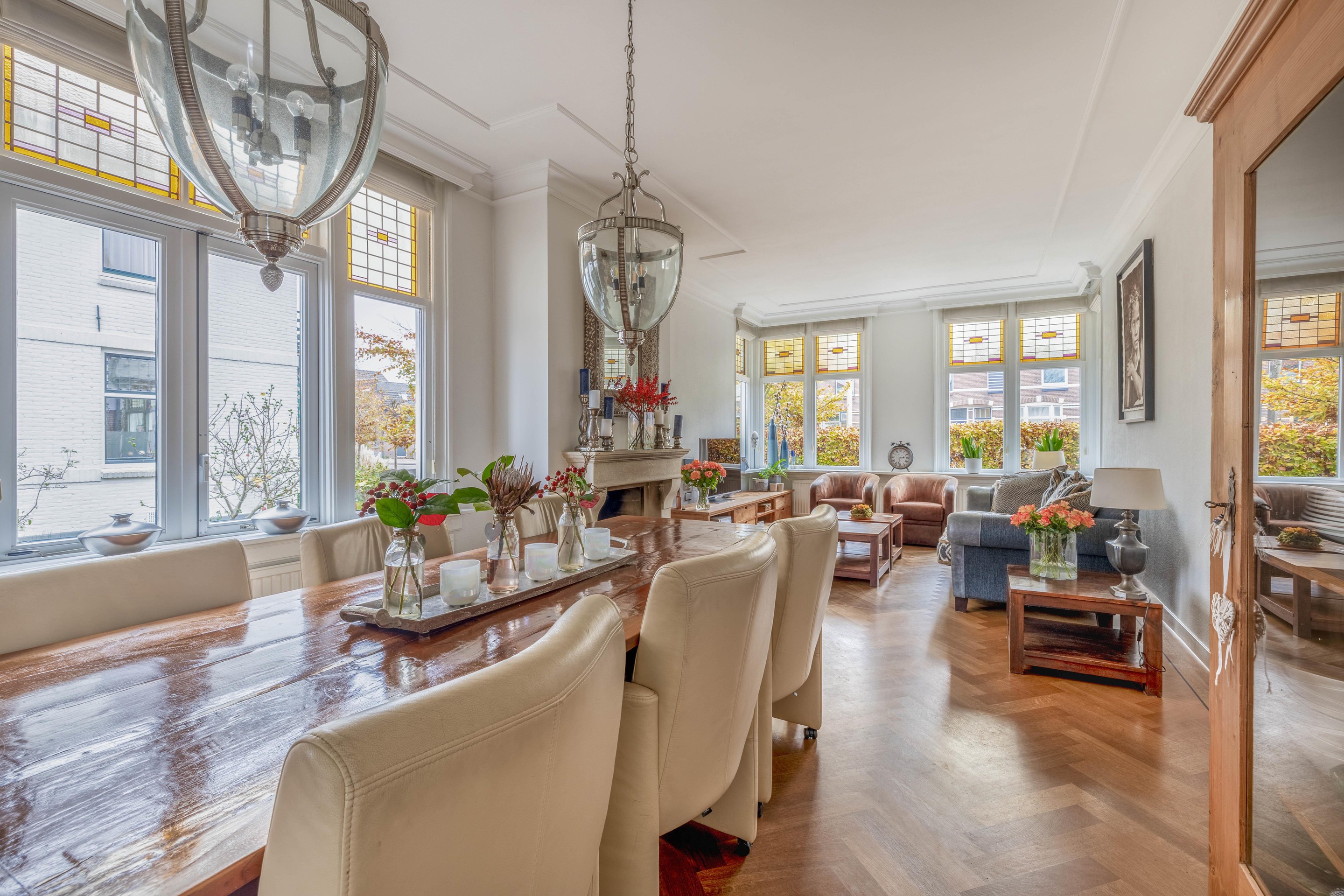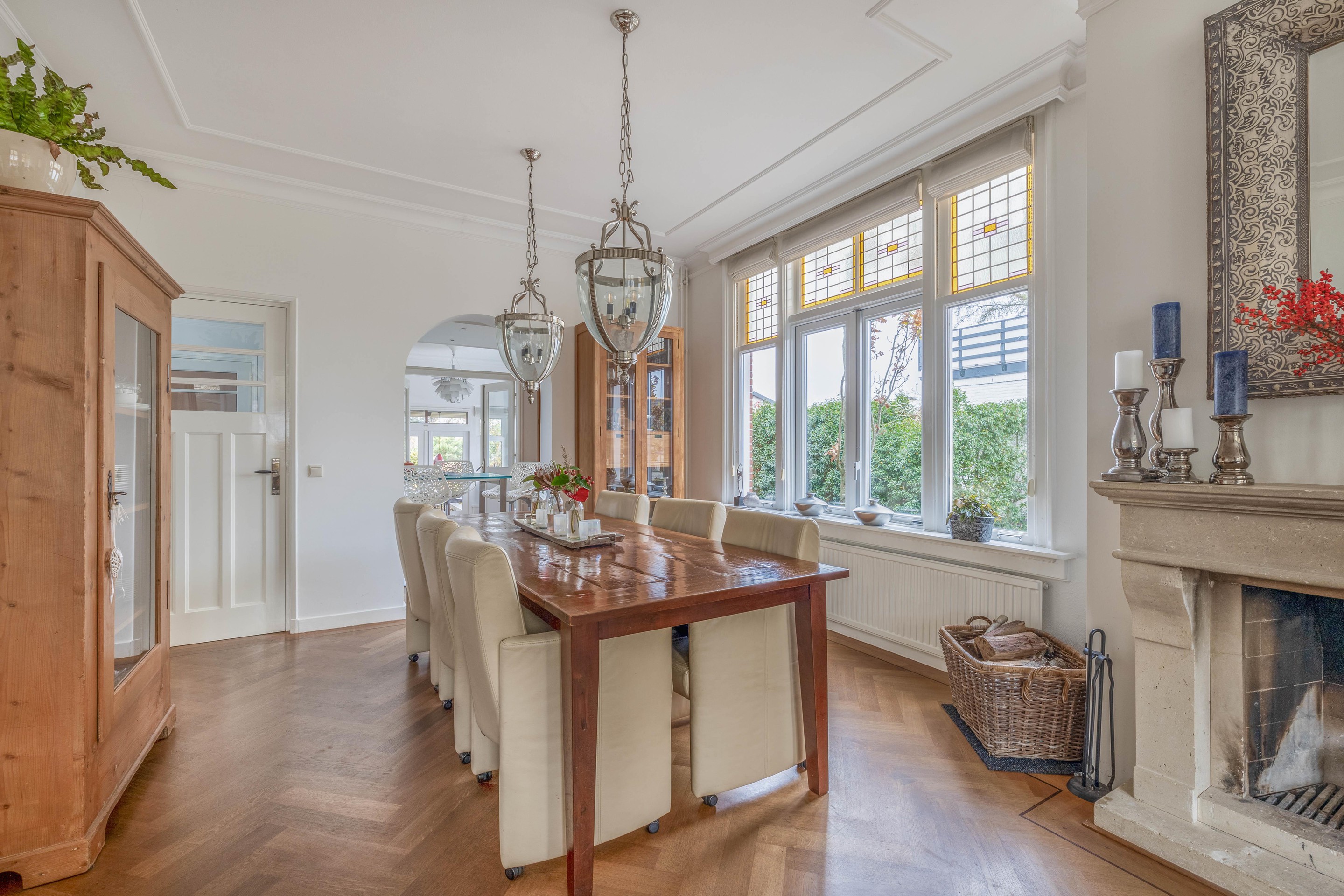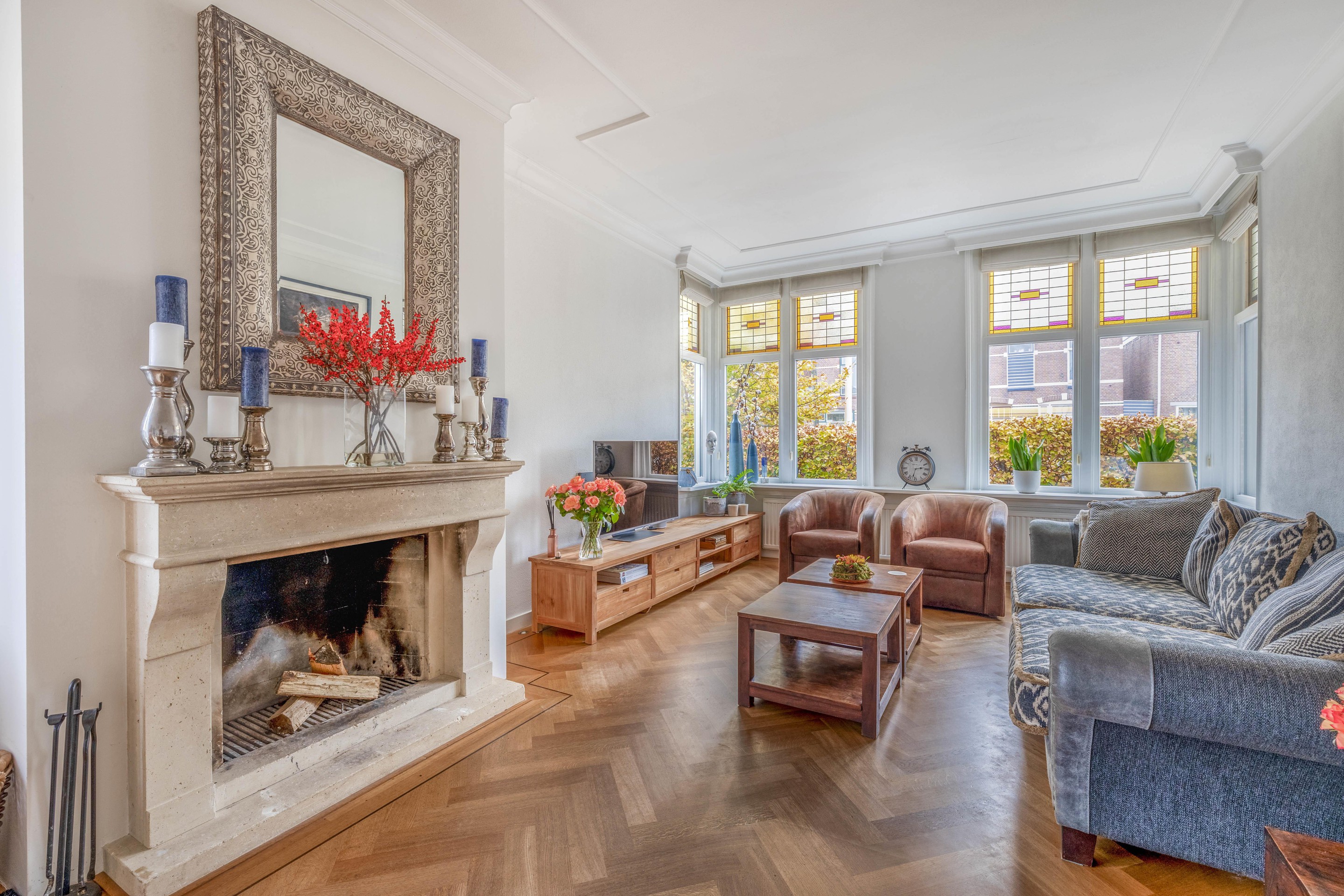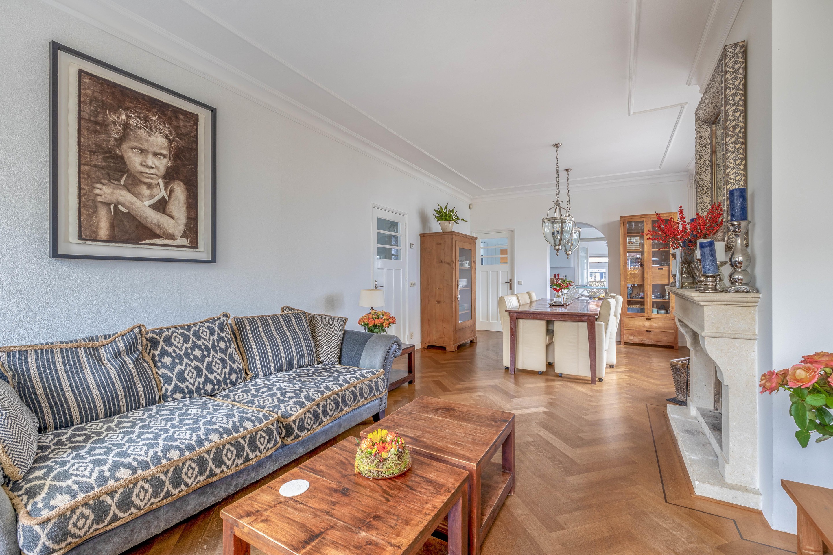 De sfeervolle woonkamer straalt warmte en elegantie uit. Authentieke details zoals ornamenten, een open haard en glas-in-loodramen zorgen voor een charmante jaren ’30-stijl. Verder zijn de wanden glad gestuukt en ligt er een klassieke visgraatvloer met bies.