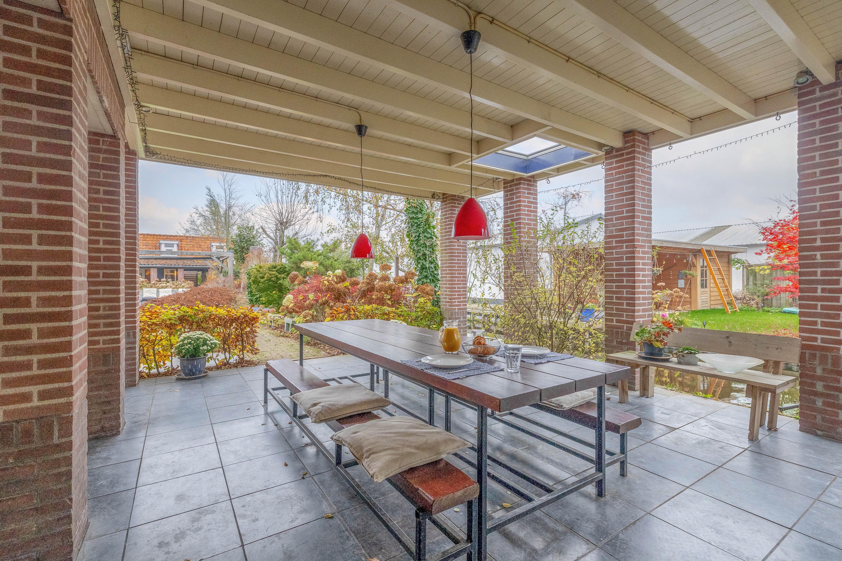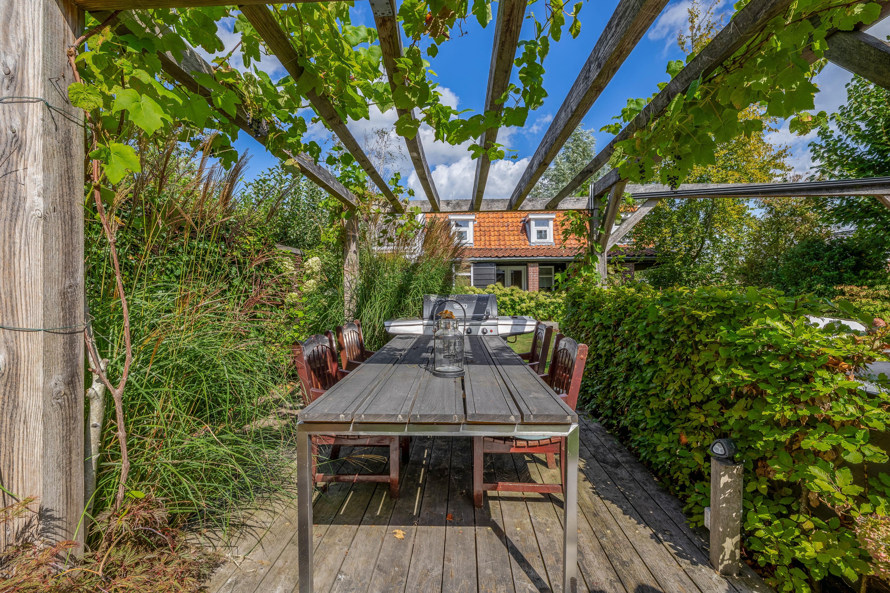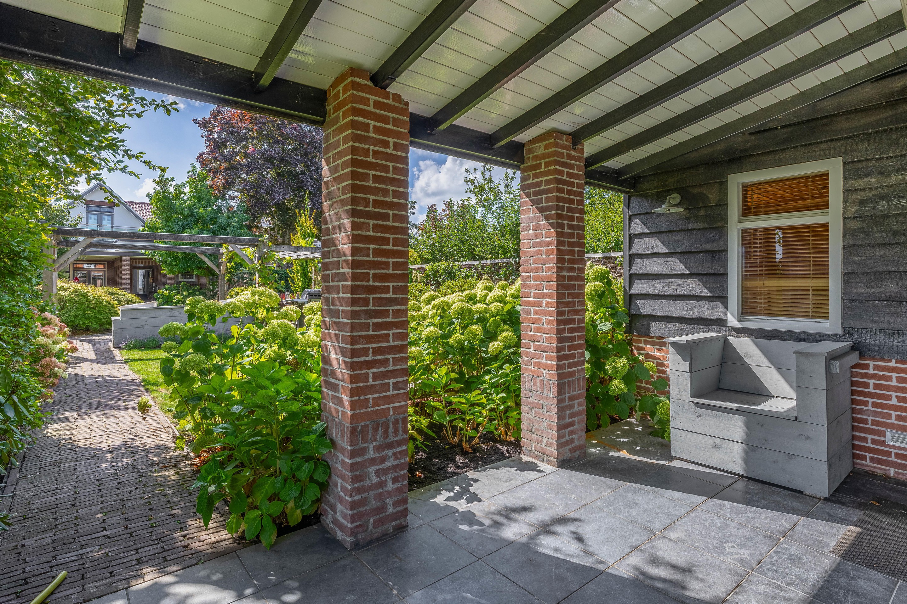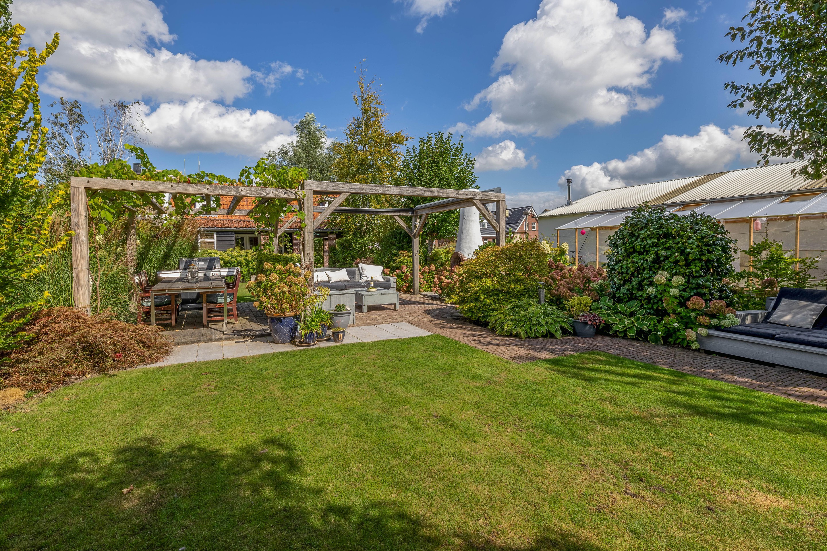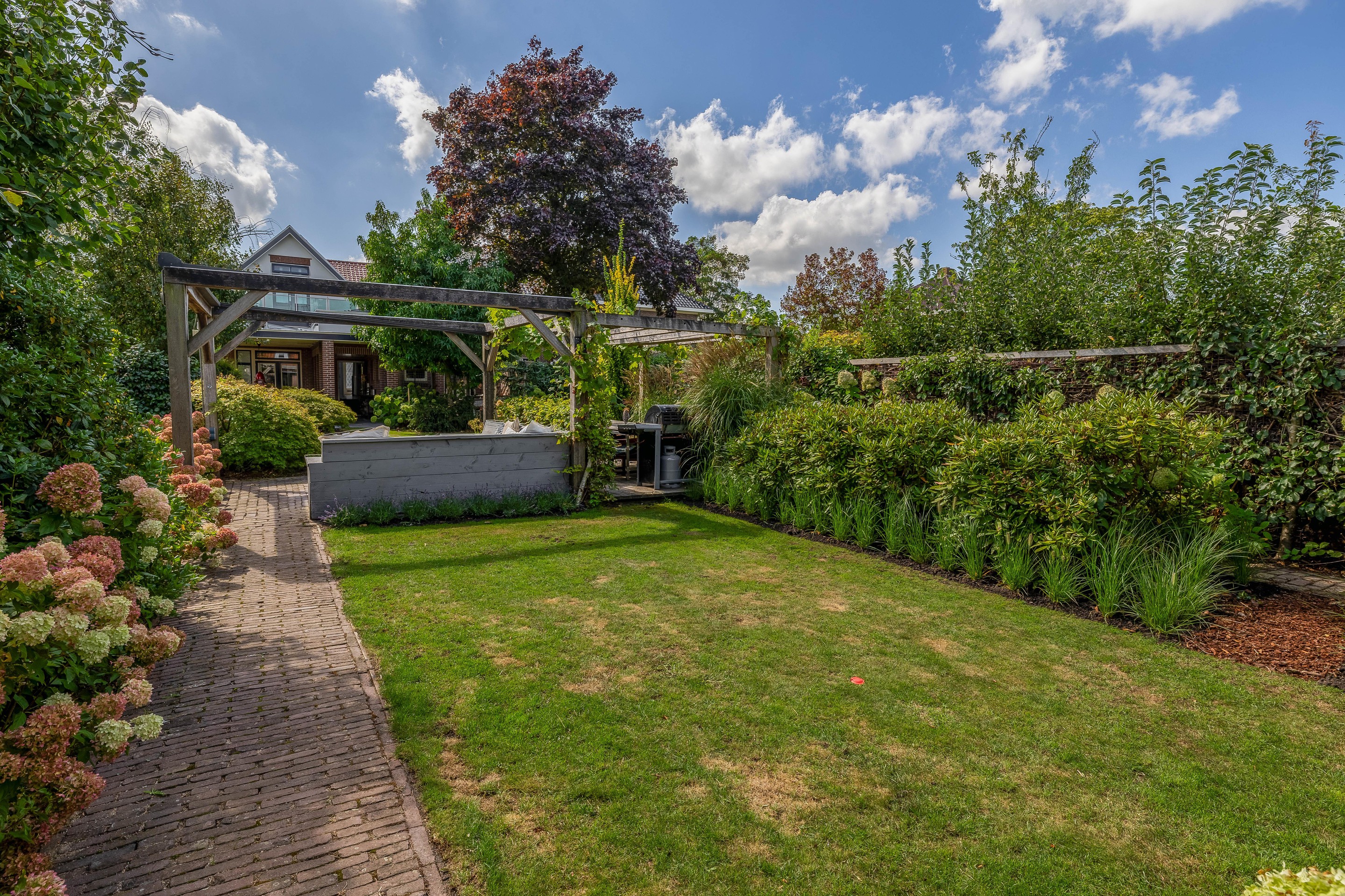 De achtertuin is bereikbaar via de bijkeuken, het kantoor en via de afgesloten tuin aan de rechterzijde. Direct achter het huis is een robuuste gemetselde overkapping gebouwd: een fantastische plek om lange avonden te tafelen of gewoon te genieten van het buitenleven. In het midden van de tuin kun je volop van de zon genieten: ideaal om te barbecueën of een plek waar kinderen lekker kunnen ravotten.