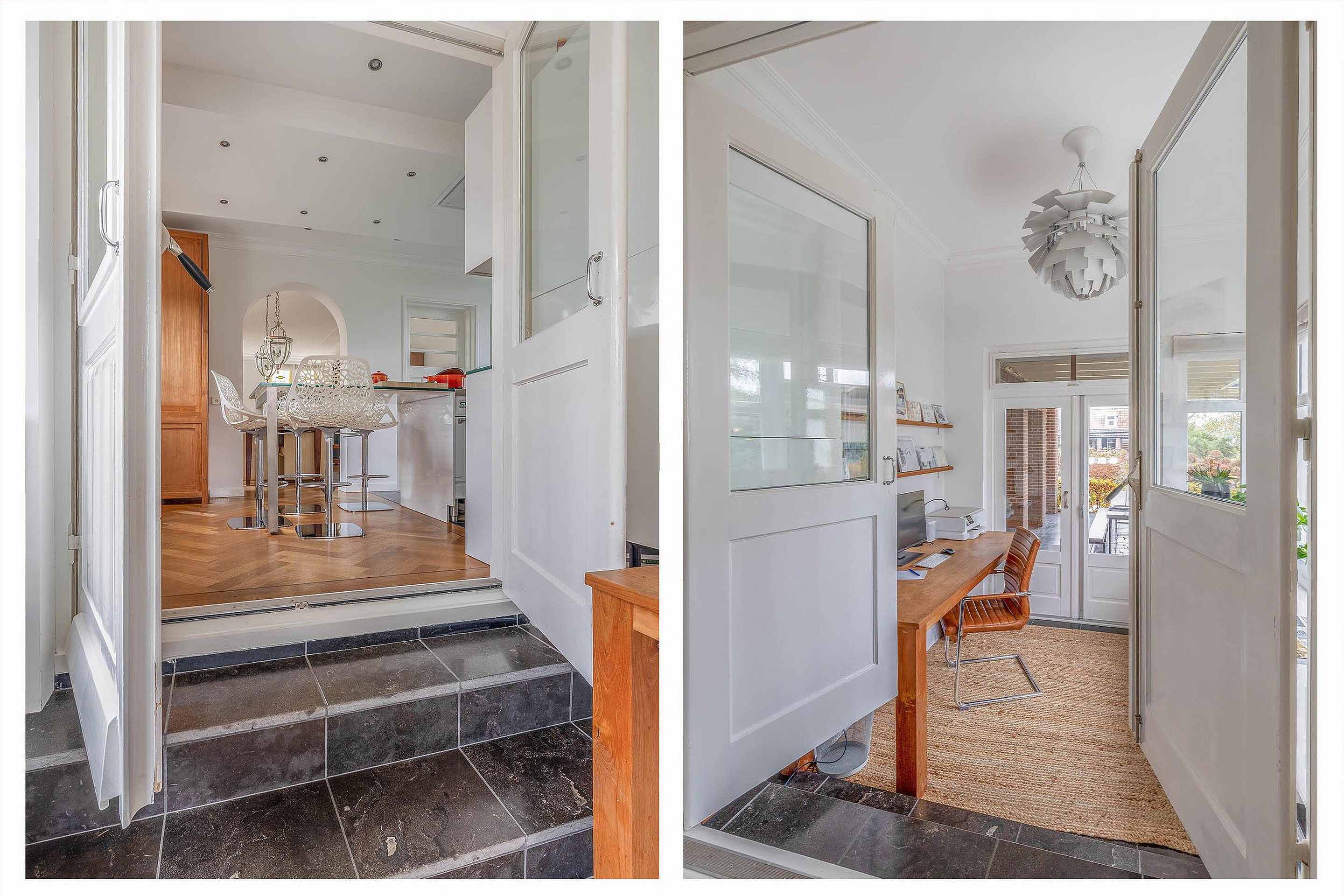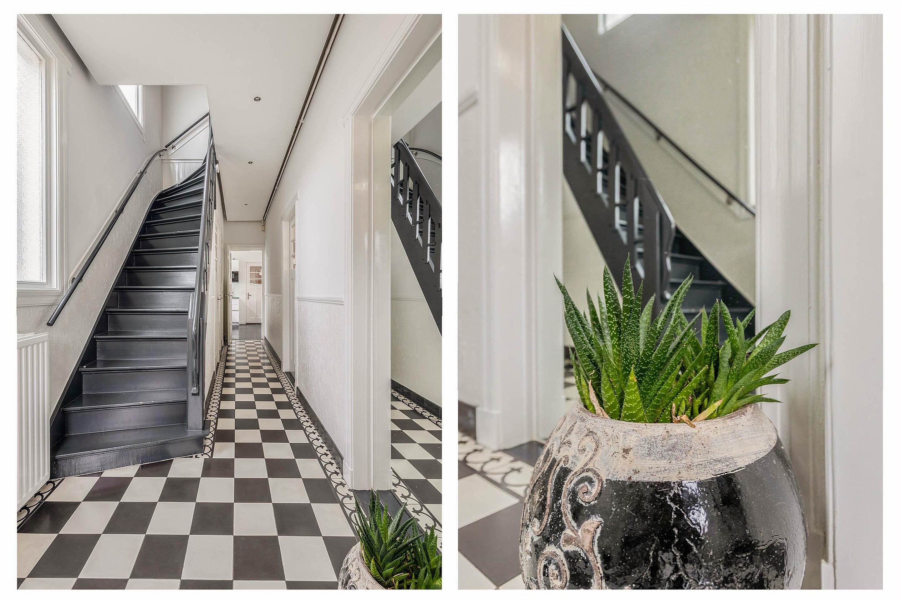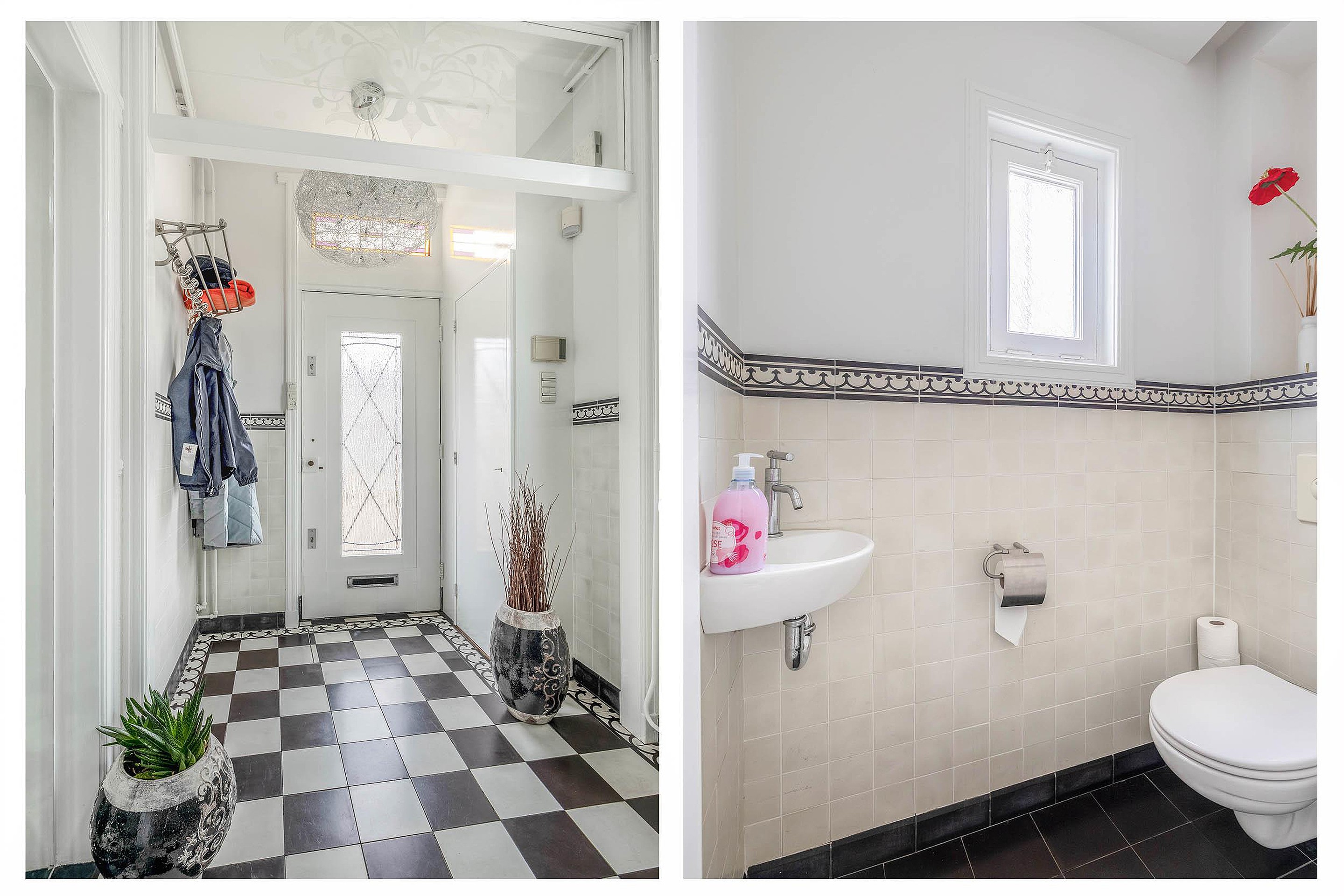 De hal/entree bevat nog diverse originele details, zoals het kozijn van de vestibule en het glas-in-loodraam boven de voordeur. Vanuit de hal heb je toegang tot de eerste verdieping, de trapkast, de toiletruimte, de woonkamer en de keuken. De meterkast in de entree is volledig vernieuwd en voorzien van een ruim aantal groepen.