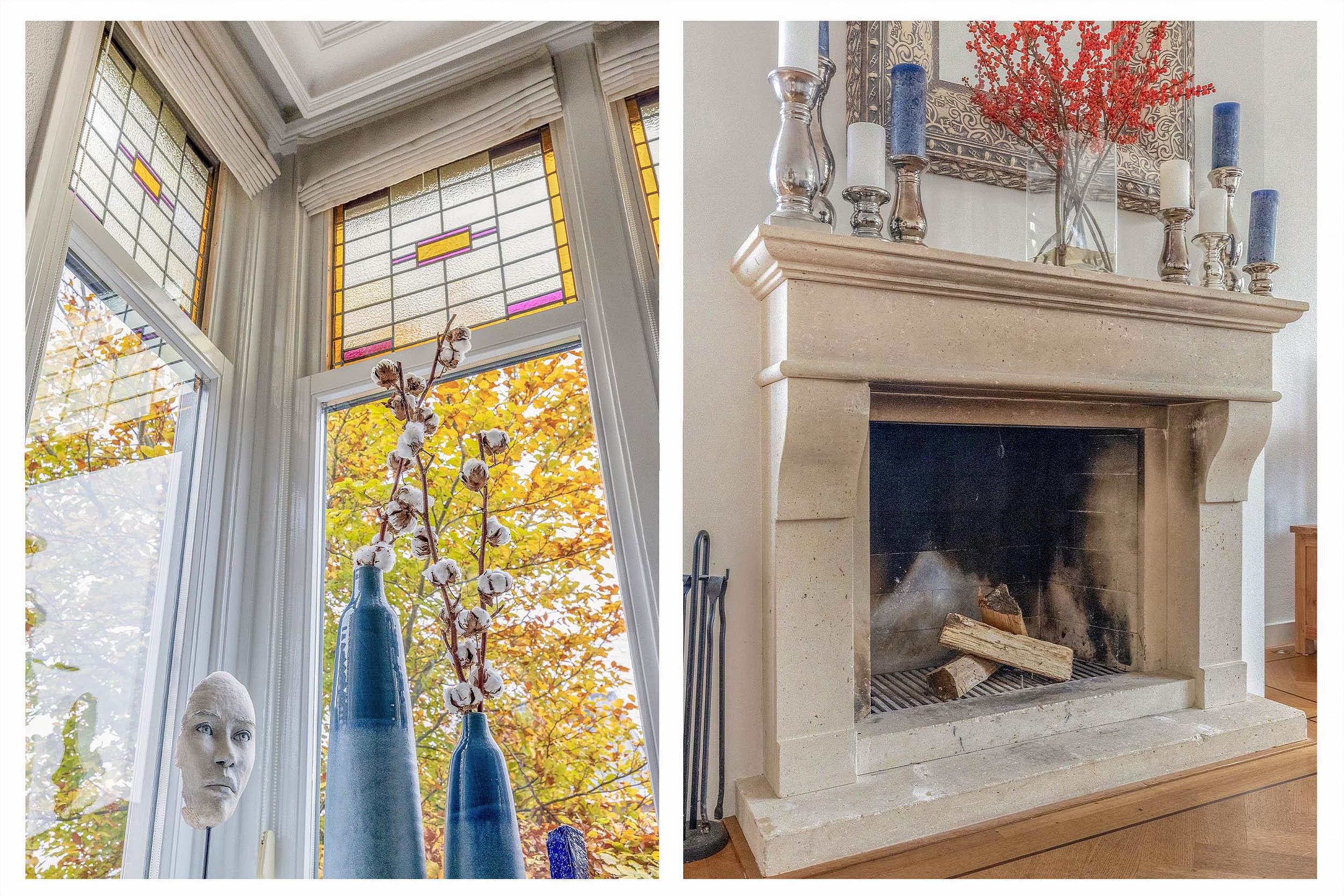 - Prachtige jaren ’30-details: visgraatvloer, ornamenten, glas-in-lood en open haard