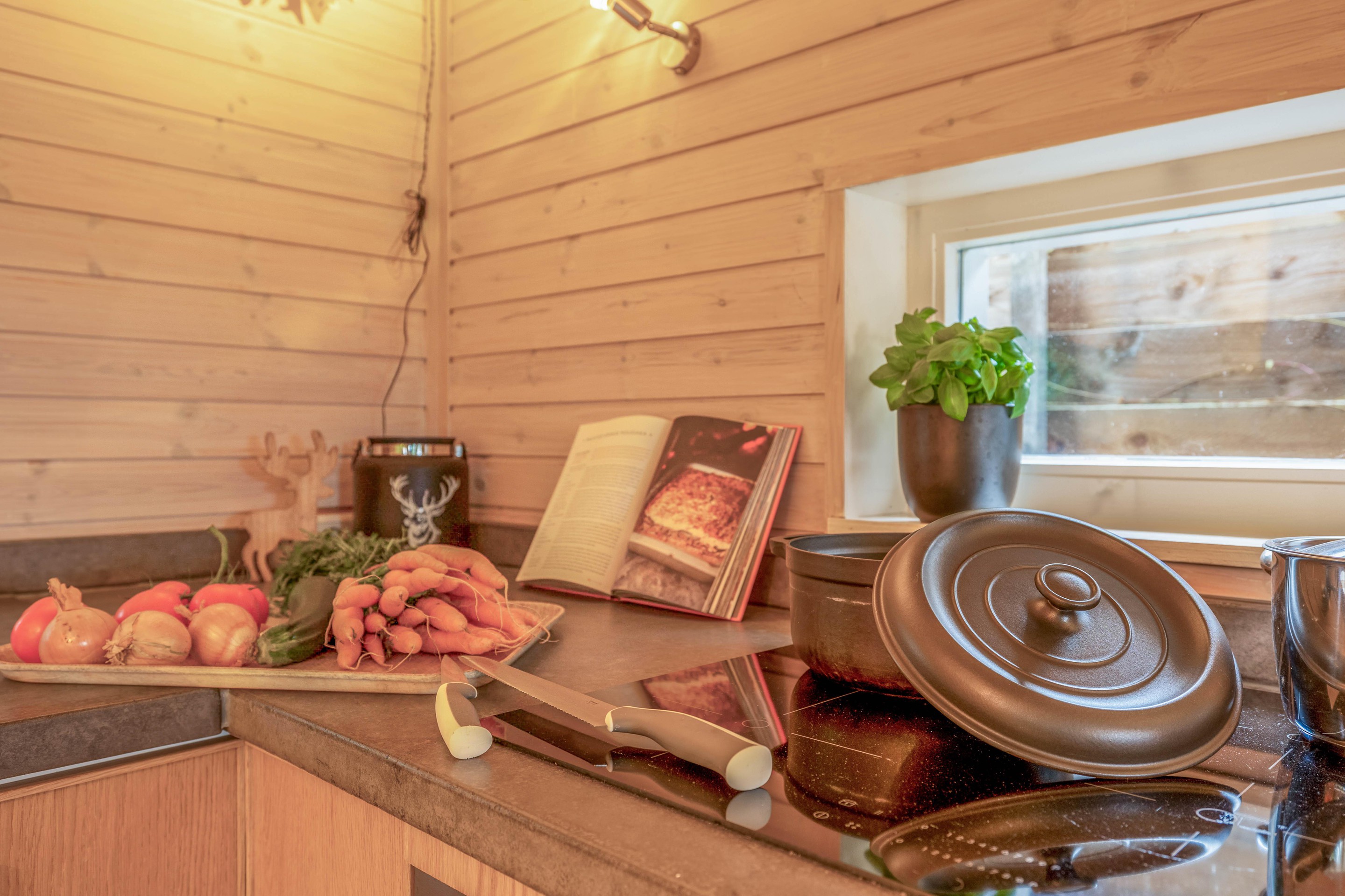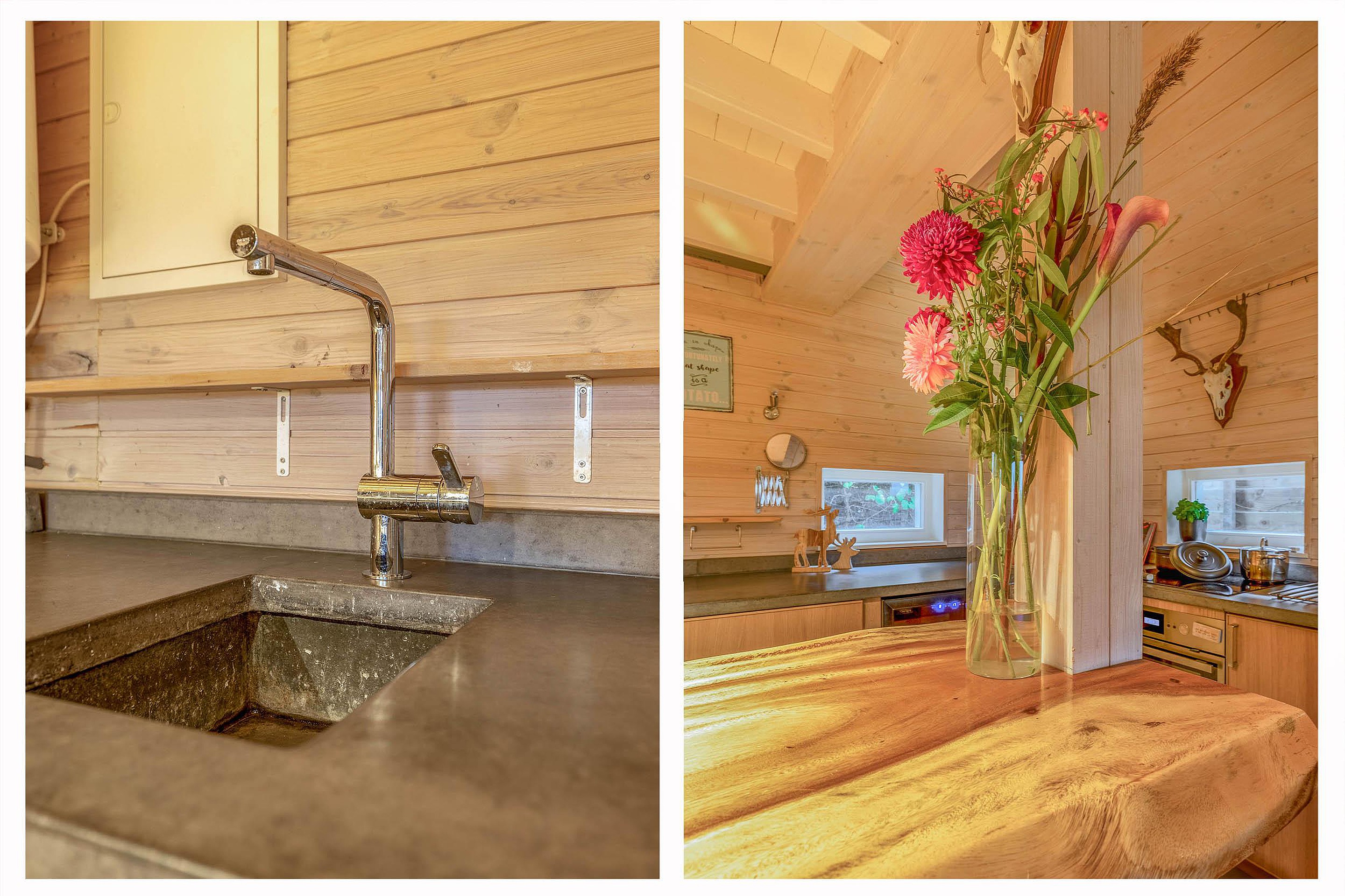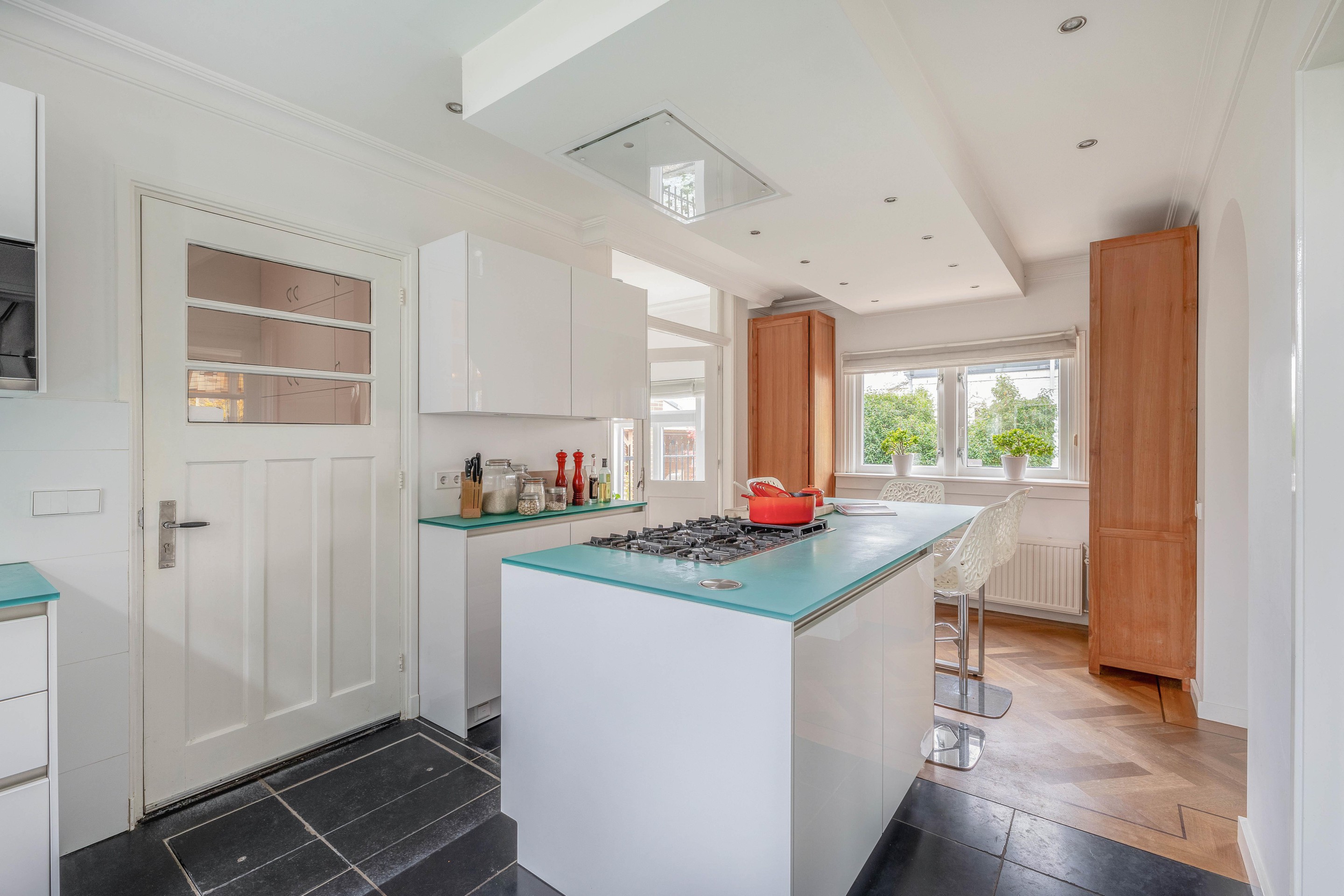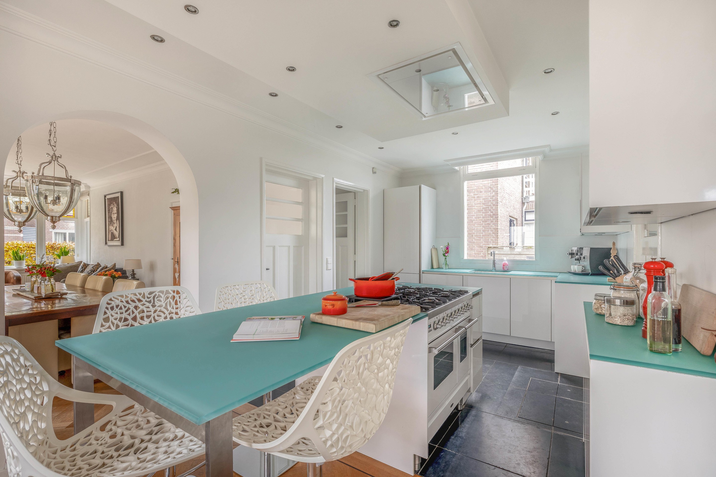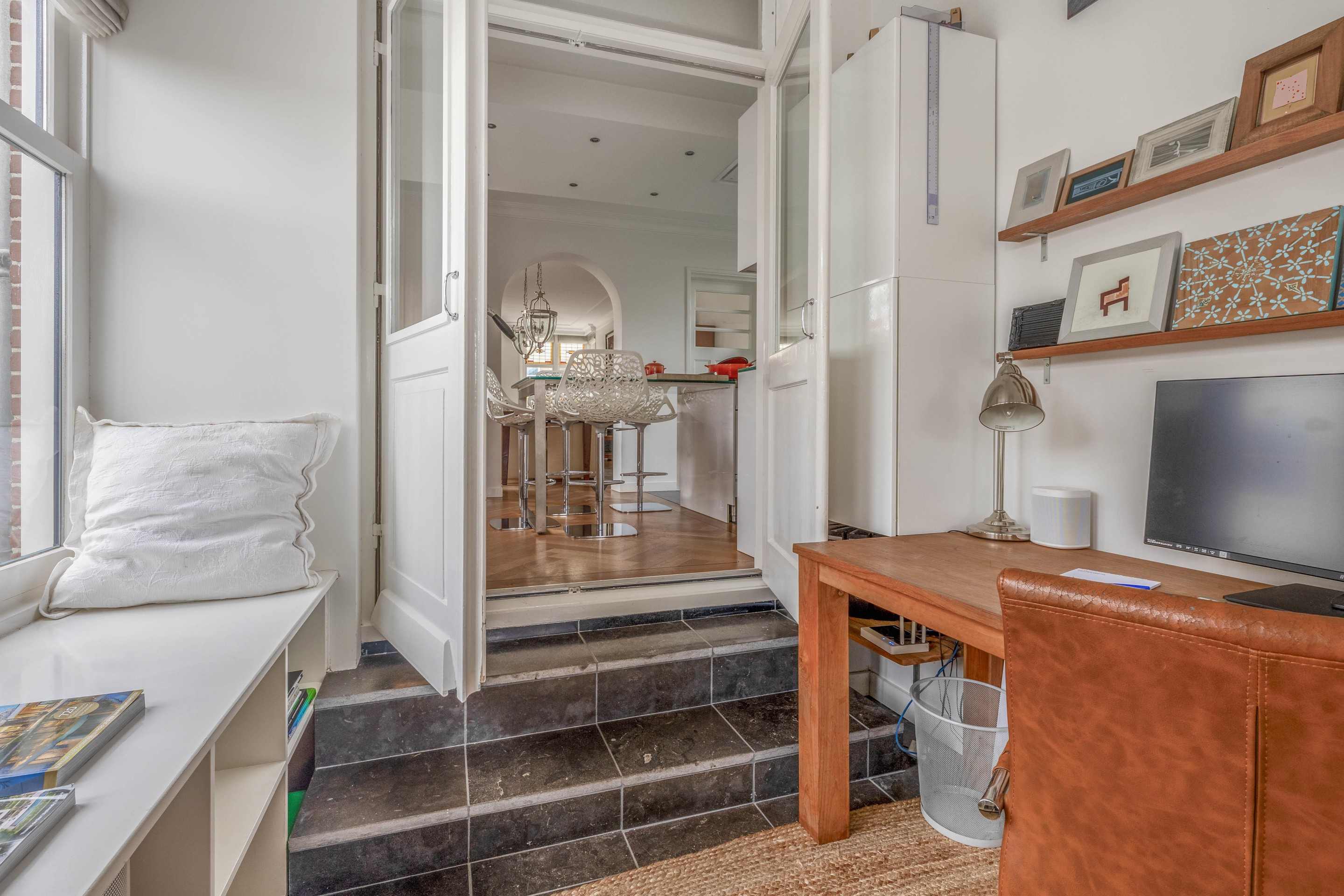 De moderne SieMatic keuken is voorzien van luxe inbouwapparatuur, waaronder een gasfornuis met dubbele oven en zes gaspitten, een Novy-afzuigkap en een vaatwasser. Het lichte glazen werkblad geeft de keuken een moderne uitstraling. Vanuit de keuken heb je toegang tot het praktische kantoor en de grote bijkeuken. Het kantoor ligt een paar treden lager dan de keuken en heeft fijn contact met het woonhuis. Dit is net wat prettiger dan een kantoor op een verdieping. Vanuit hier stap je via openslaande tuindeuren de tuin in.