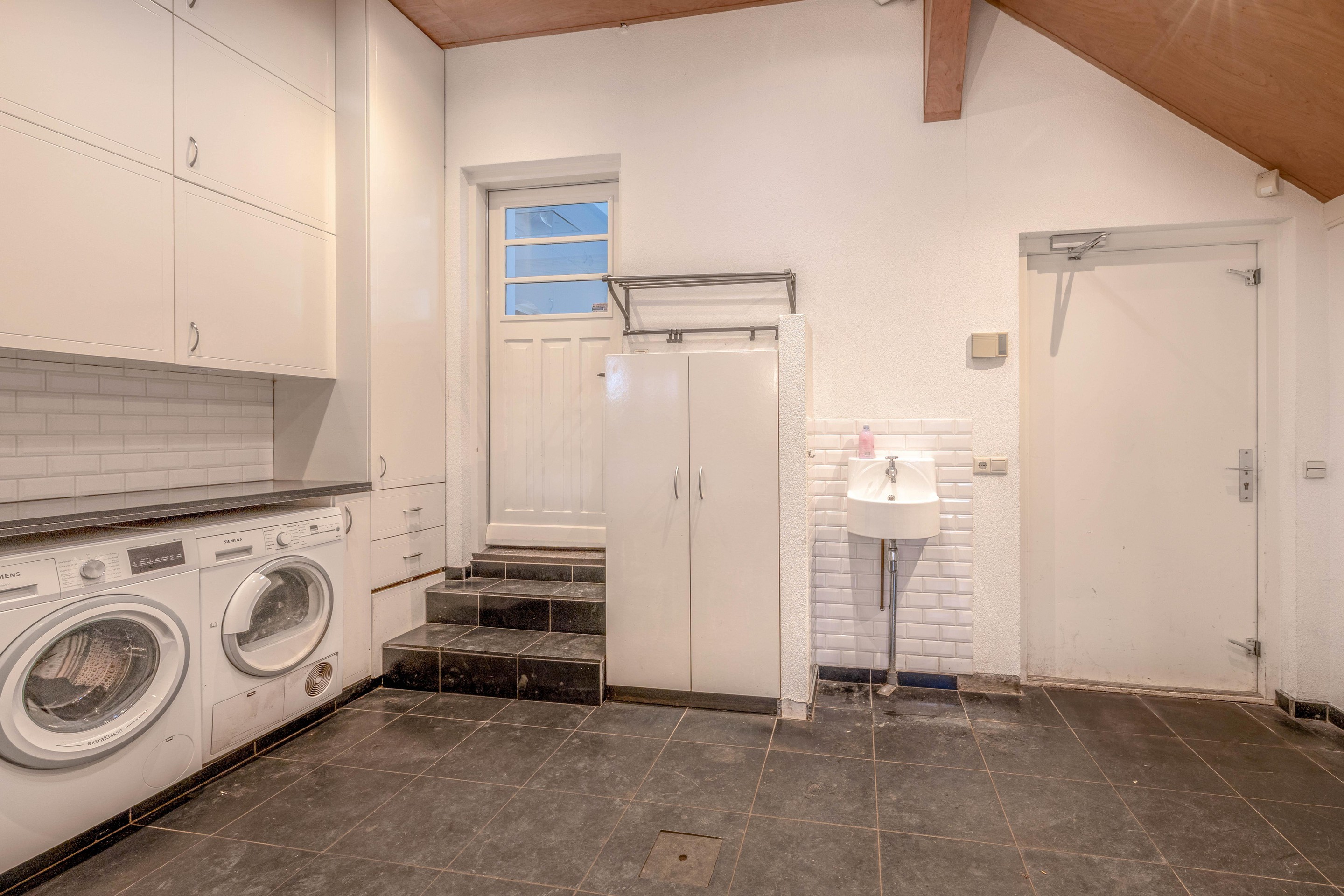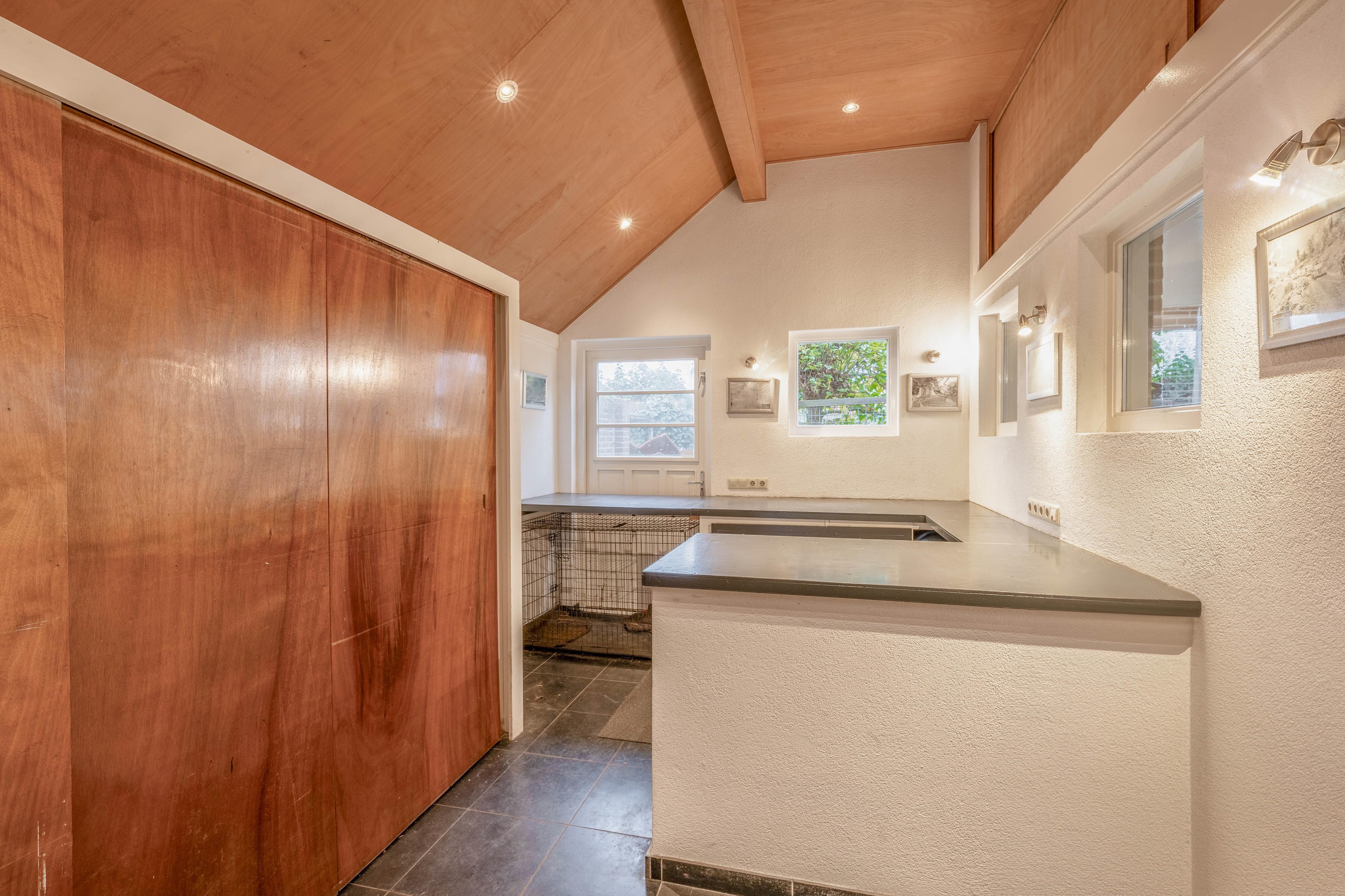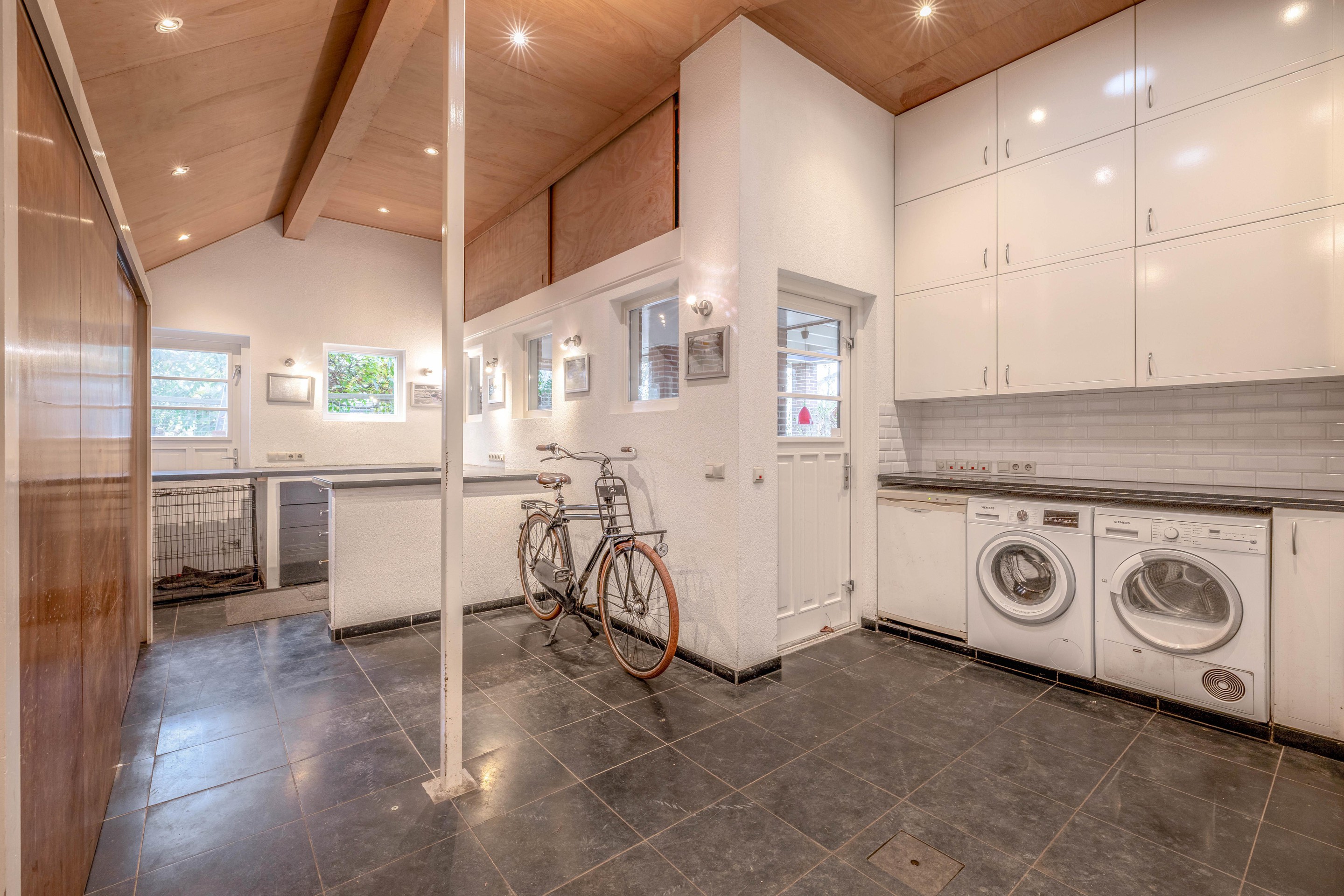 Via de bijkeuken komen we terug in de woning. De bijkeuken van maar liefst 35 m2 heeft een belangrijke functie in het huis. Het is namelijk een verlengstuk van de keuken, de opstelplaats voor de wasmachine en droger en biedt volop ruimte voor hobby’s. Ook levensloopbestendig wonen zou hier eenvoudig te realiseren zijn. Daarnaast hebben de huidige eigenaren veel opslagruimte gecreëerd langs de wand en op de bergzolder. De bijkeuken is bereikbaar vanaf de poort aan de voorzijde, vanuit de keuken en vanuit de achtertuin.