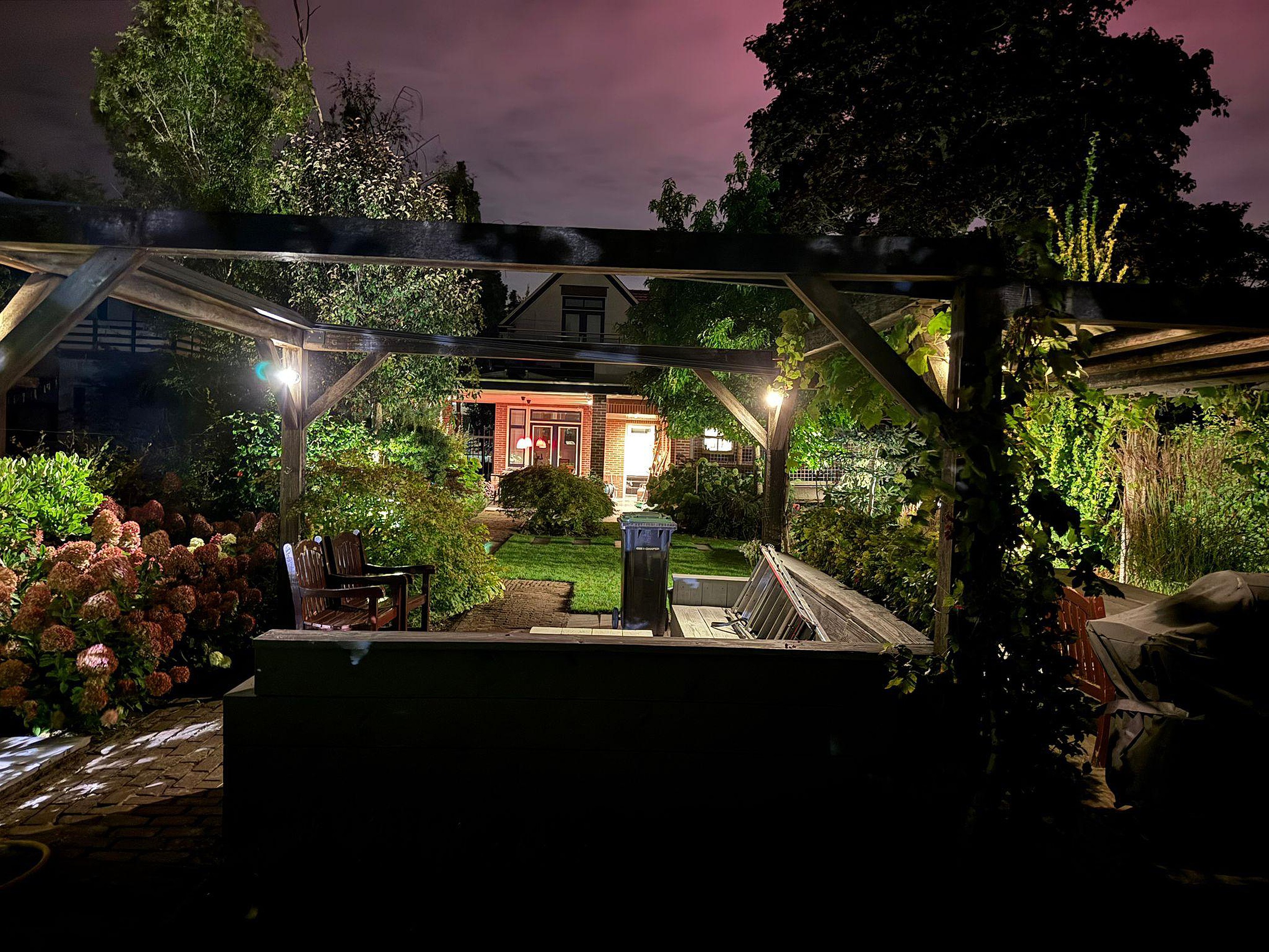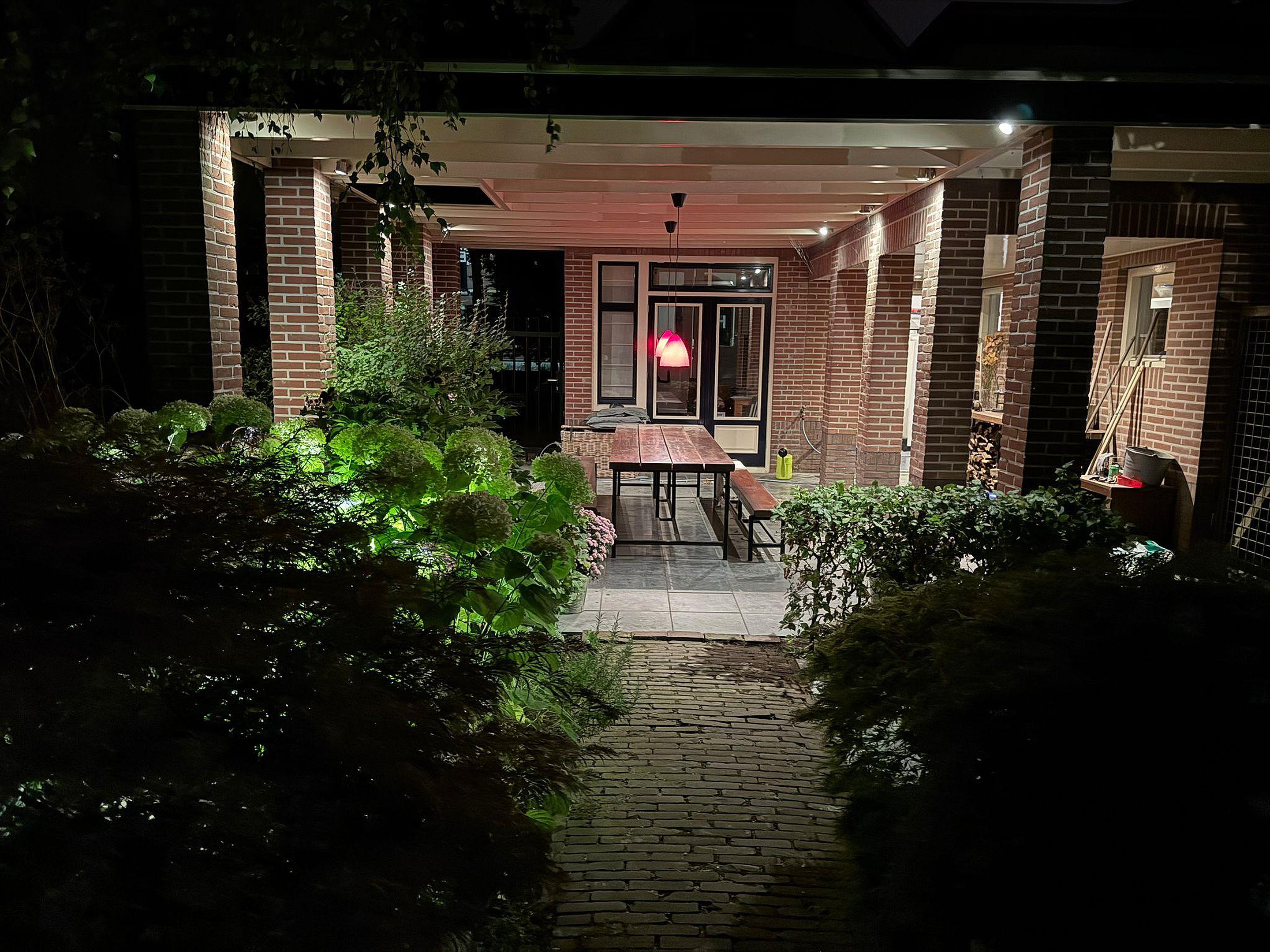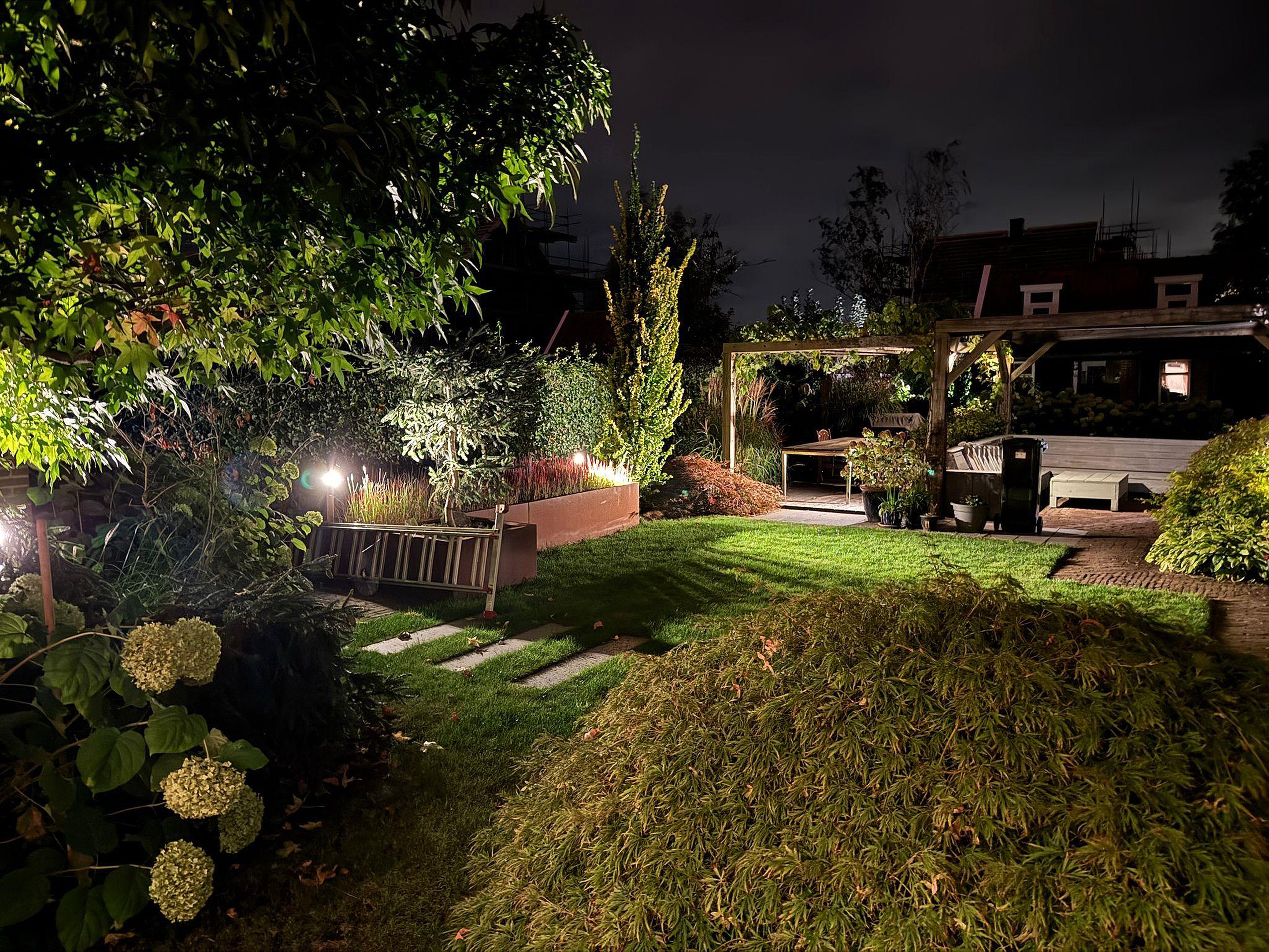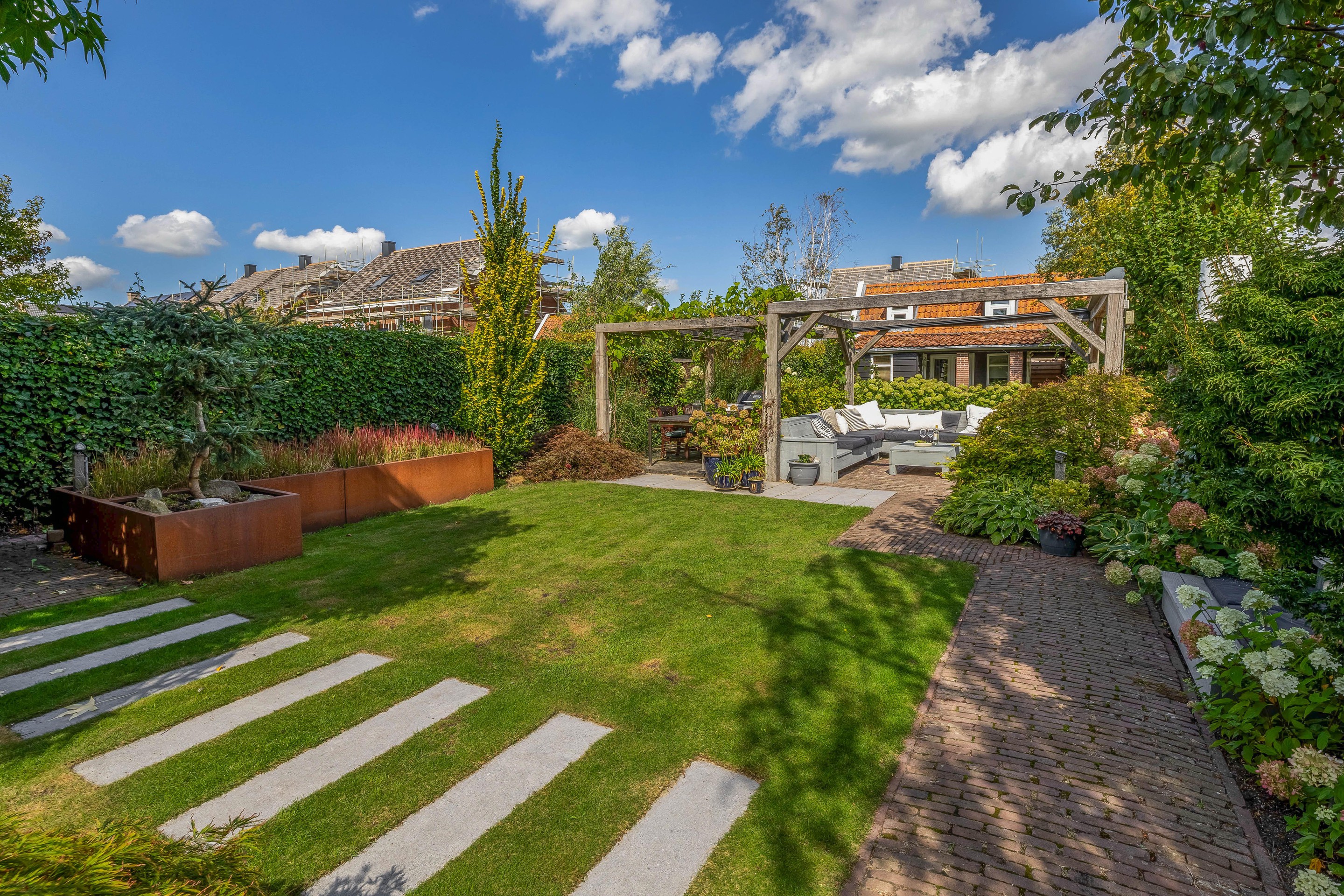 De tuin is mooi groen dankzij de vele volwassen struiken in de borders en cortenstaalbakken, en er staan enkele fraaie bomen. Tussen de twee grasveldjes is een pergola gebouwd waar je knus onder kunt zitten of eten.