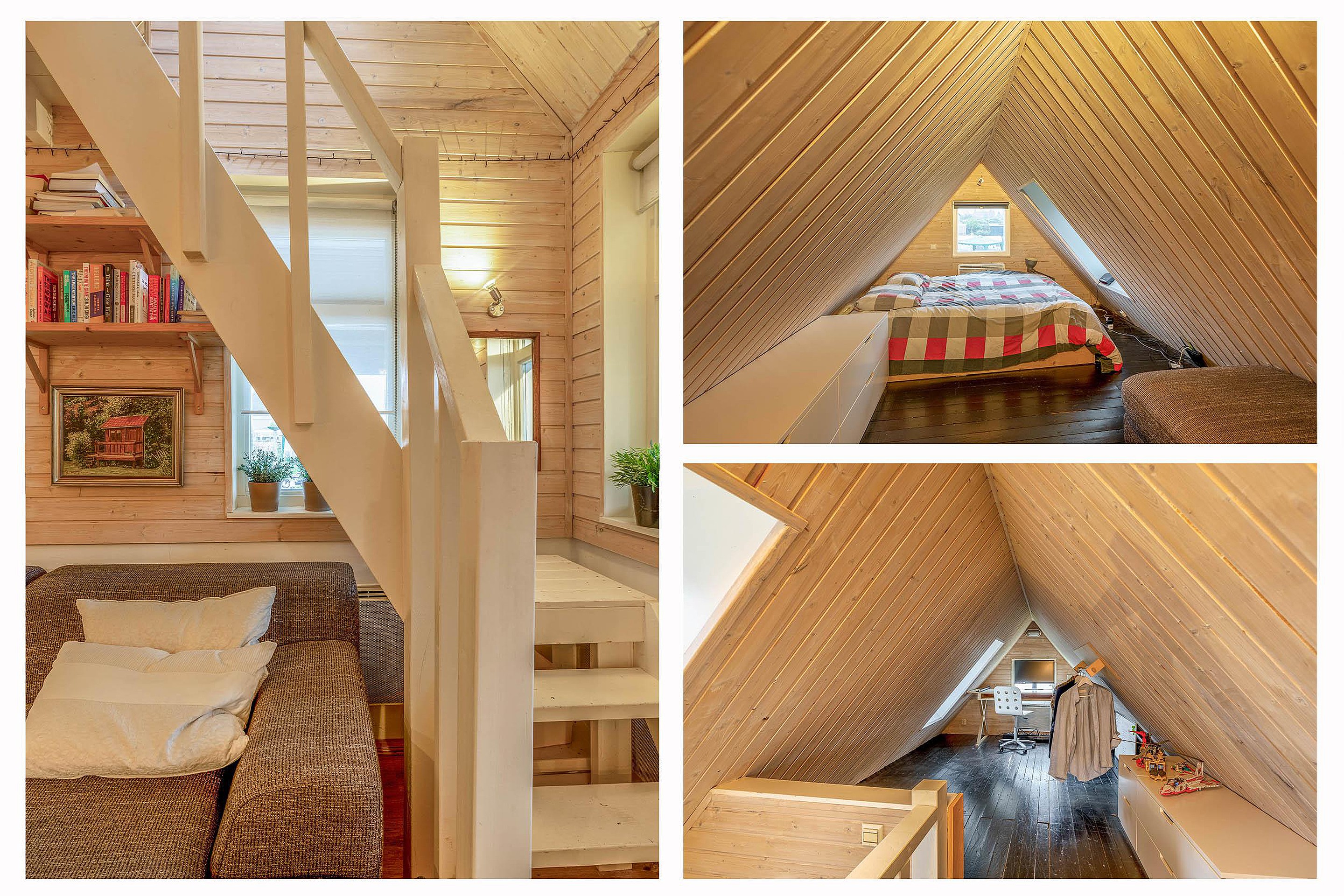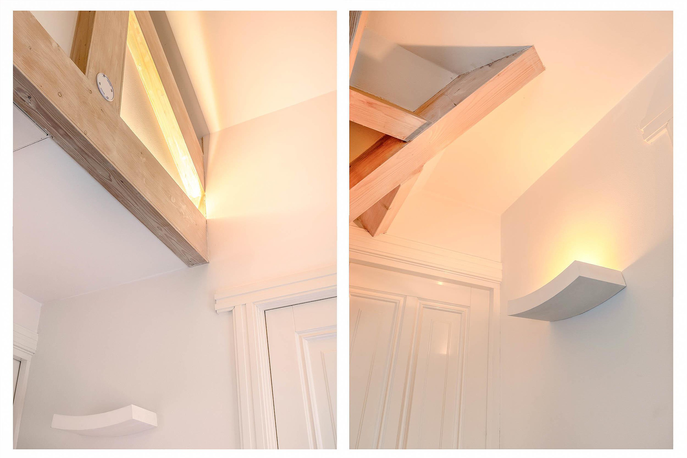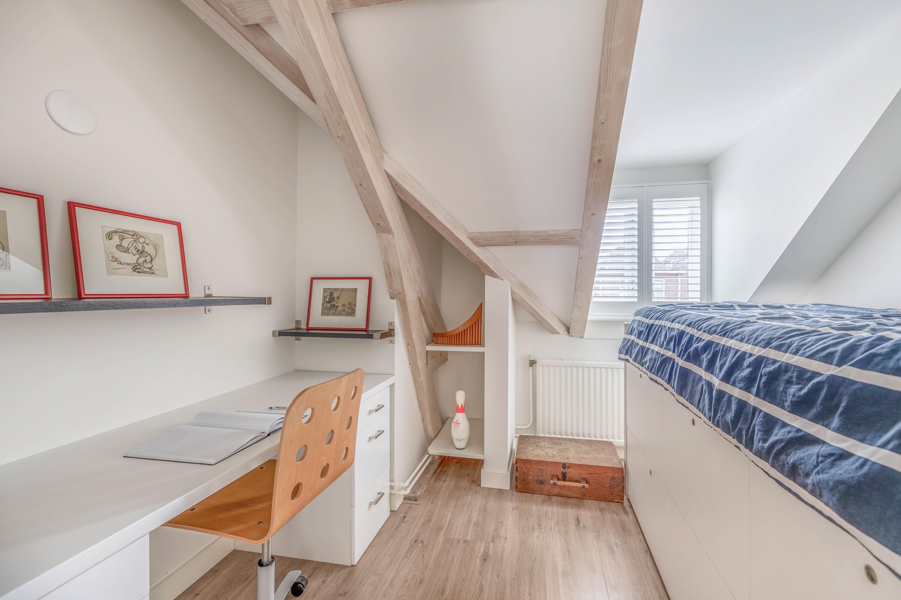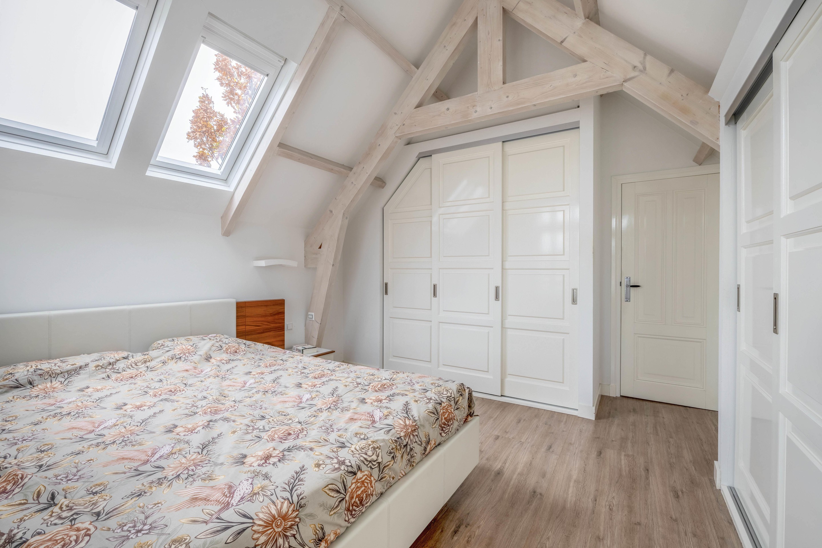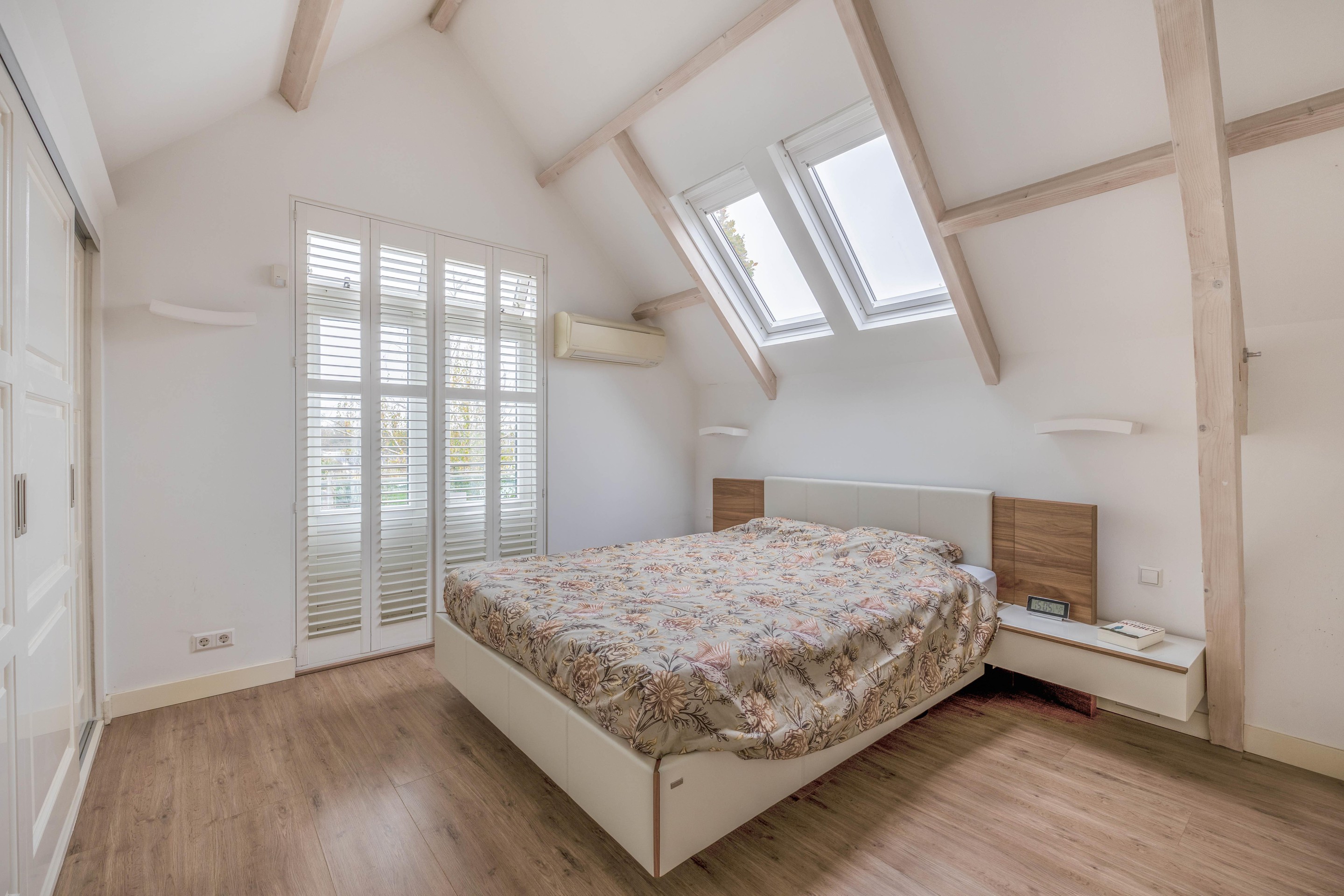 De afwerking van de overloop is doorgetrokken in de kamers. Er zijn shutters voor de ramen en deuren geplaatst en op de vloer ligt een laminaatvloer die doorloopt in alle kamers. De wanden zijn glad gestuukt. Boven het bed in de master zijn twee elektrische Veluxramen gemonteerd en er is veel bergruimte gecreëerd middels inbouwkasten met schuifdeuren.