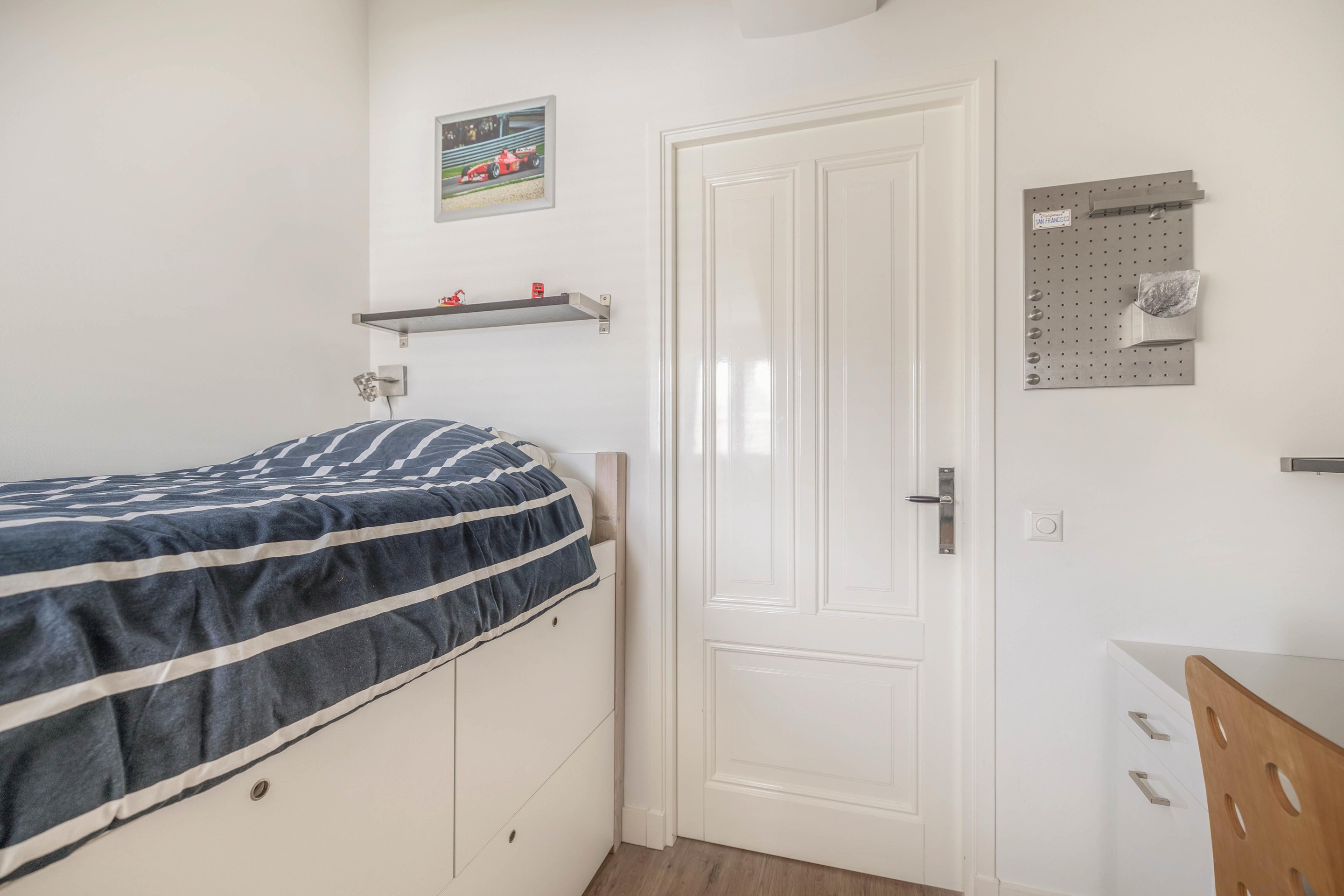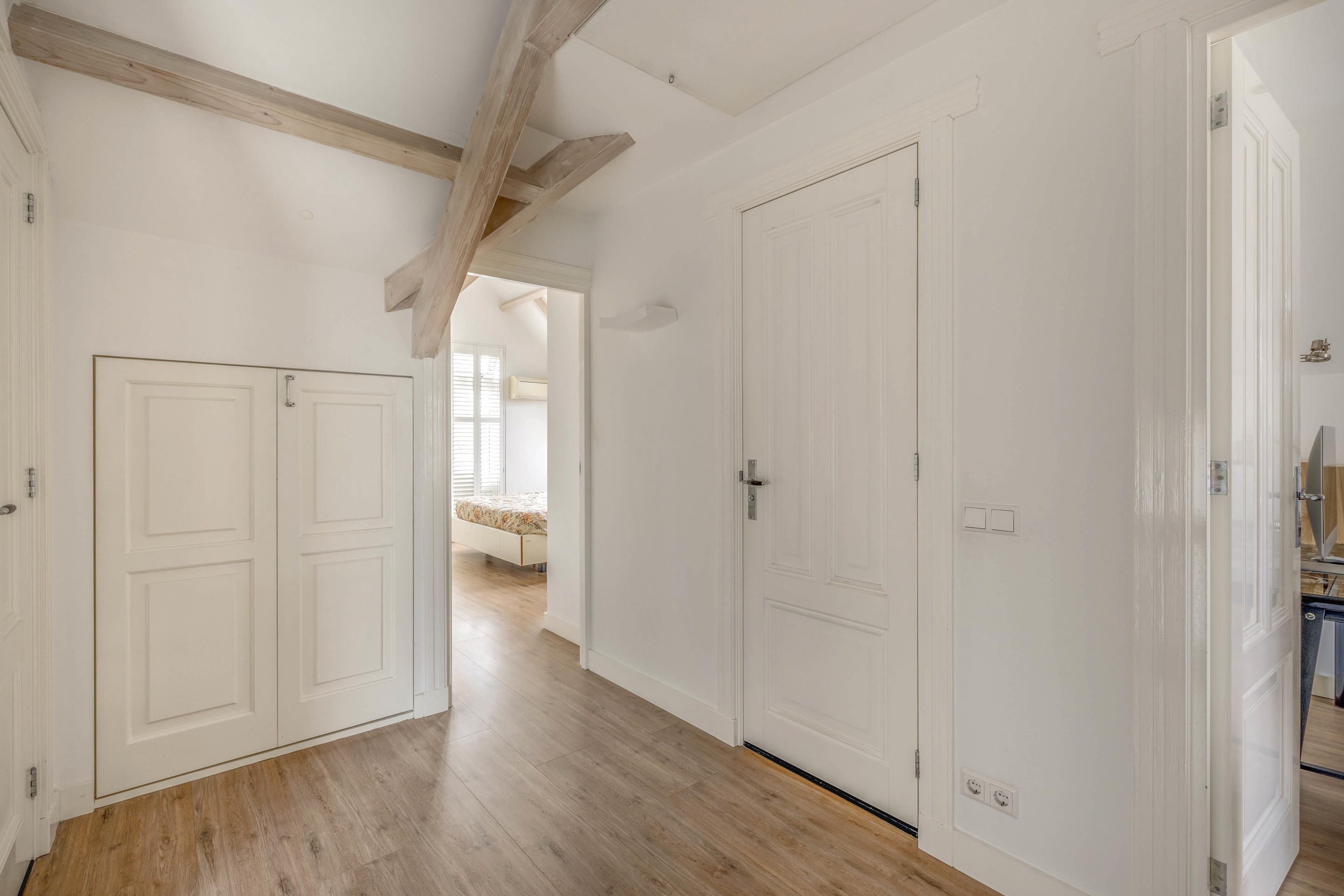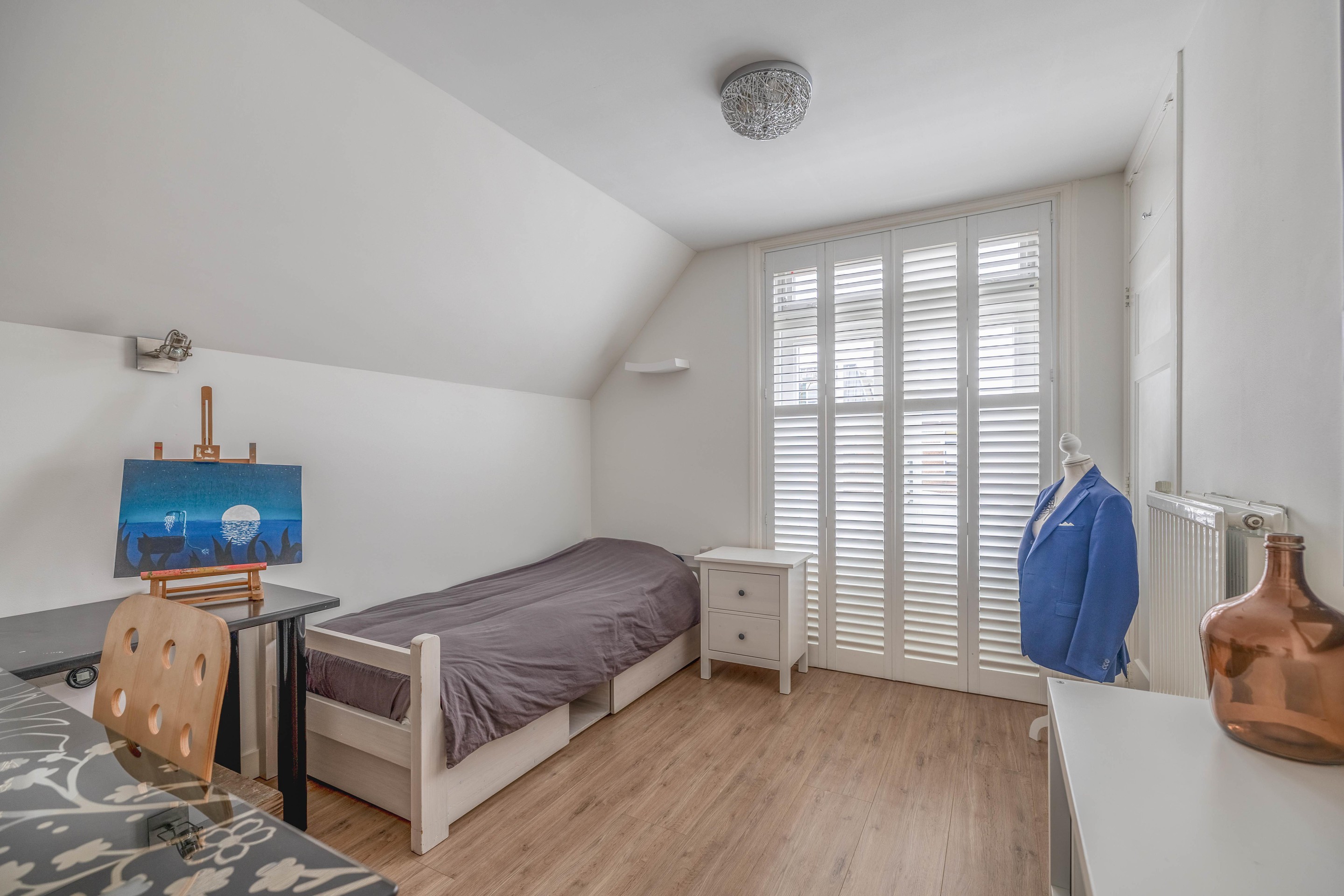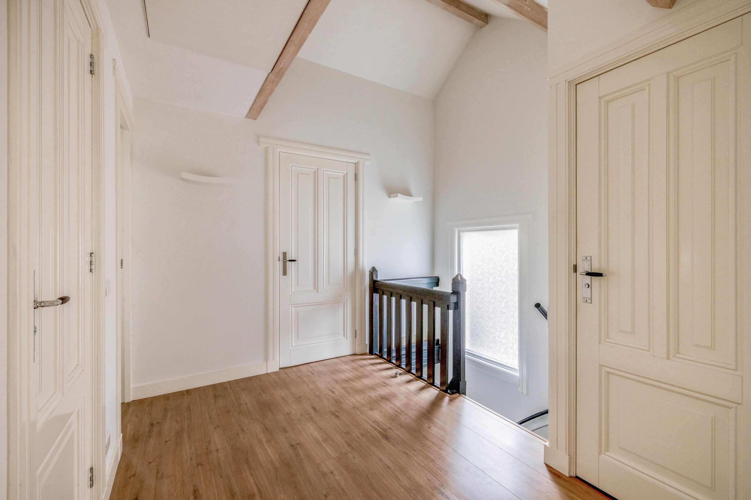 Via de vaste trap kom je op de overloop. Deze ruimte is met smaak afgewerkt en de dakconstructie is mooi in het zicht gebracht. De overloop geeft toegang tot het separate toilet, een grote kast, een luxe slaapkamer met airconditioning en dakterras, een fijne badkamer met ligbad en twee kinderkamers aan de voorzijde.