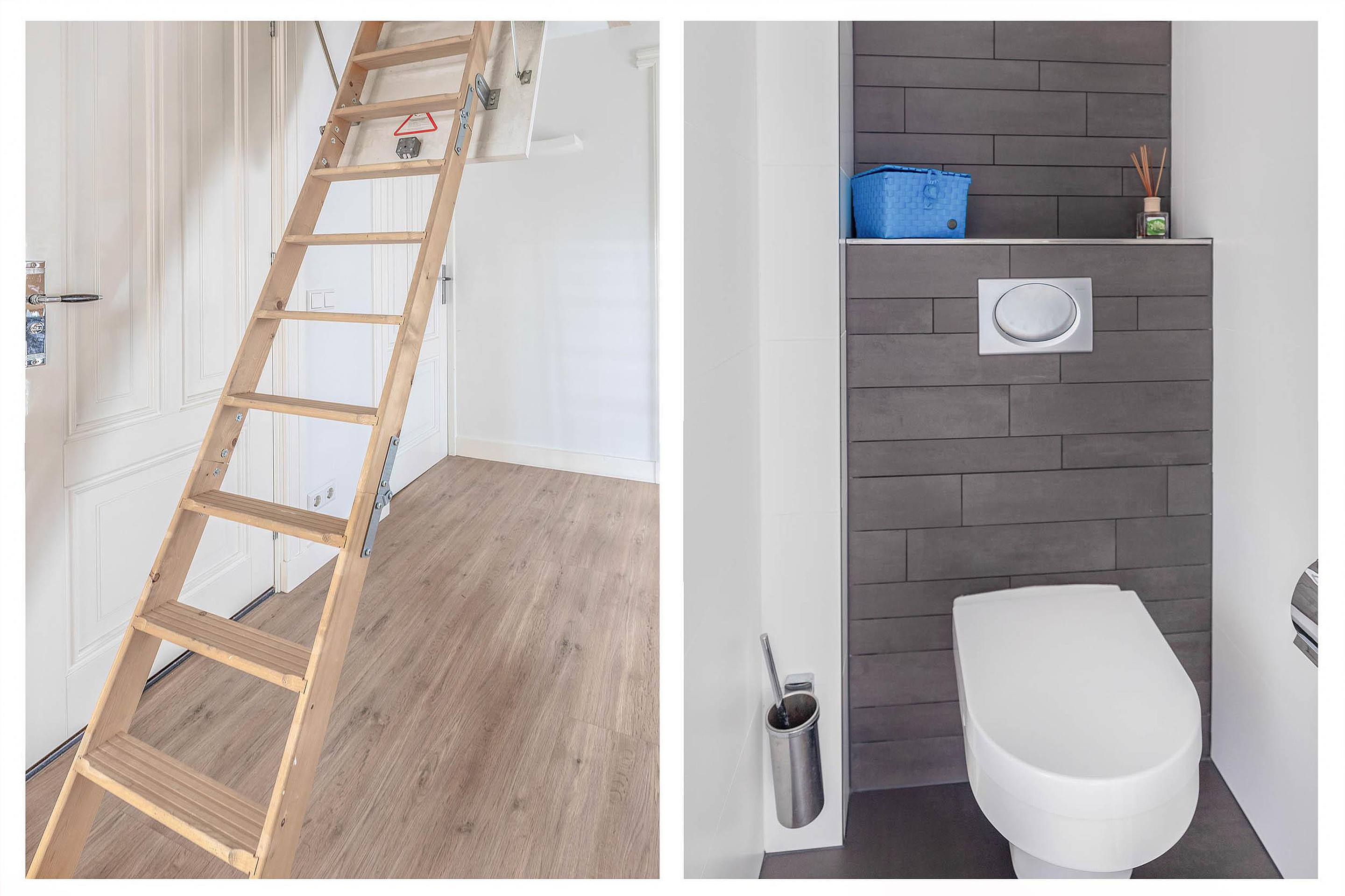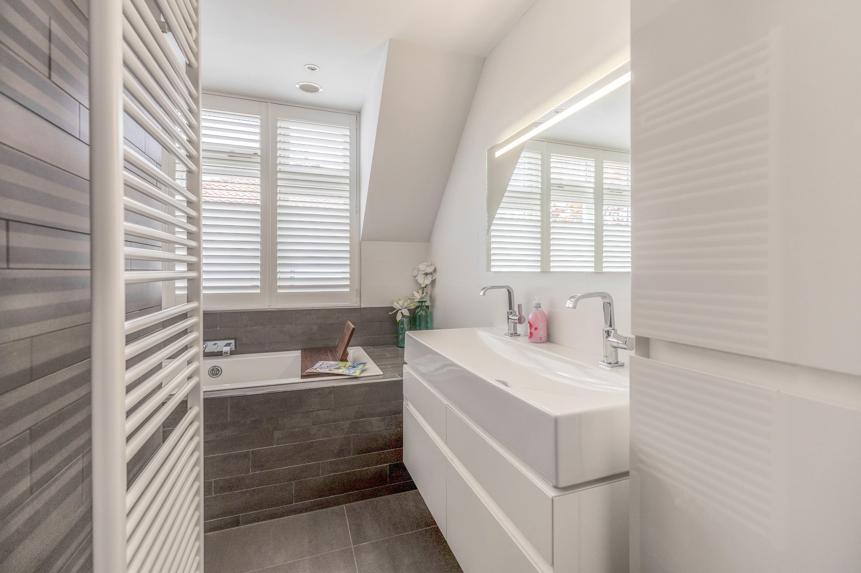 De badkamer is modern en stijlvol afgewerkt en voorzien van vloerverwarming, een ligbad en een inloopdouche. De toiletruimte is gelijkwaardig afgewerkt. Via een vlizotrap bereik je de ruime bergvliering.