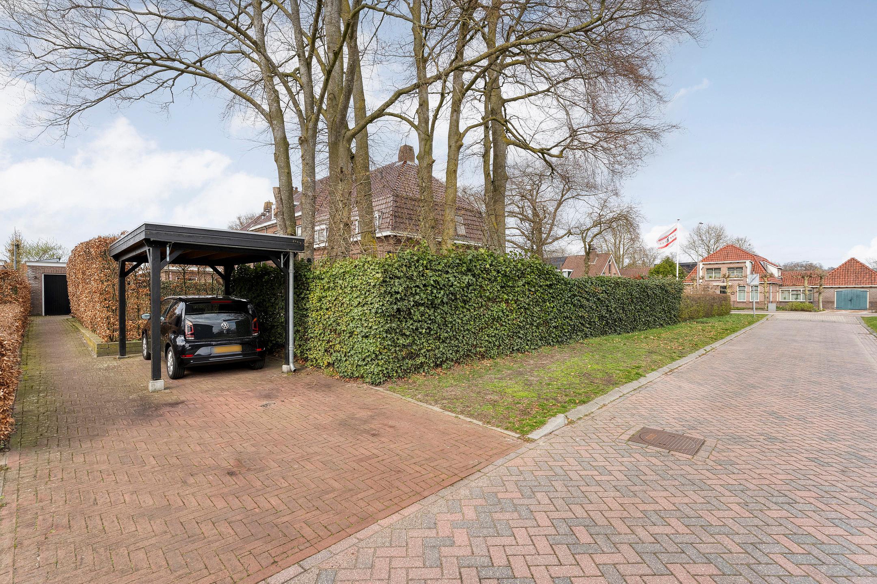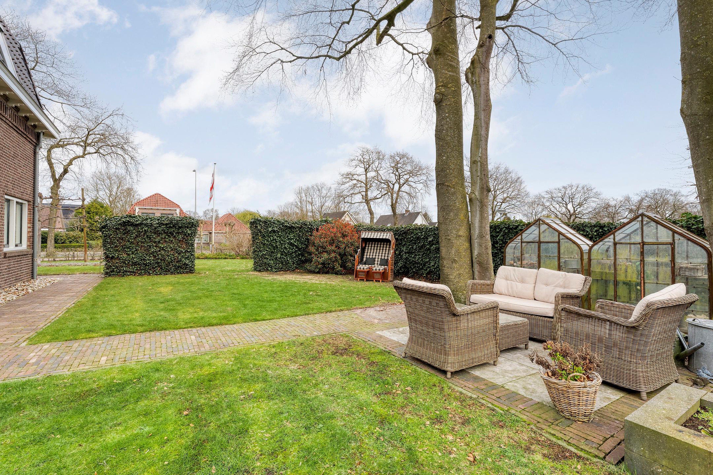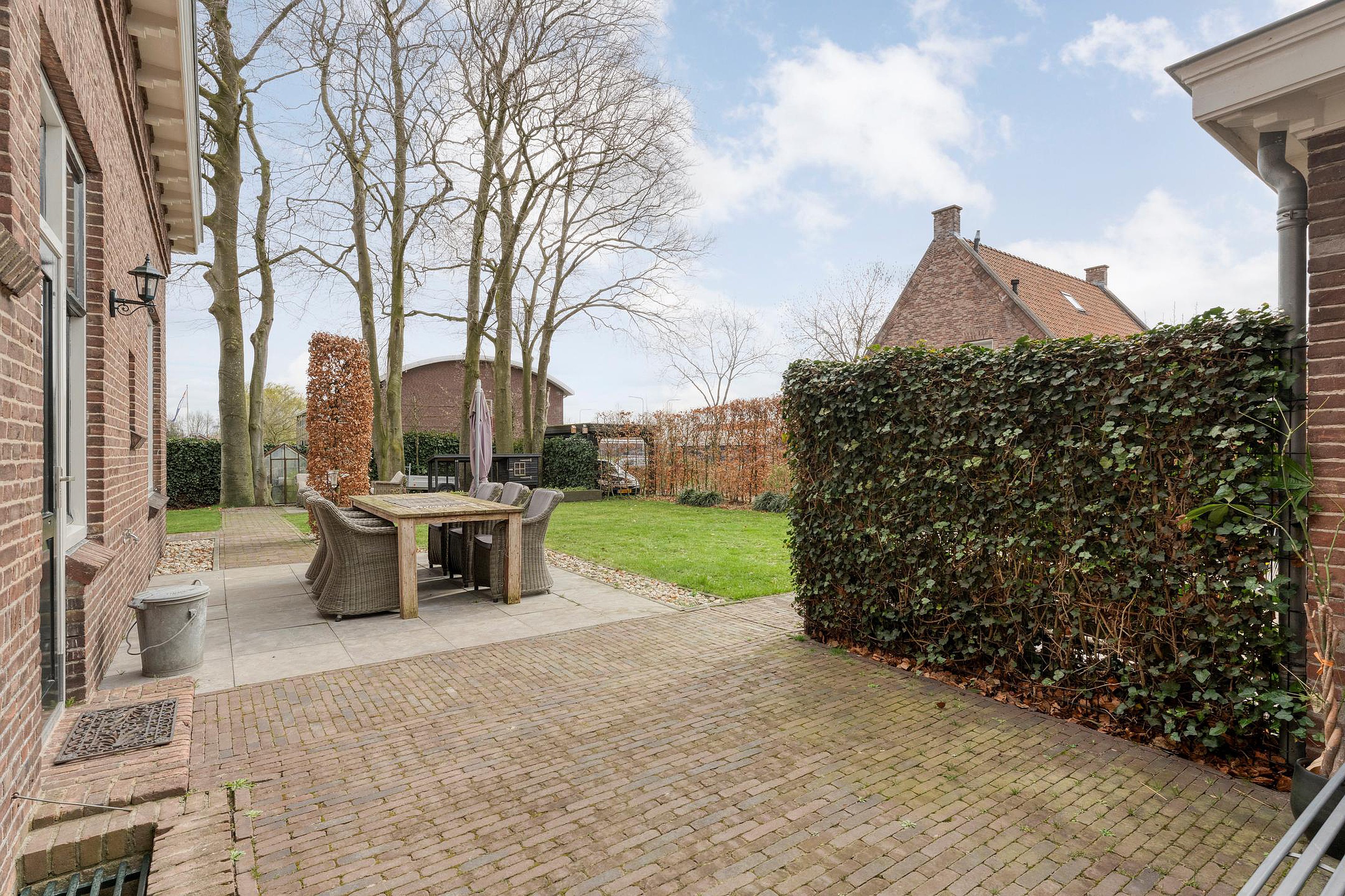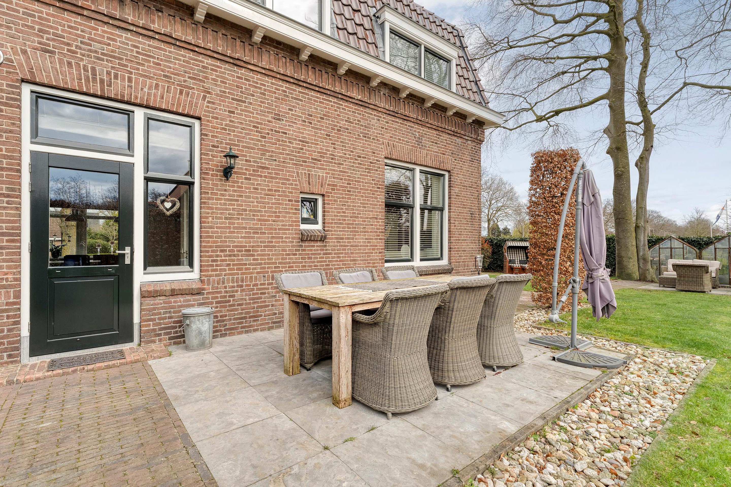 Vrijstaande geïsoleerde garage, sfeervolle tuin rondom met meerdere terrassen, oude hek van de marechaussee, meerdere opritten voor auto’s en een carport.
