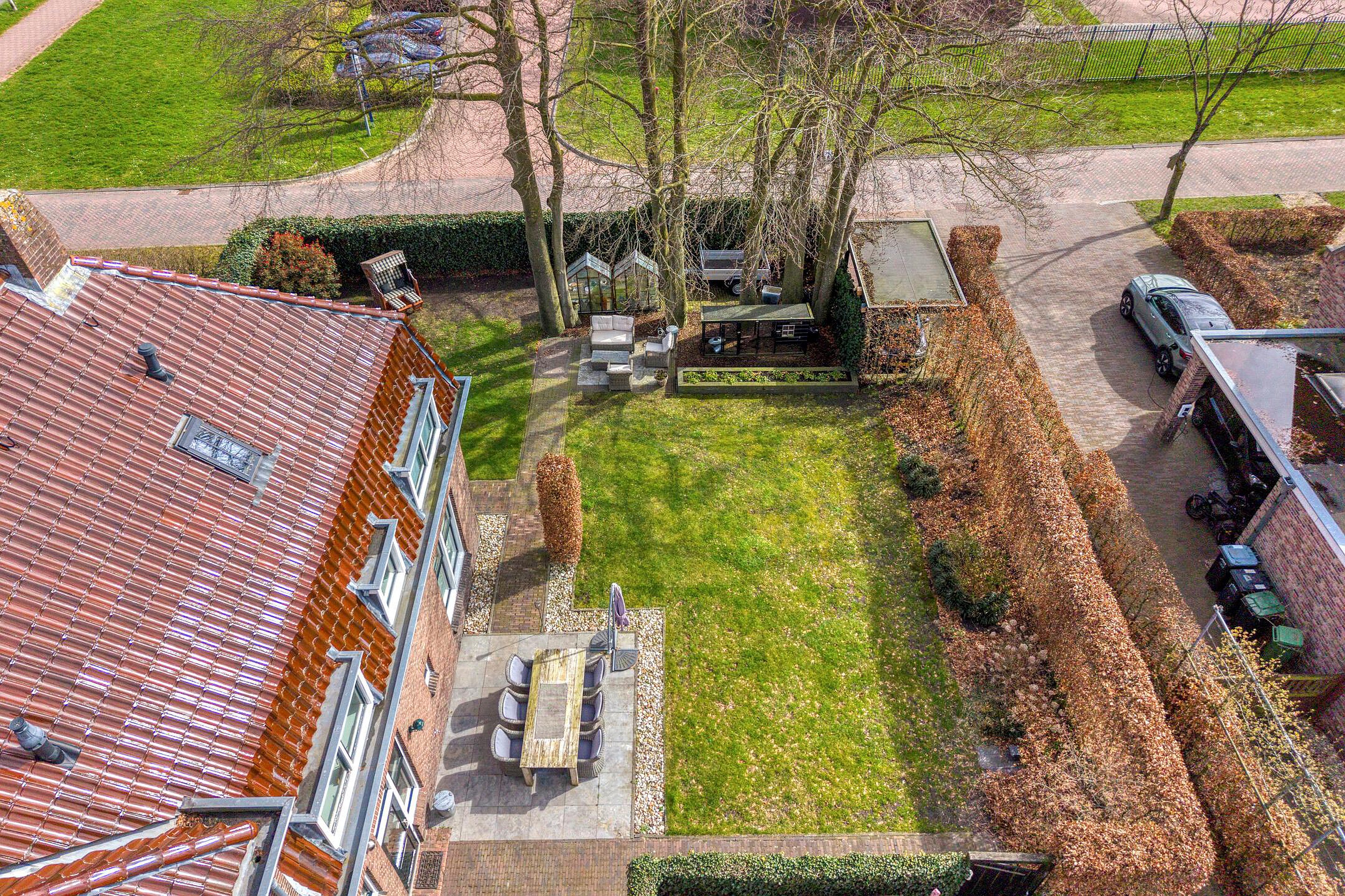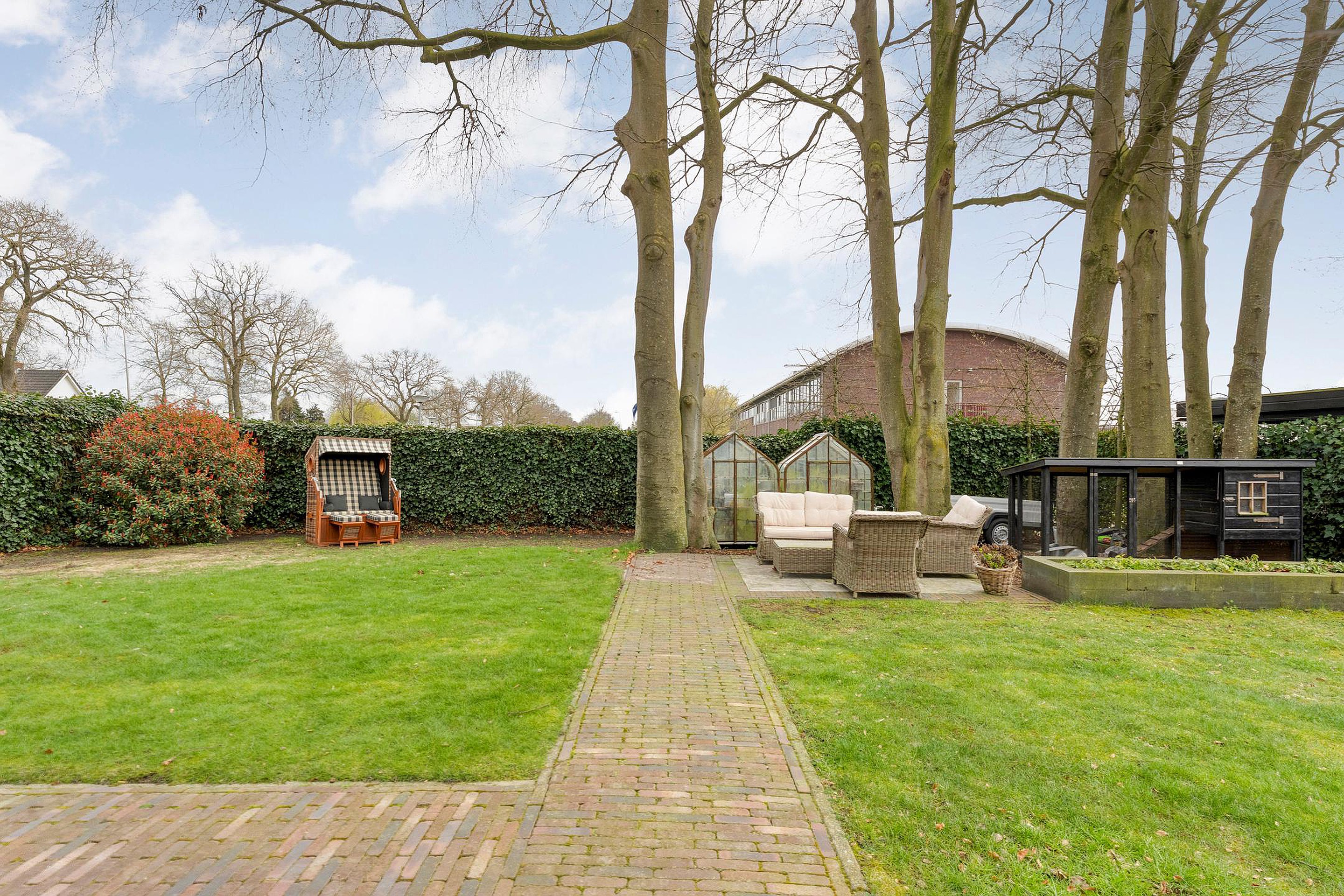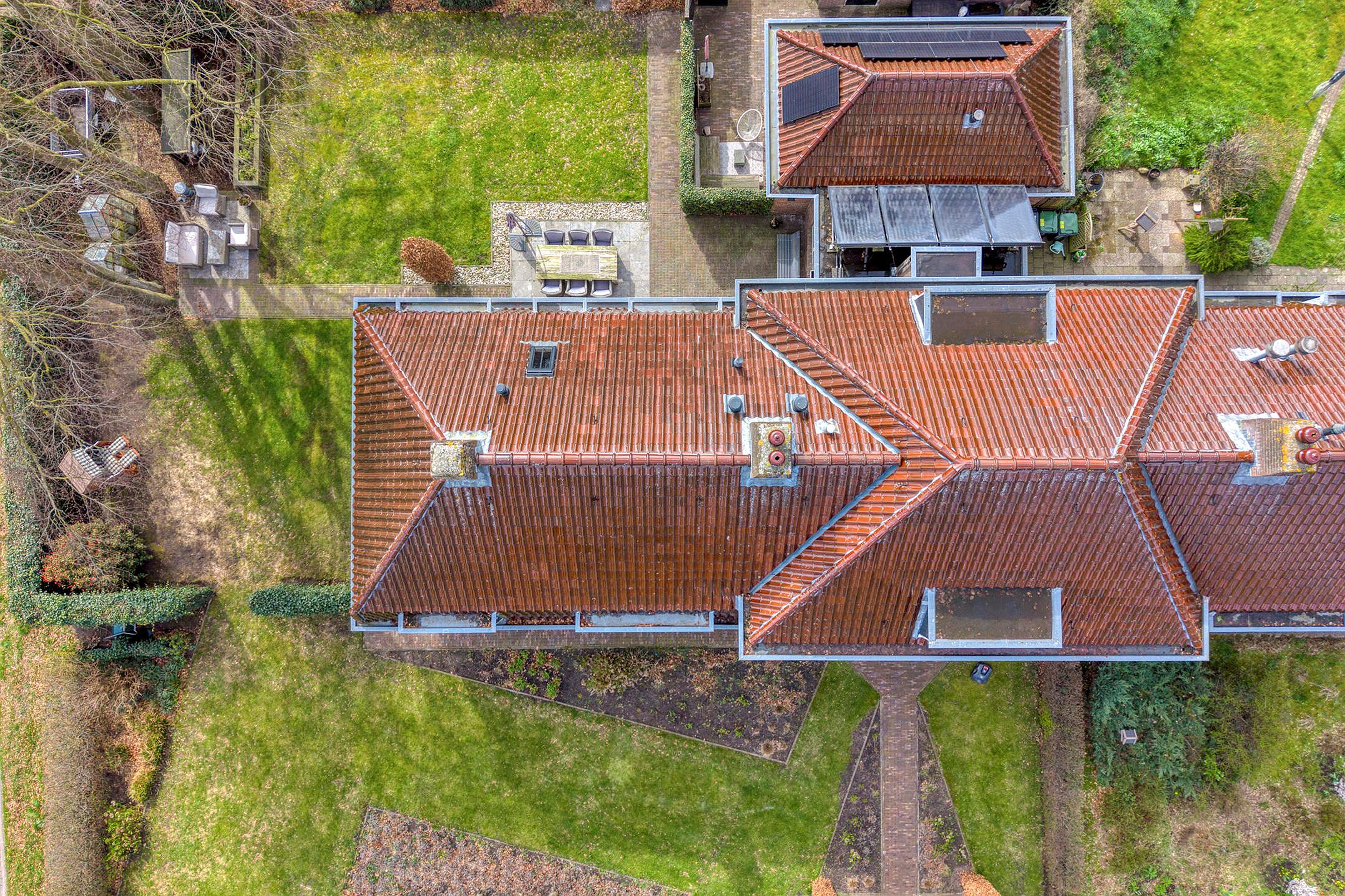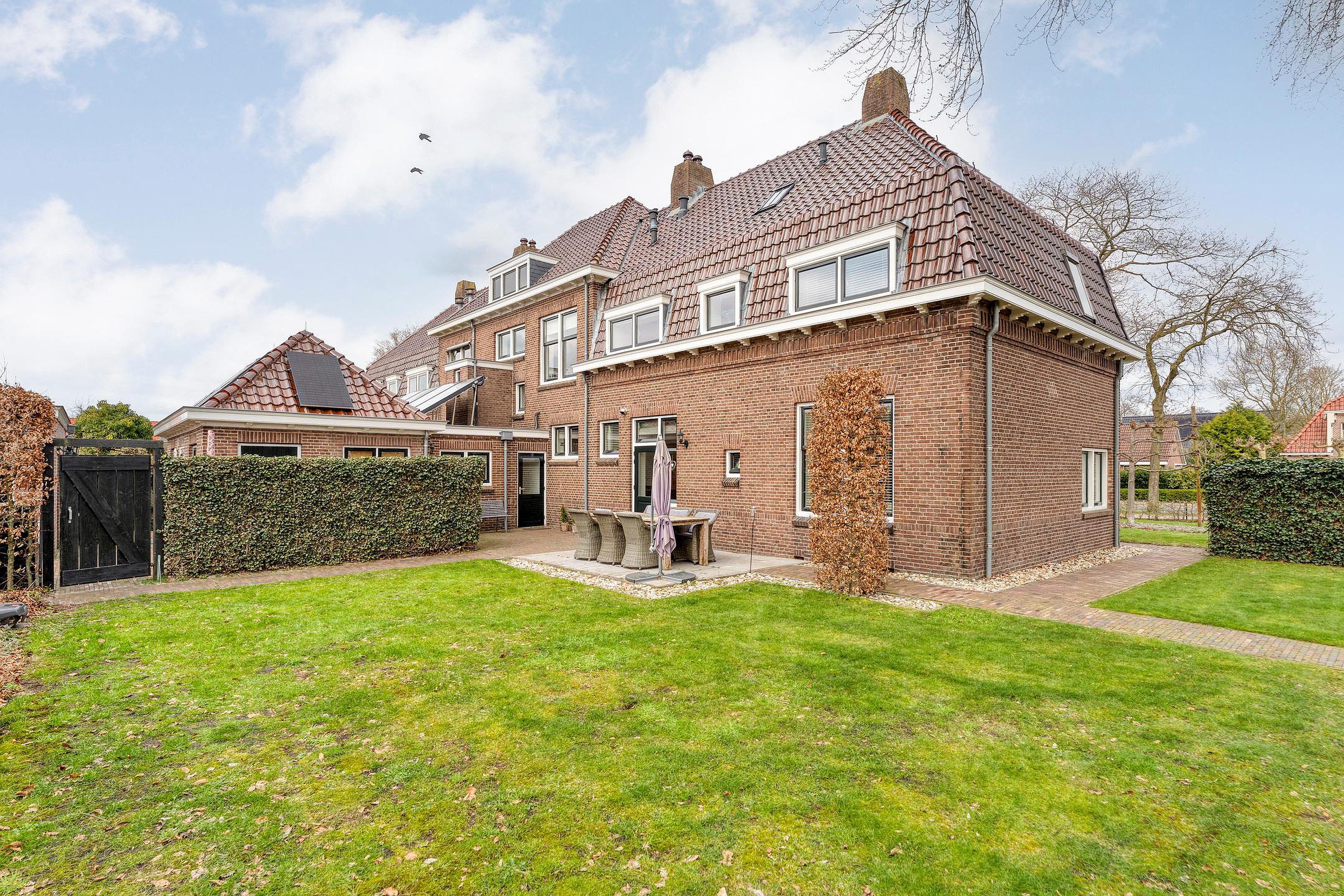 Vrijstaande geïsoleerde garage, sfeervolle tuin rondom met meerdere terrassen, oude hek van de marechaussee, meerdere opritten voor auto’s en een carport.
